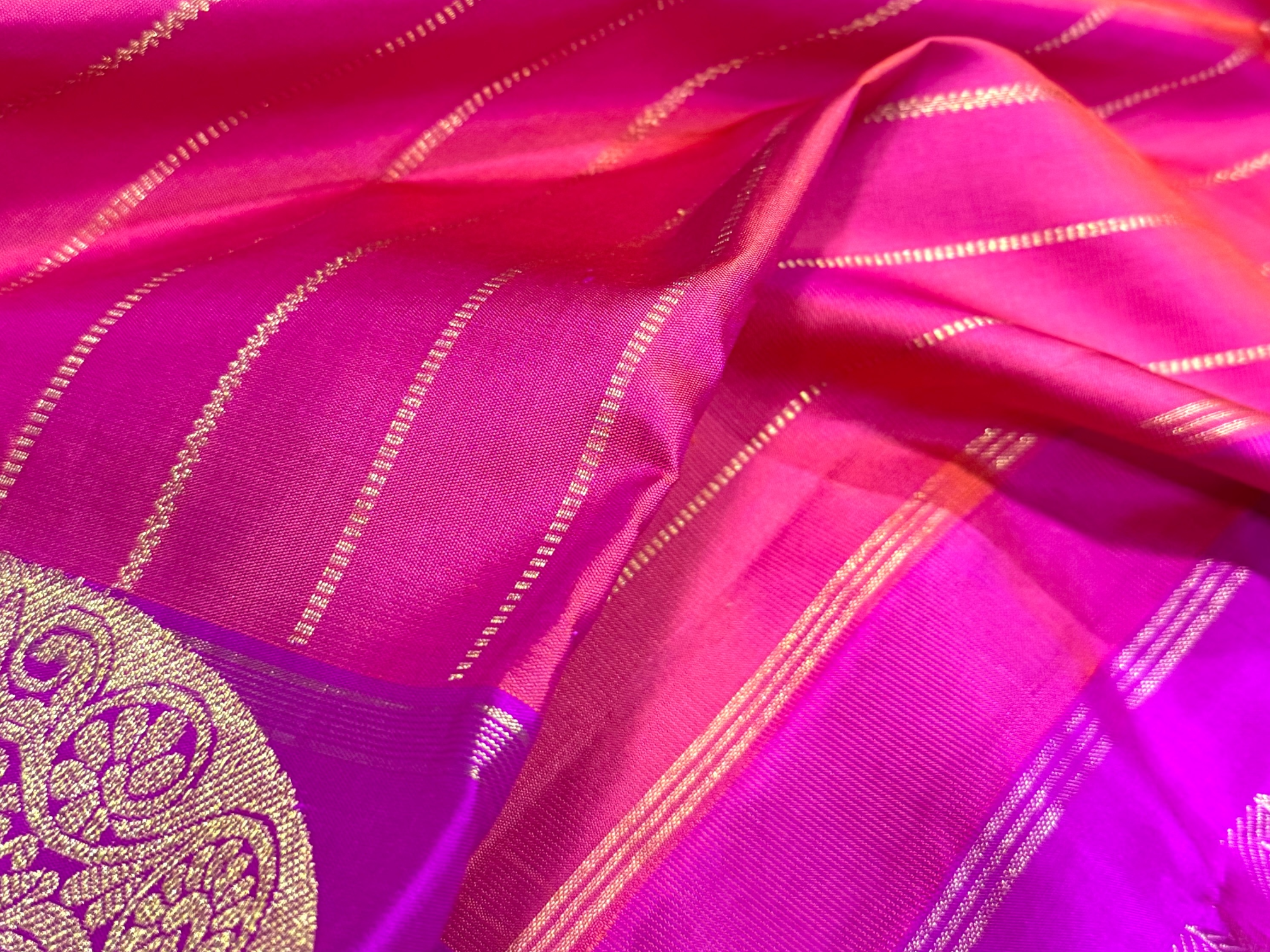 Dual Tone Pinkish Orange Pure Kanjivaram Silk Saree With Contrast Dark Brown Border