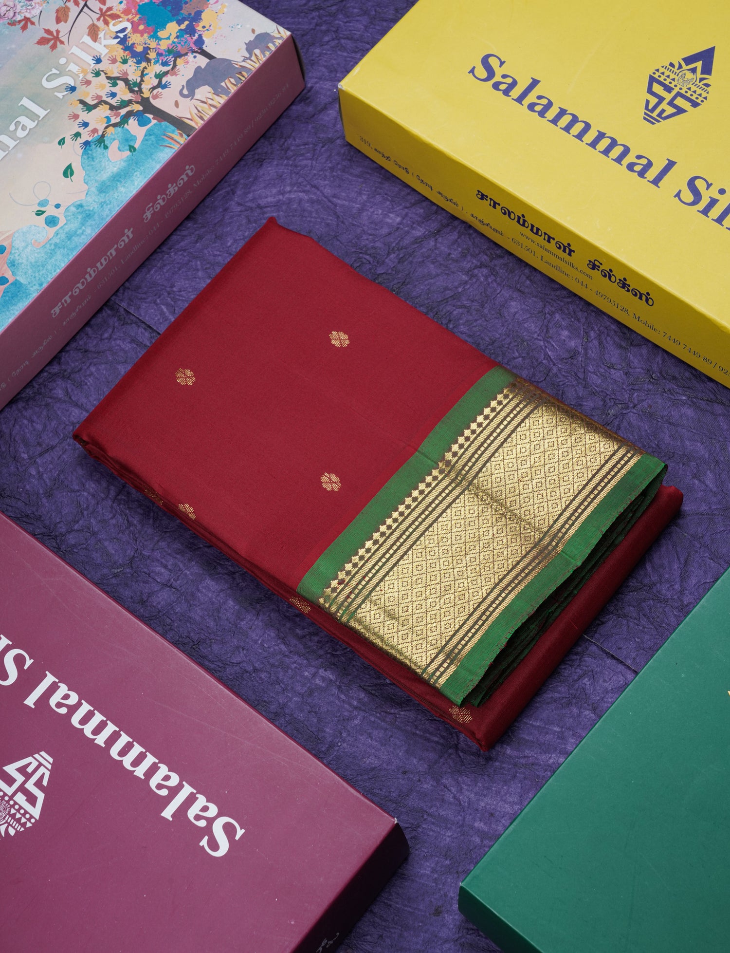 Maroon Pure Kanjivaram Silk Saree With Contrast Green One Side Border