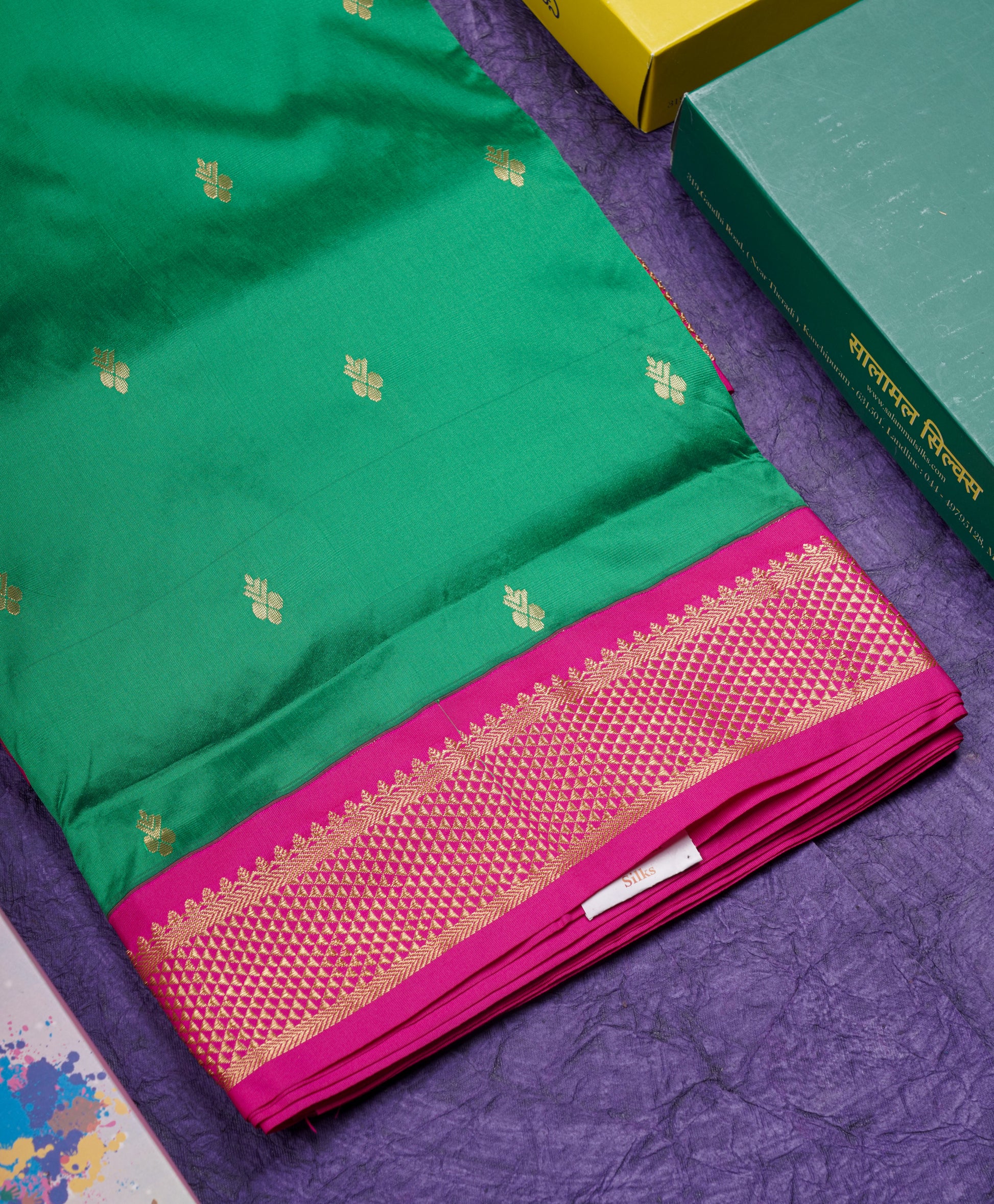 11 Yards Green Semi Silk Saree with Contrast Pink Border