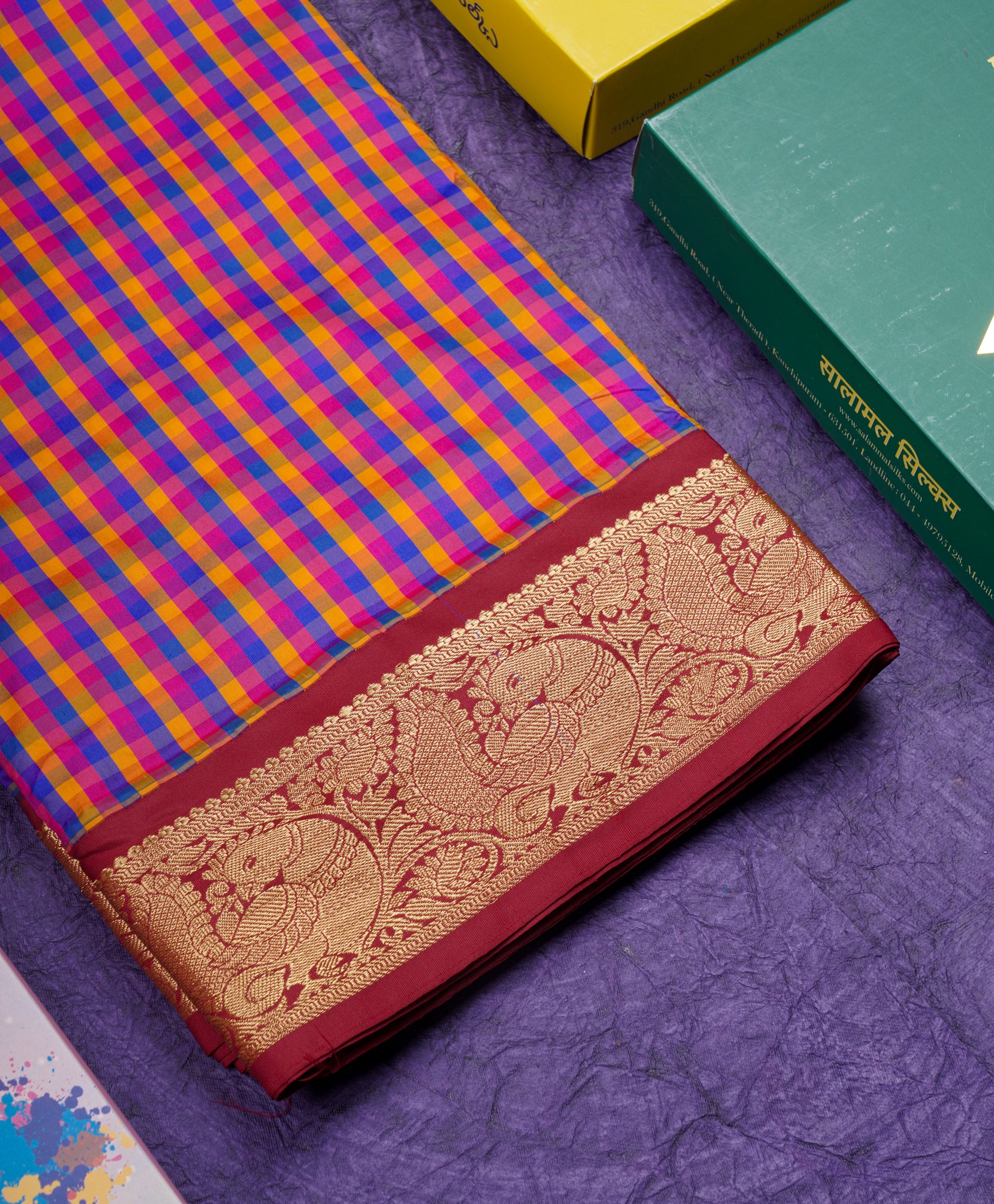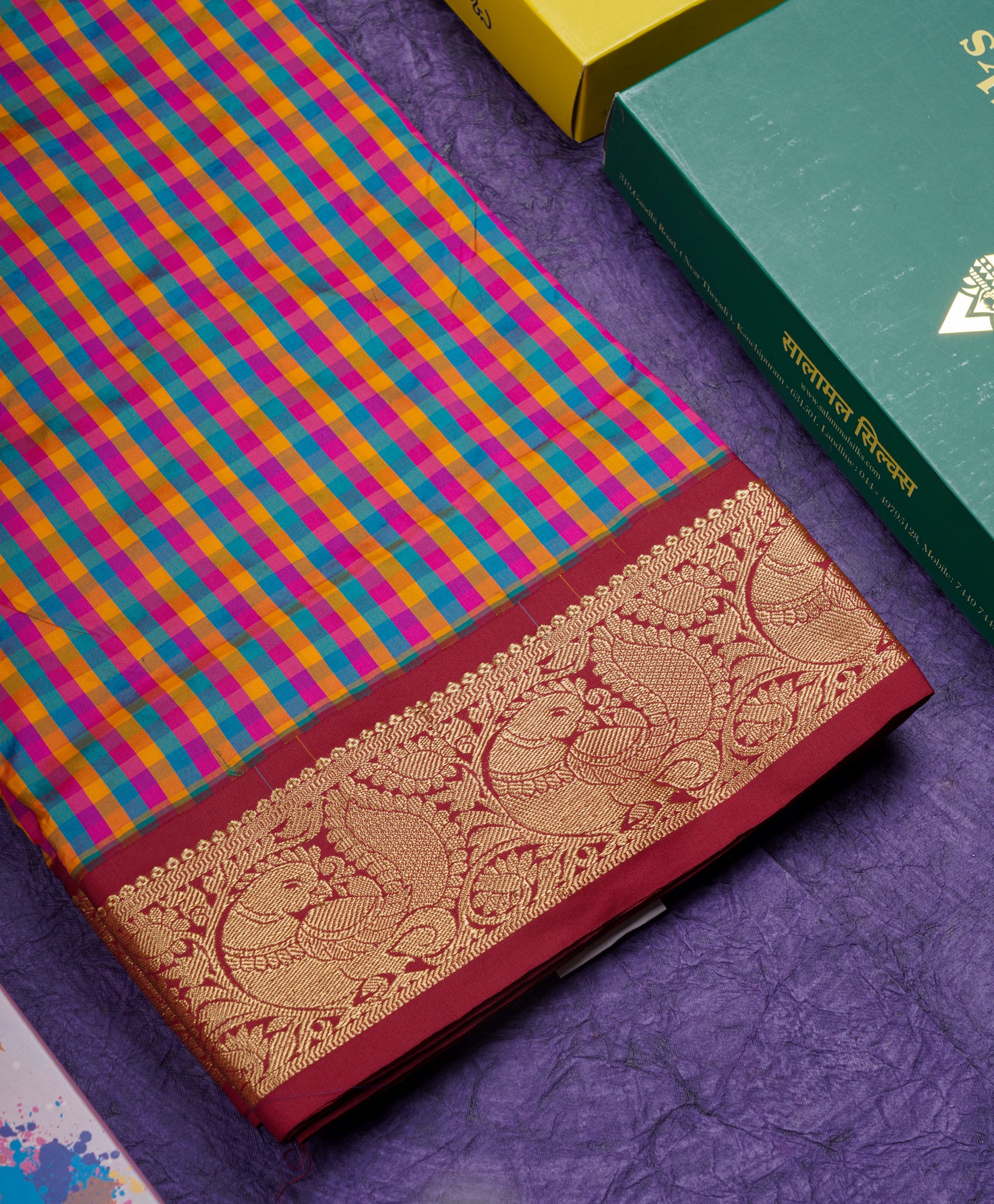11 Yards Semi Silk Saree Multicolour Checks with Contrast Traditional Maroon Border