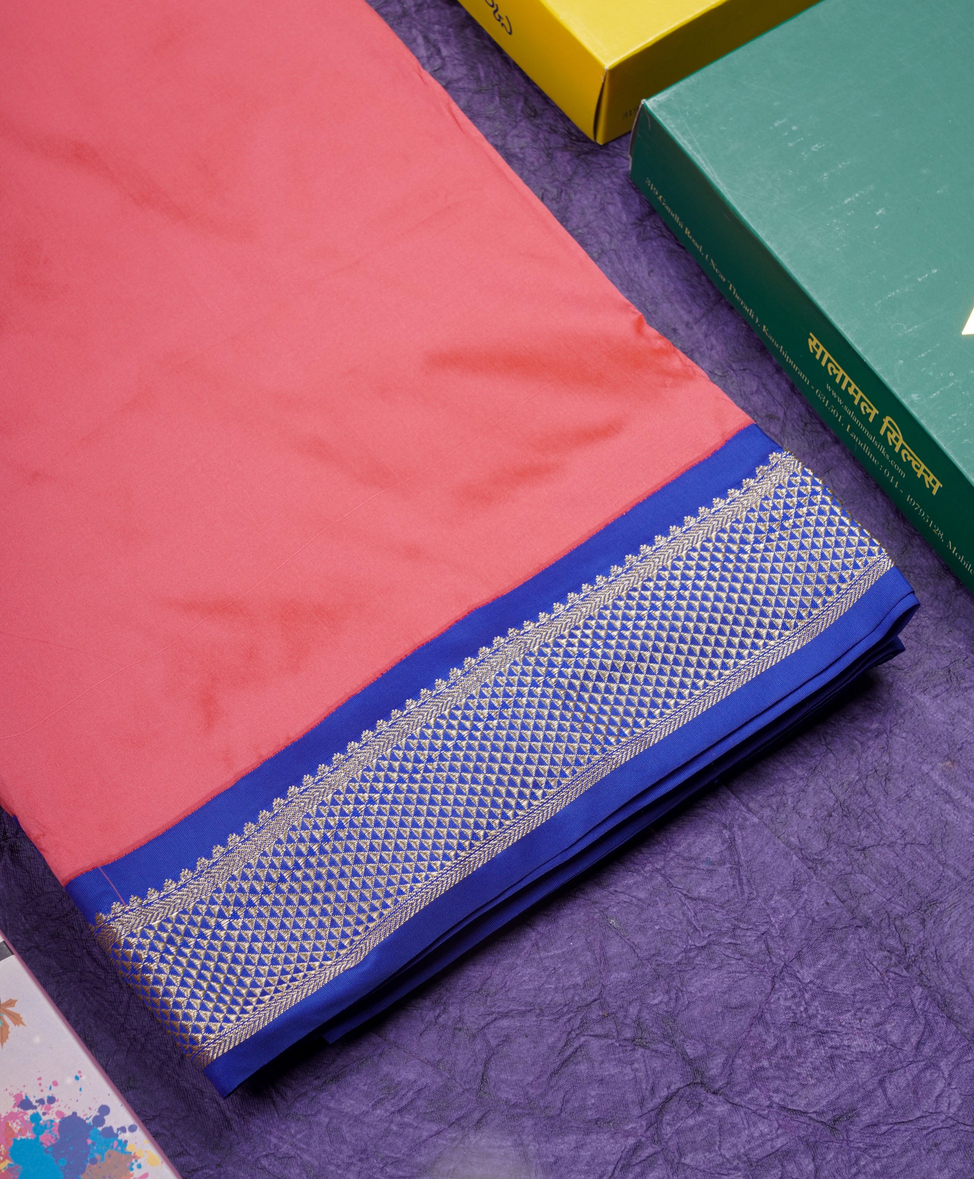 Salammal is known for its handloom sarees. In some sarees, there is cross-weaving between the body and the pallu, which is a sign of pure handloom sarees. This can be seen in Kanchipuram embossed sarees.