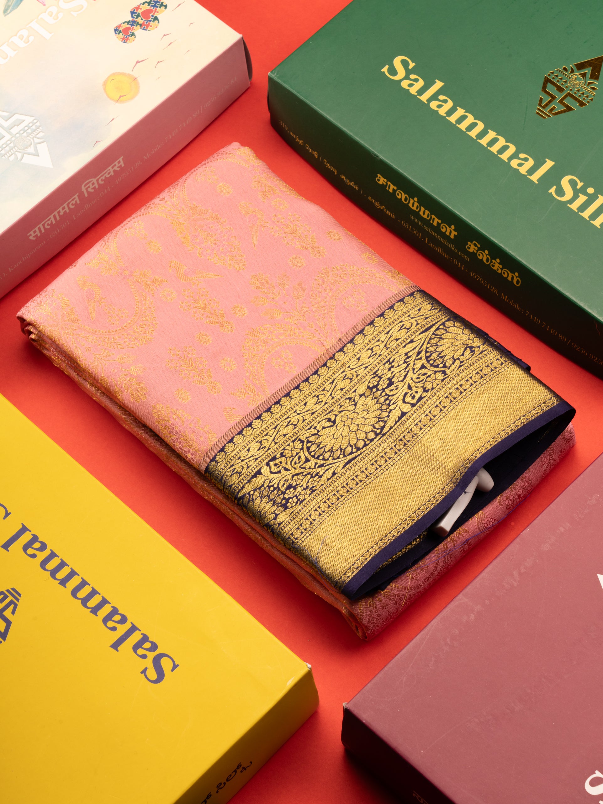 Salammal is known for its handloom sarees. In some sarees, there is cross-weaving between the body and the pallu, which is a sign of pure handloom sarees. This can be seen in Kanchipuram embossed sarees.
