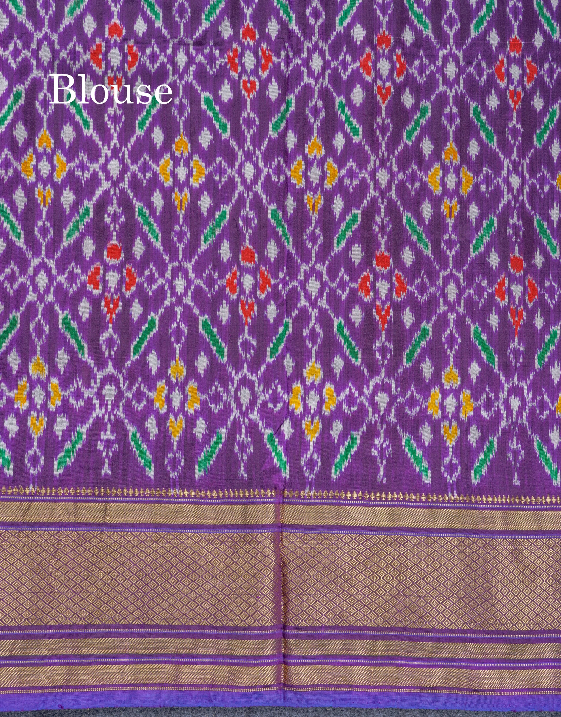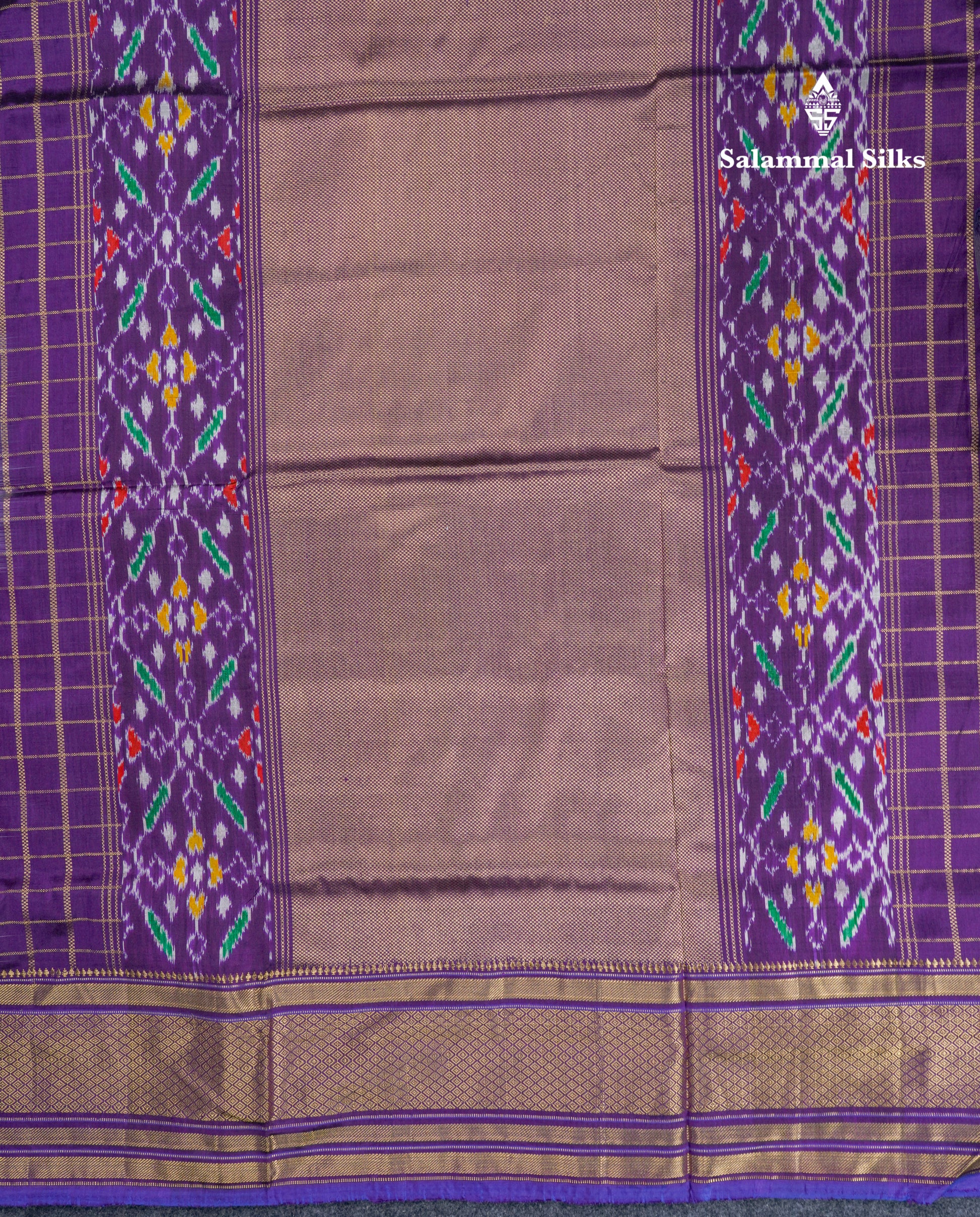 Baby Pink Checks Pure Kanjivaram Silk Saree With Contrast Purple Pochampalli Blouse