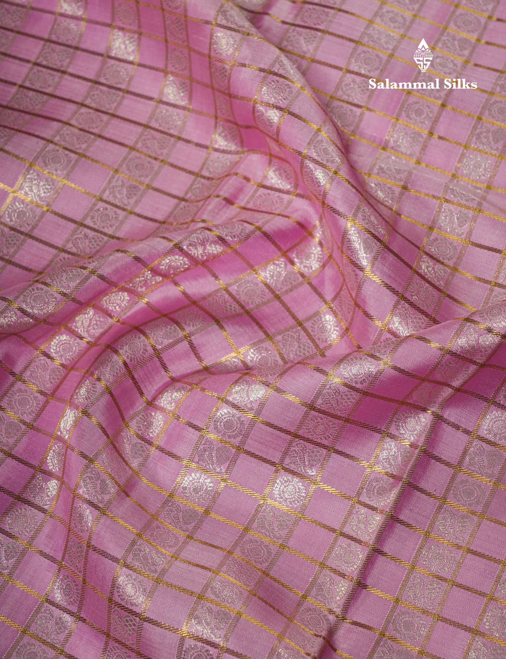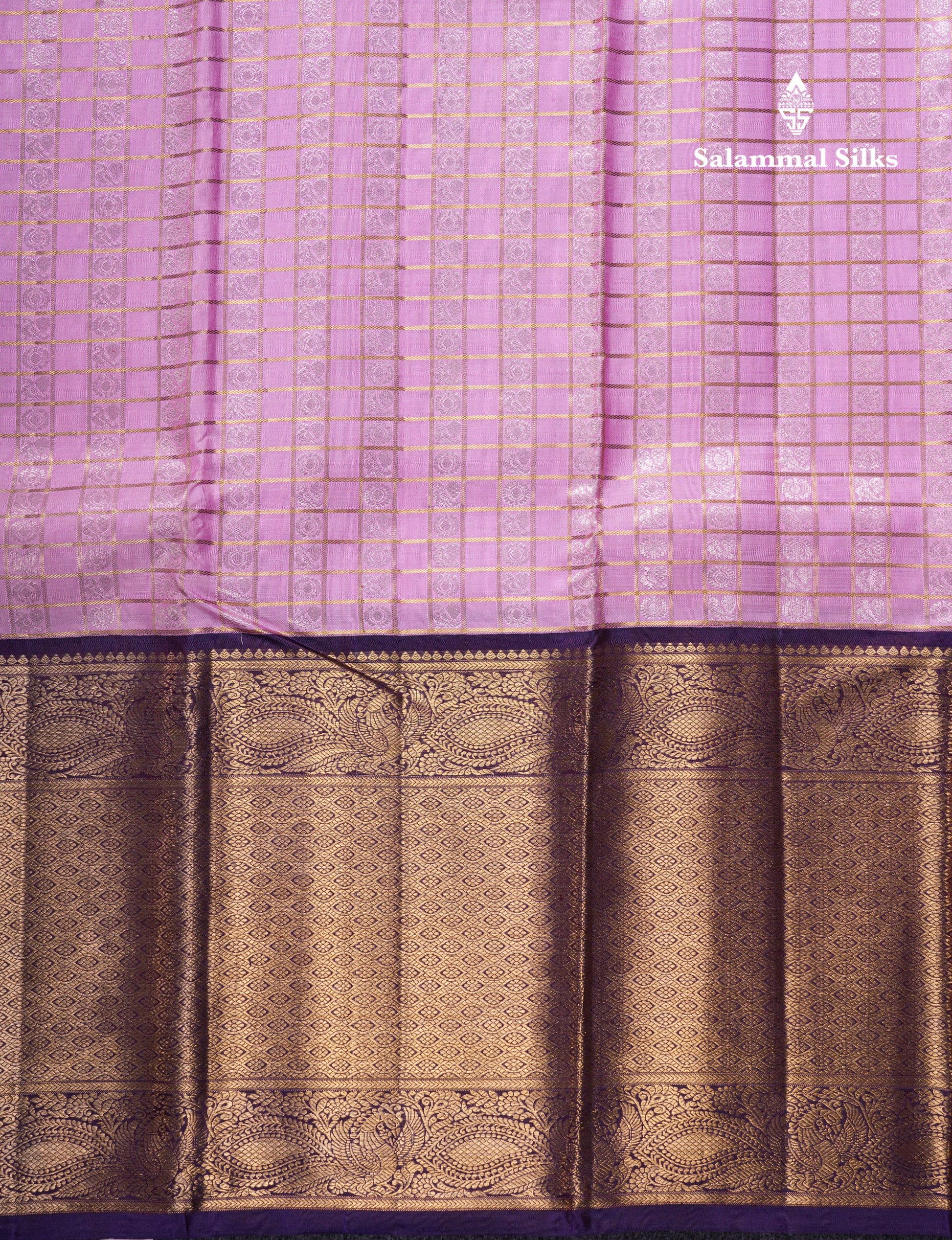 Baby Pink Traditional Gold Zari Checks And Silver Zari Buttas Pure KanjivaramSilk Saree With Long Navy Blue Equal Border