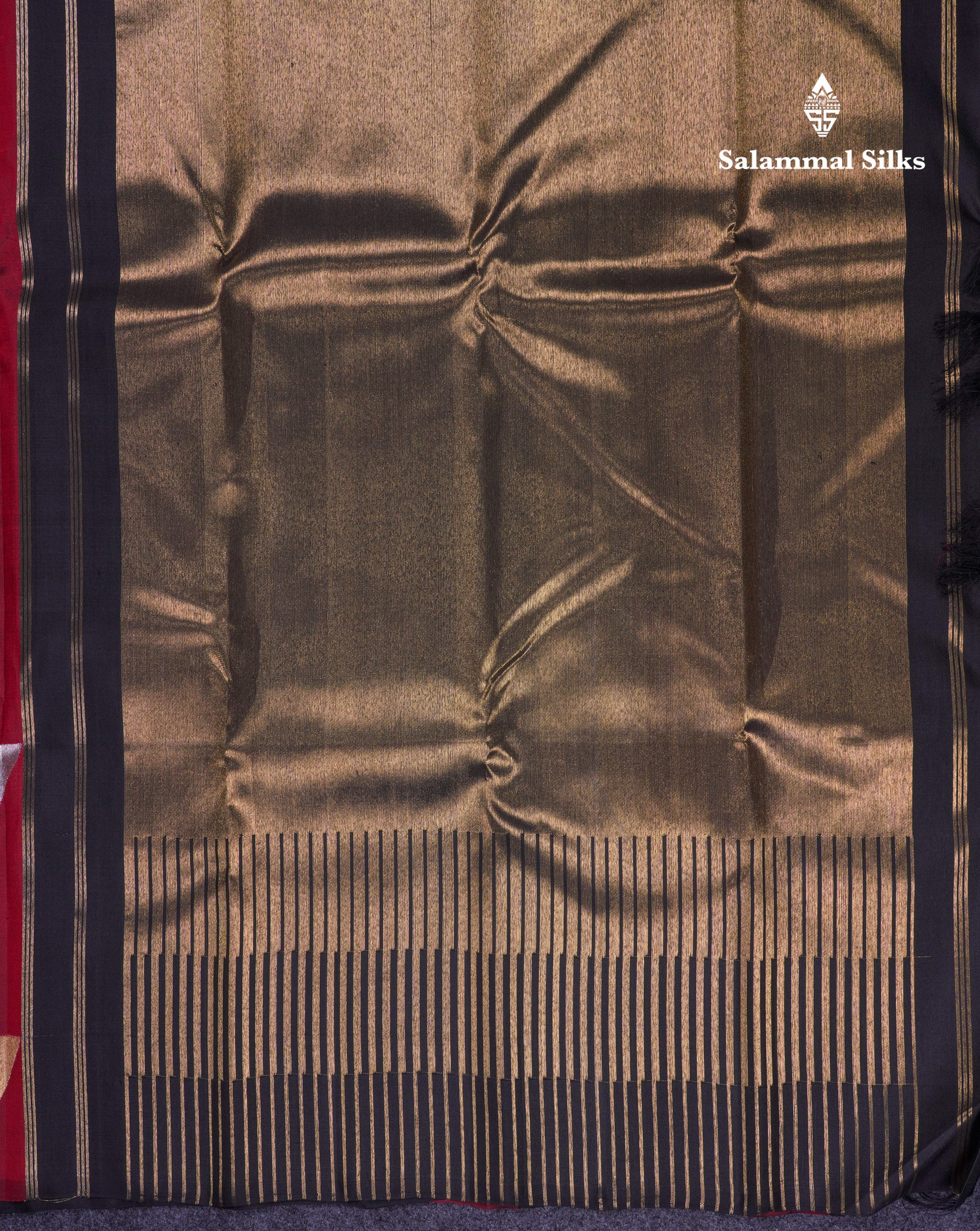 Salammal is known for its handloom sarees. In some sarees, there is cross-weaving between the body and the pallu, which is a sign of pure handloom sarees. This can be seen in Kanchipuram embossed sarees.