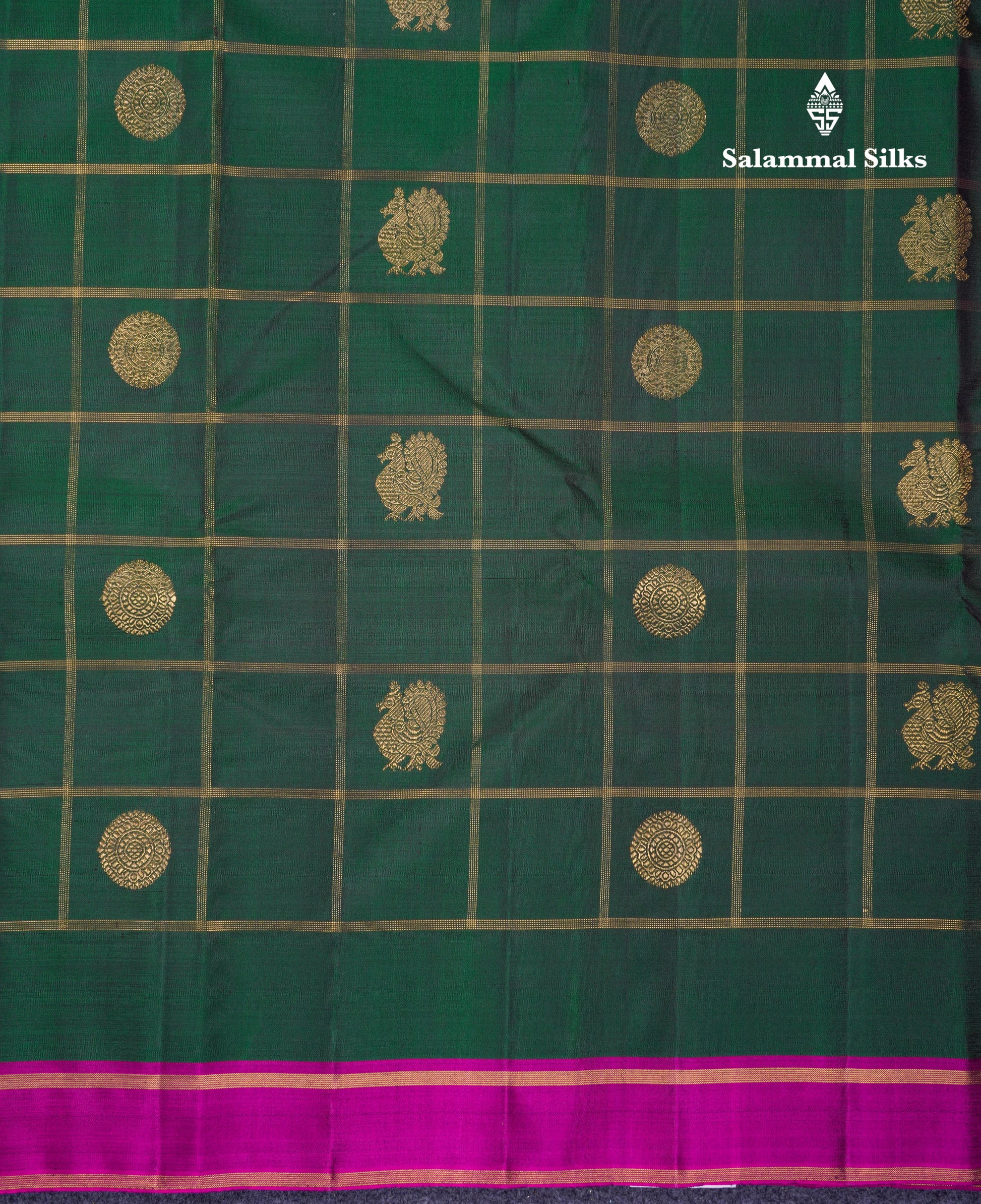Beautiful Bottle Green Zari Checks With Traditional Buttas Pure Kanjivaram Silk Saree Pure Zari with Contrast Magenta Pink Small Rettapet Border