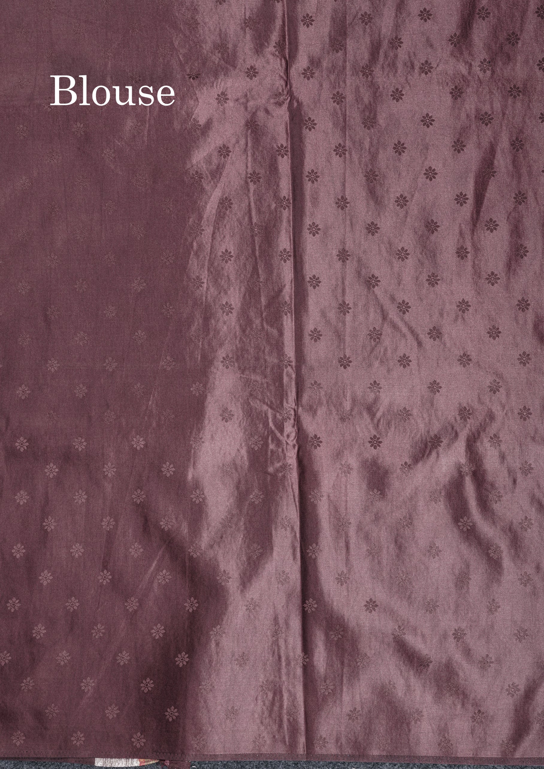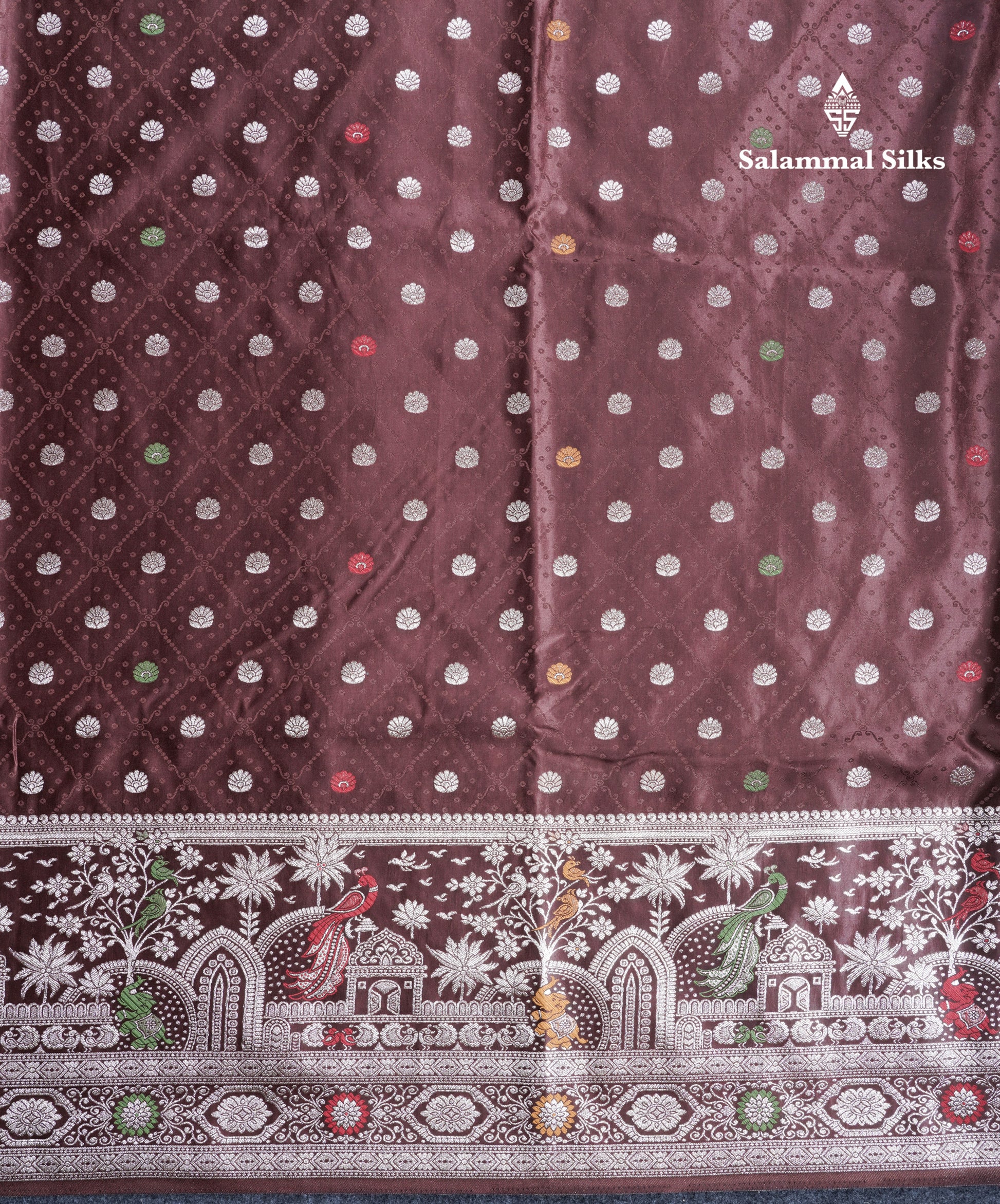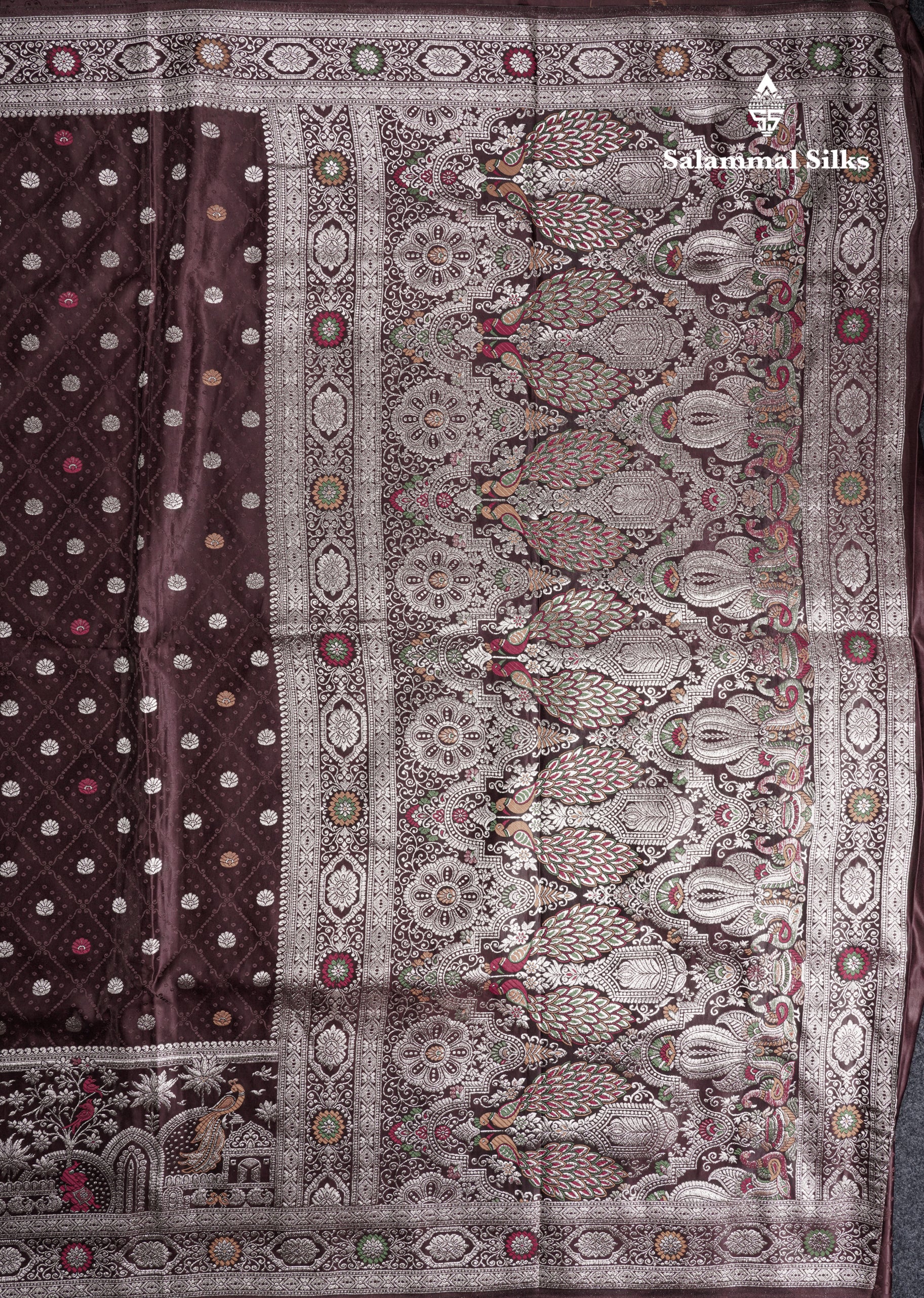 Beautiful Brown Meenakari Work Russian Silk Saree With Fancy Self Border