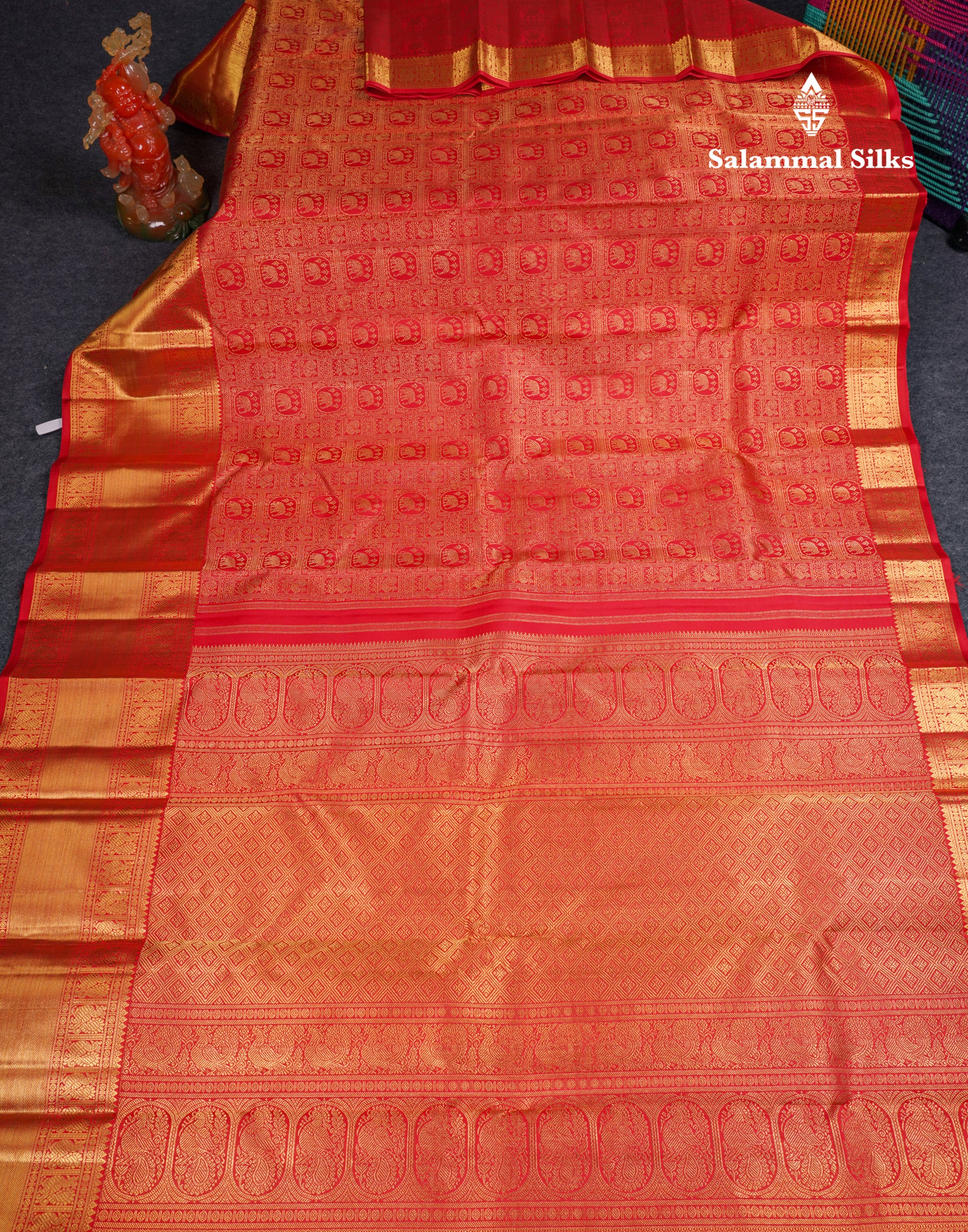 Beautiful Chilly Red Bridal 2G Pure Kanjivaram Silk Saree With Traditional Evening Morning Border
