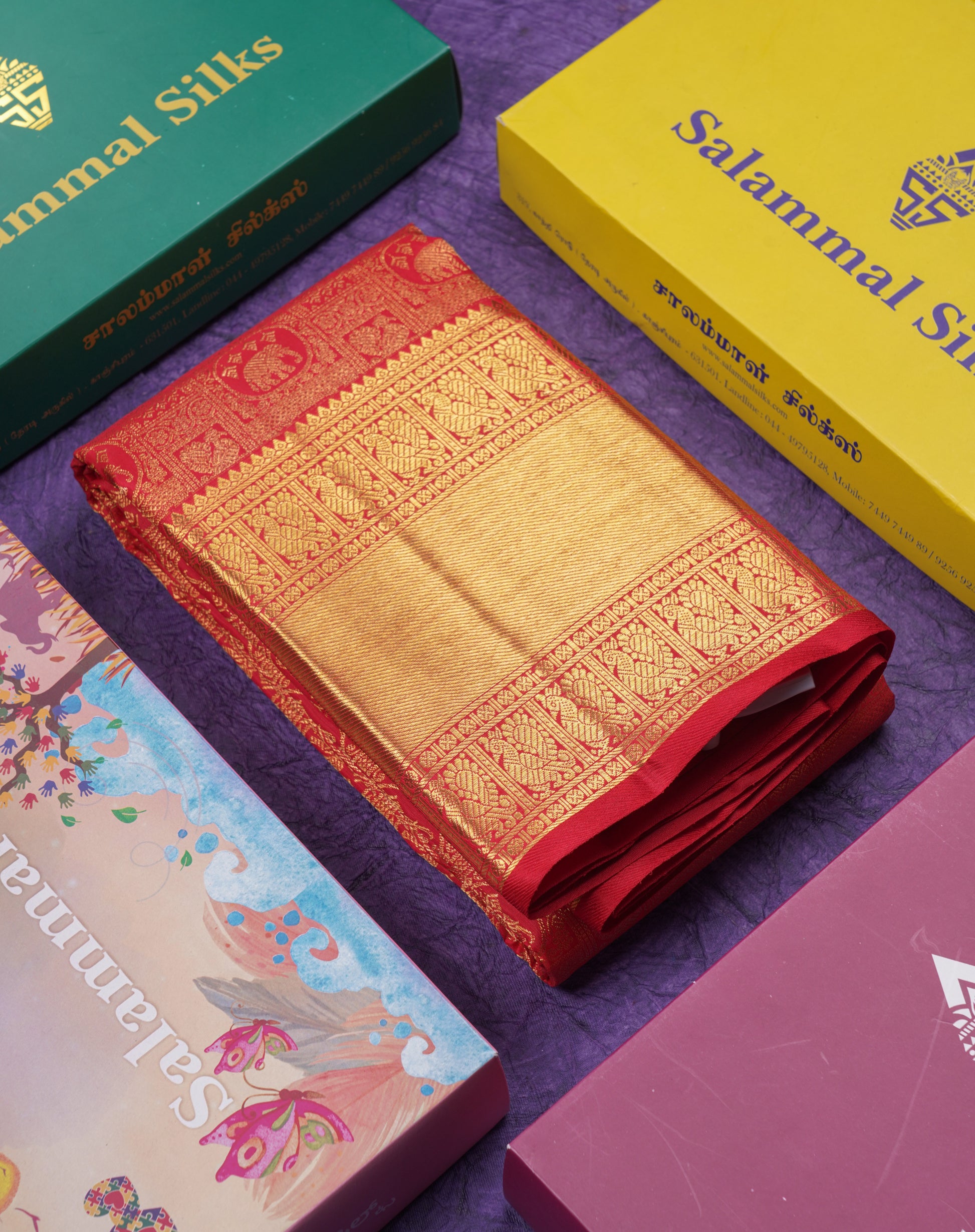 Salammal is known for its handloom sarees. In some sarees, there is cross-weaving between the body and the pallu, which is a sign of pure handloom sarees. This can be seen in Kanchipuram embossed sarees.