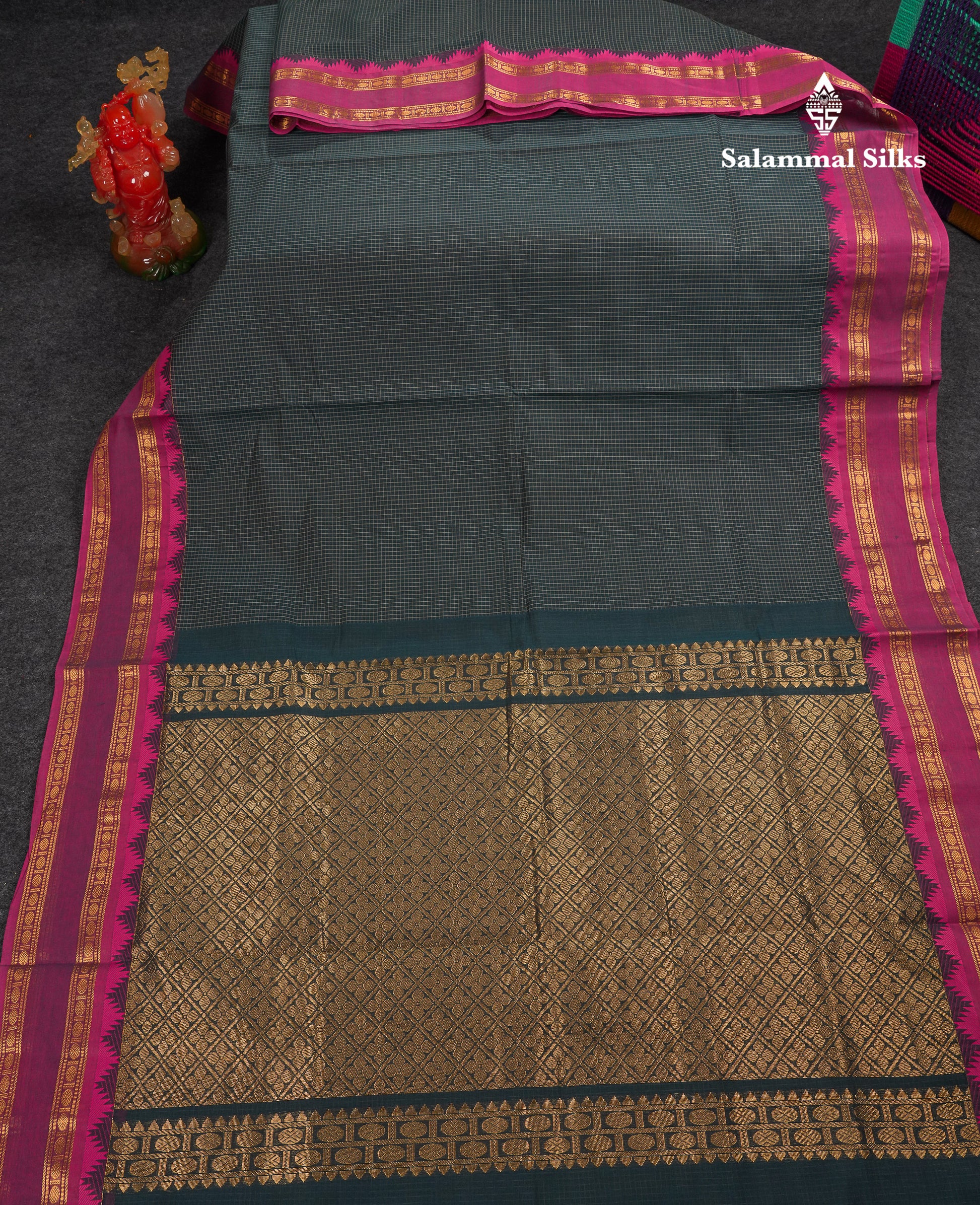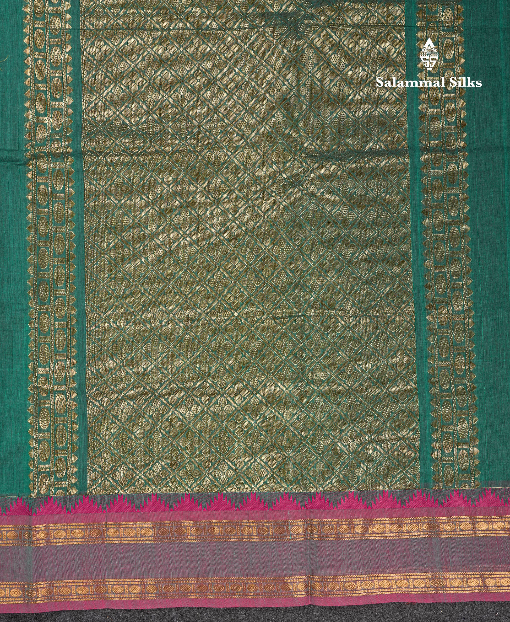 Salammal is known for its handloom sarees. In some sarees, there is cross-weaving between the body and the pallu, which is a sign of pure handloom sarees. This can be seen in Kanchipuram embossed sarees.
