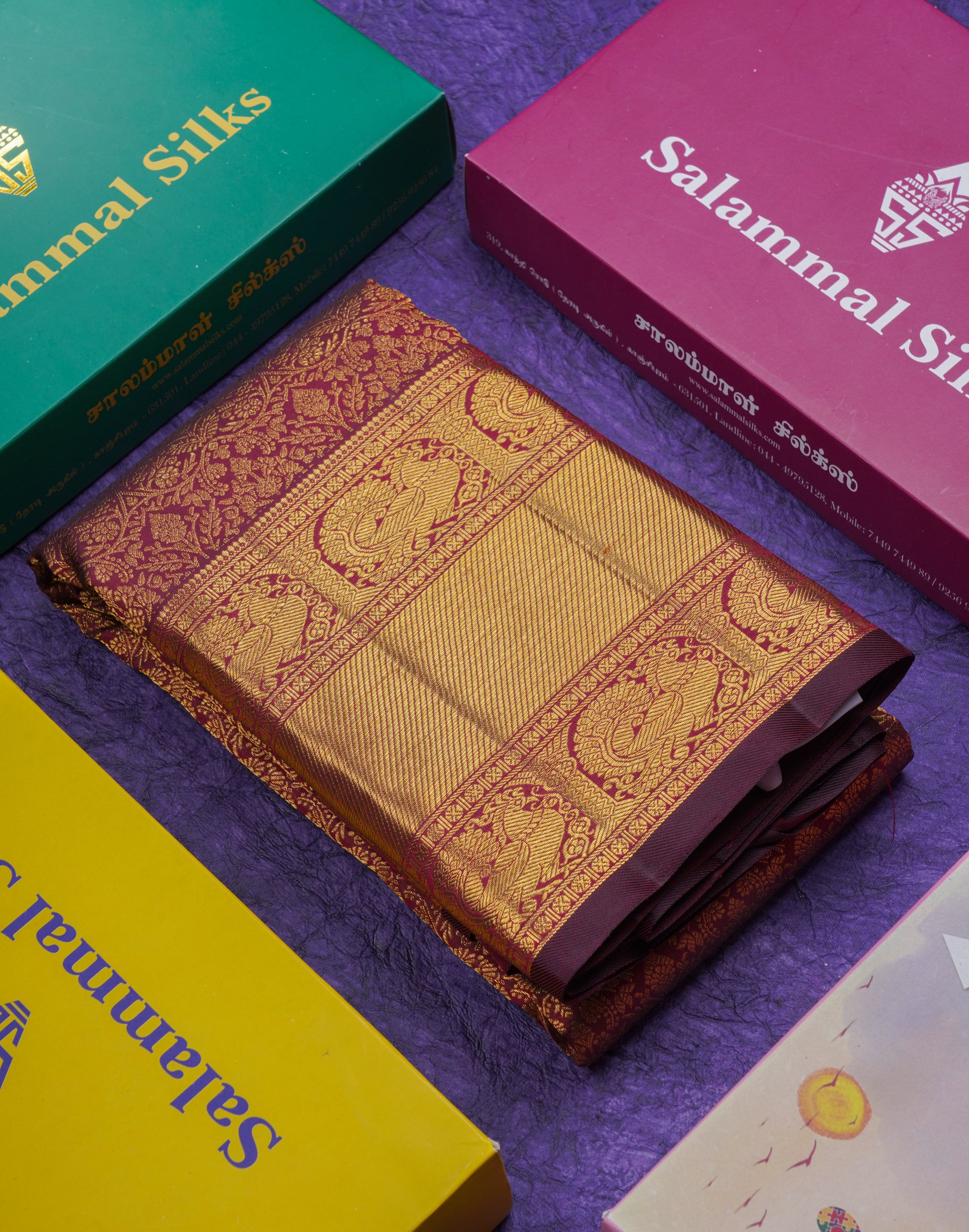 Salammal is known for its handloom sarees. In some sarees, there is cross-weaving between the body and the pallu, which is a sign of pure handloom sarees. This can be seen in Kanchipuram embossed sarees.