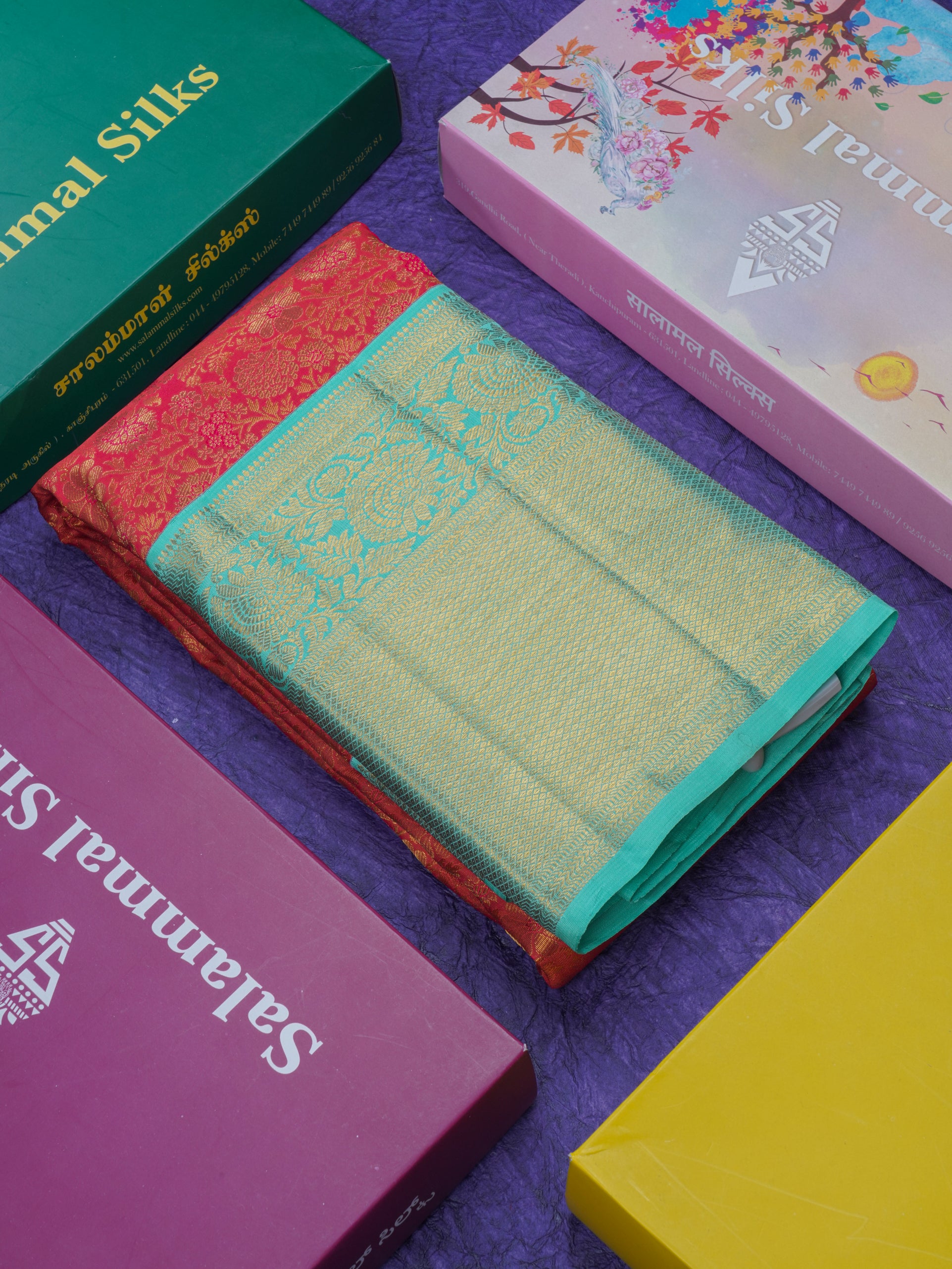 Salammal is known for its handloom sarees. In some sarees, there is cross-weaving between the body and the pallu, which is a sign of pure handloom sarees. This can be seen in Kanchipuram embossed sarees.