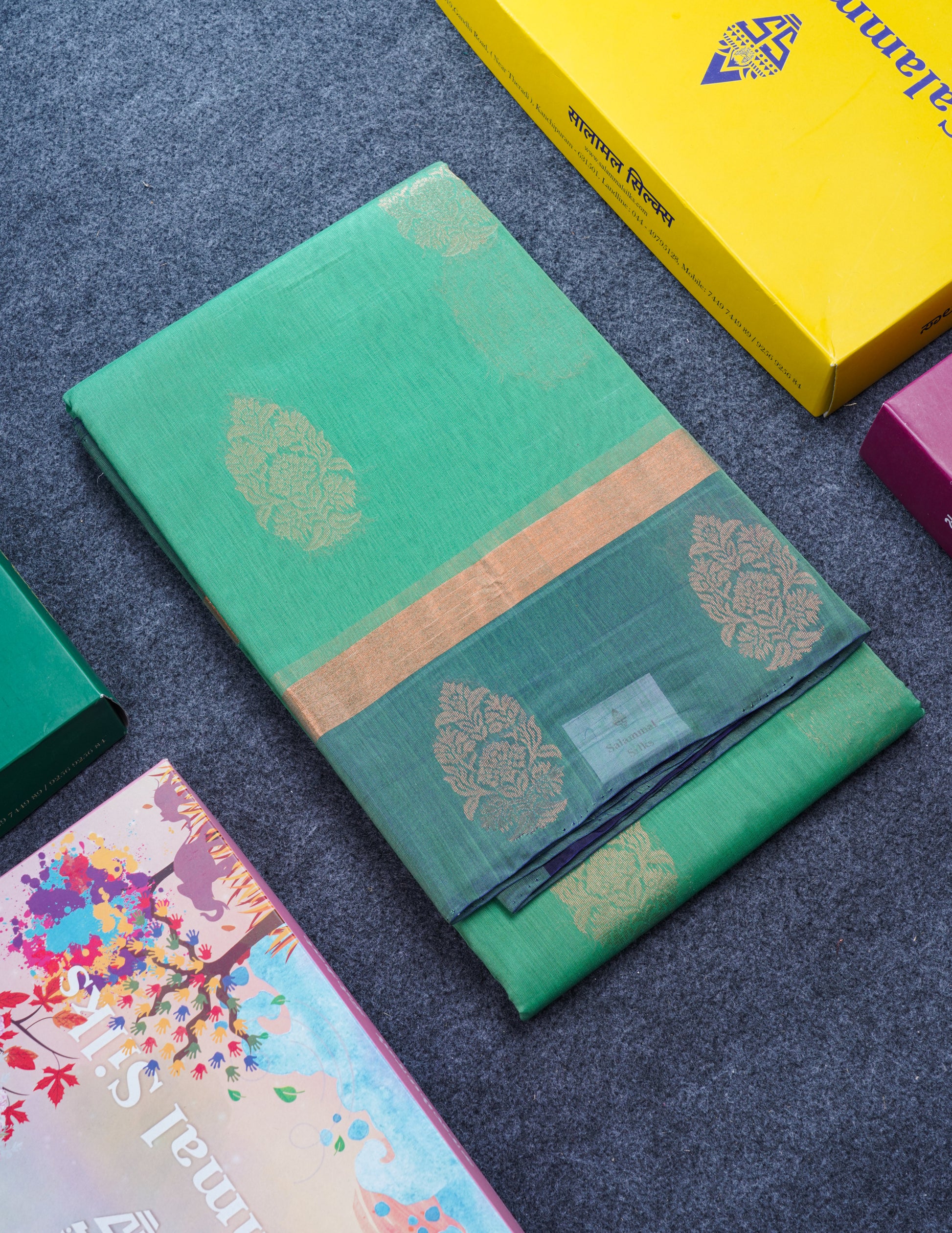 Salammal is known for its handloom sarees. In some sarees, there is cross-weaving between the body and the pallu, which is a sign of pure handloom sarees. This can be seen in Kanchipuram embossed sarees.