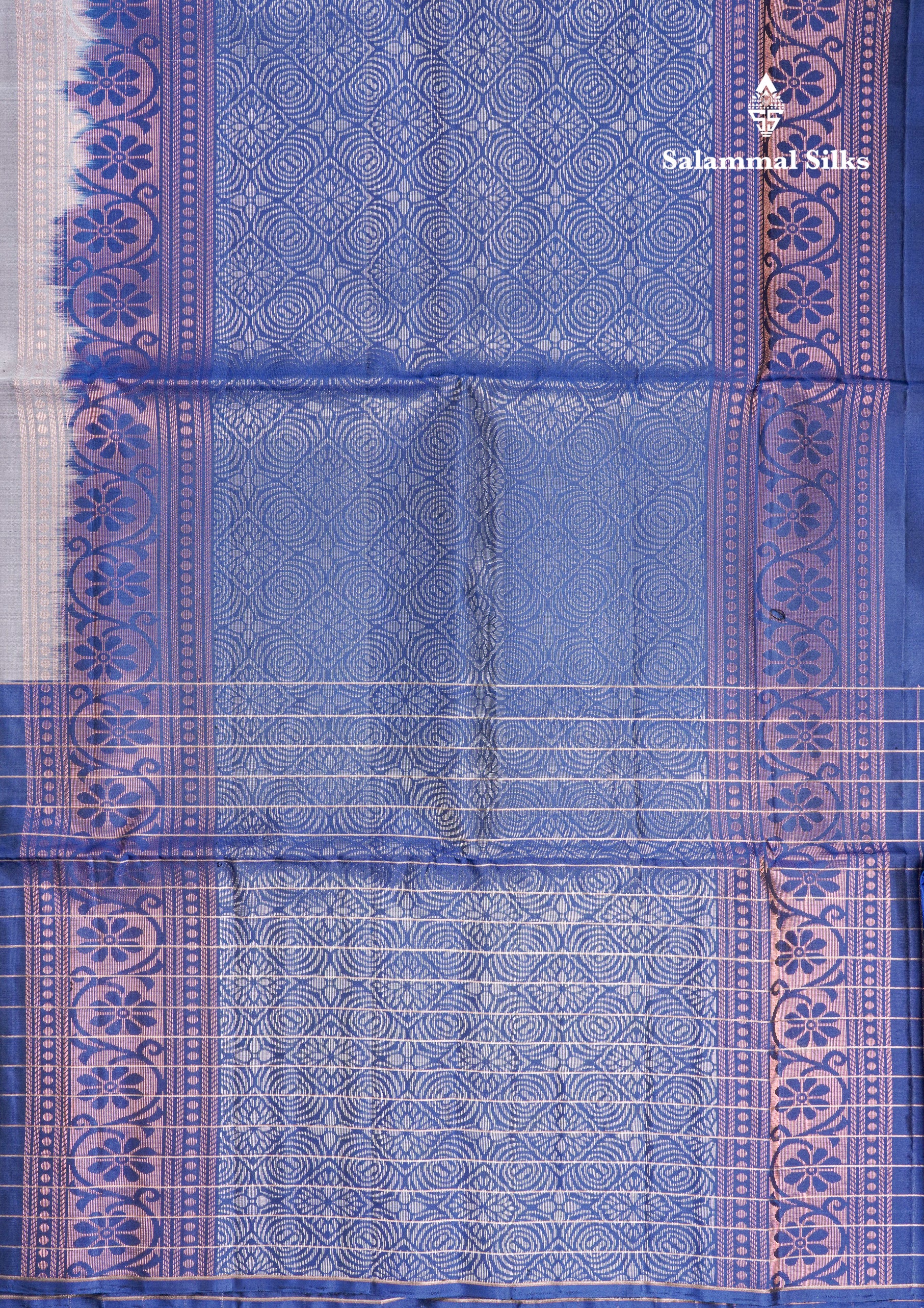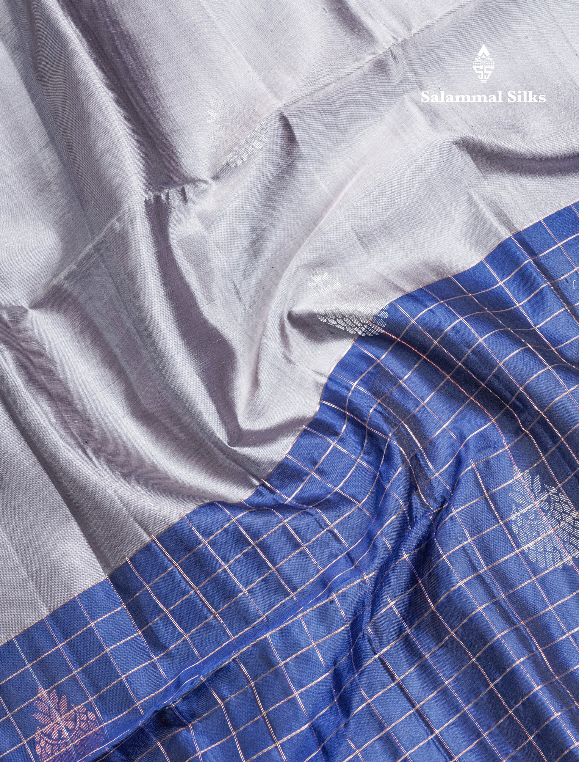 Beautiful Grey Pure Kanjivaram Soft Silk Saree With Navy Blue Zari Lines One Side Border