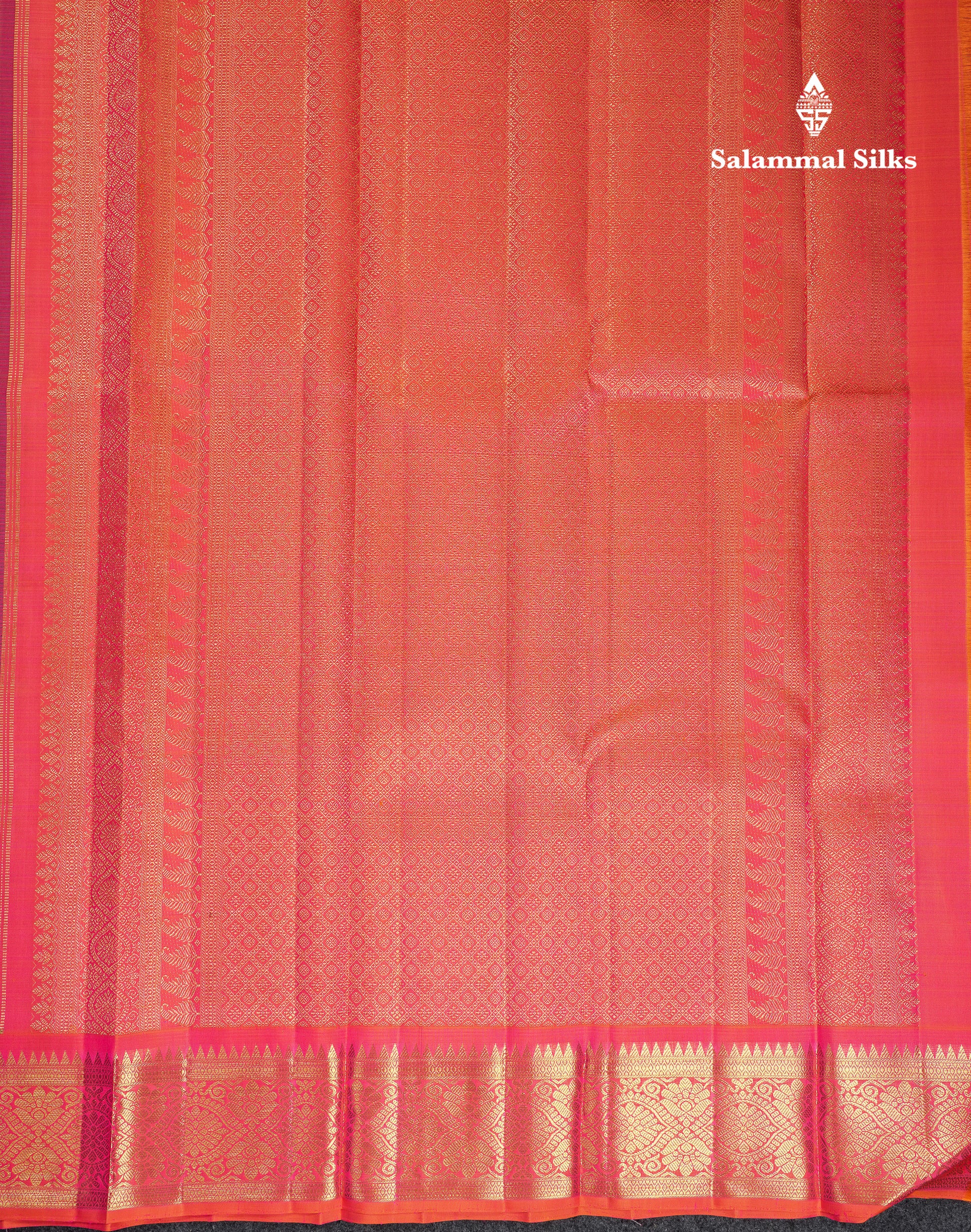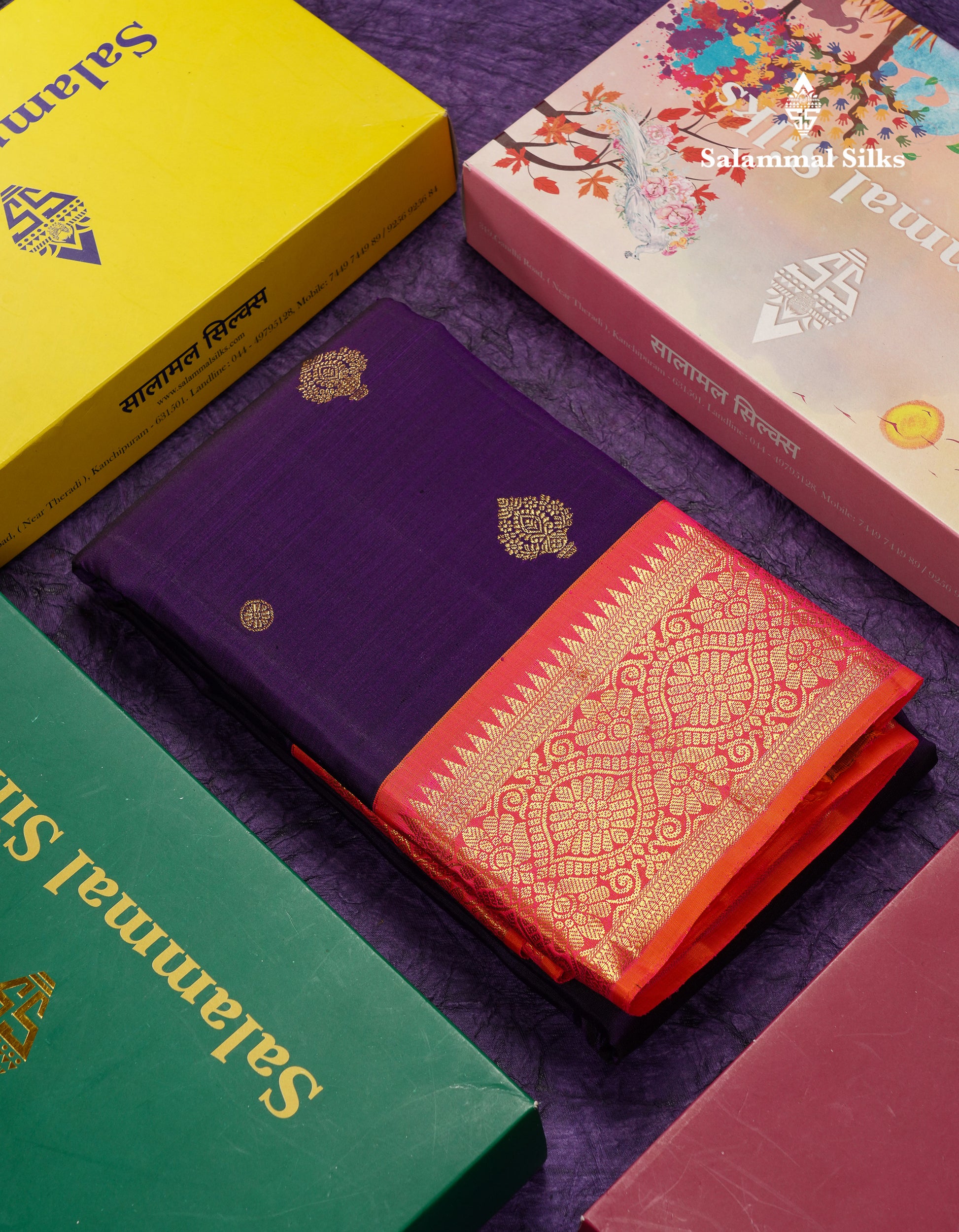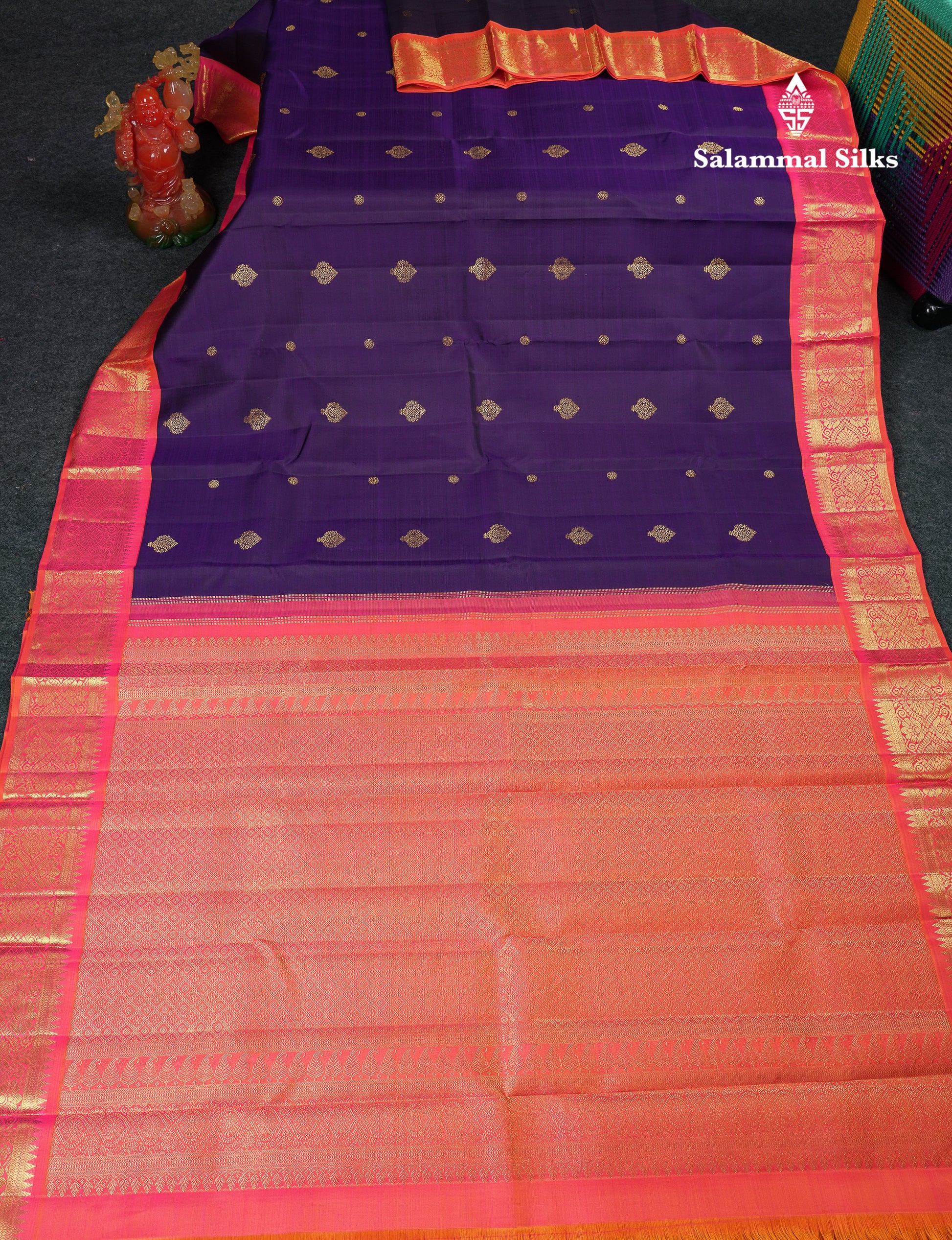 Beautiful Korvai Violet Pure Kanjivaram Silk Saree With Contrast Dual Tone Pinkish Orange Traditional Border