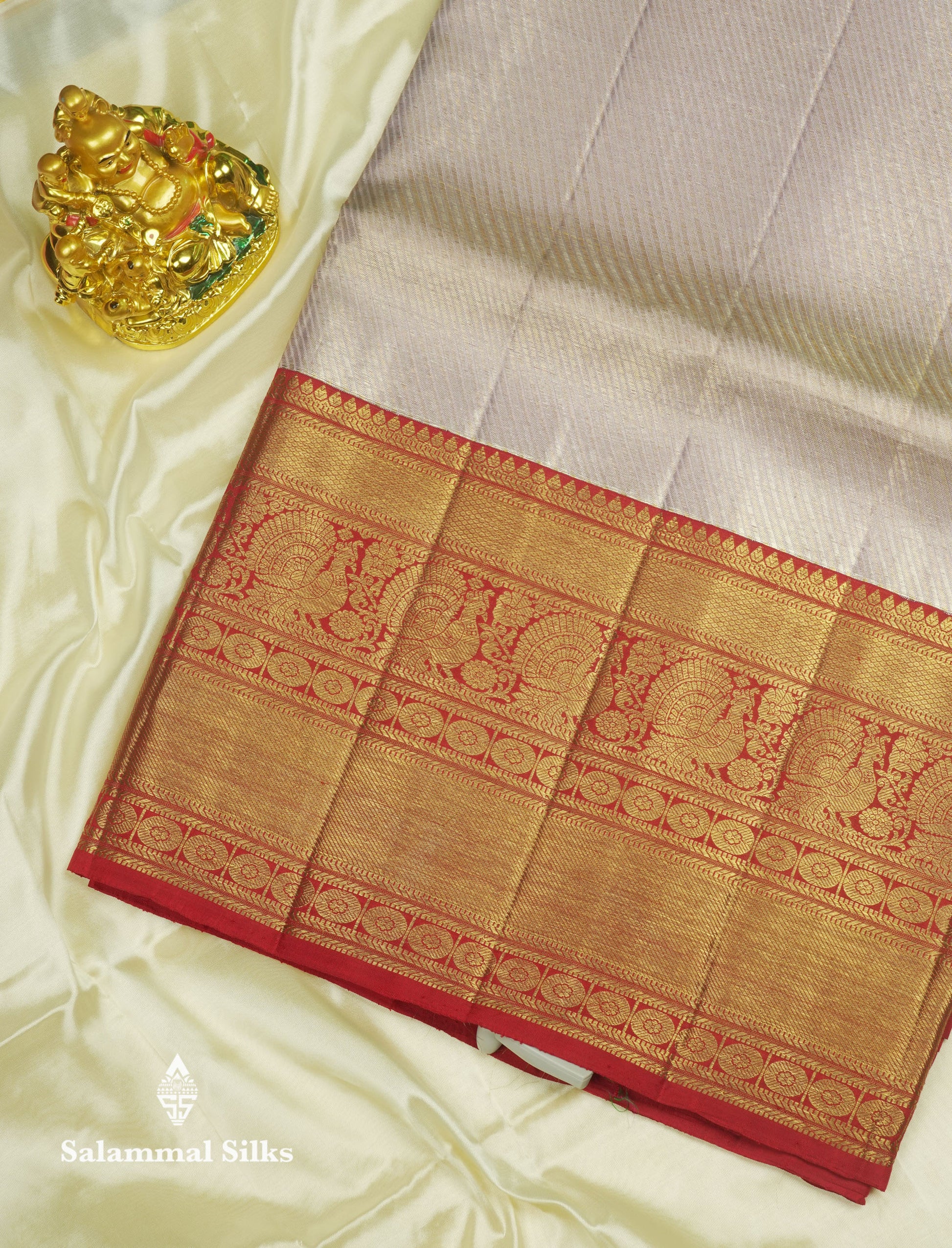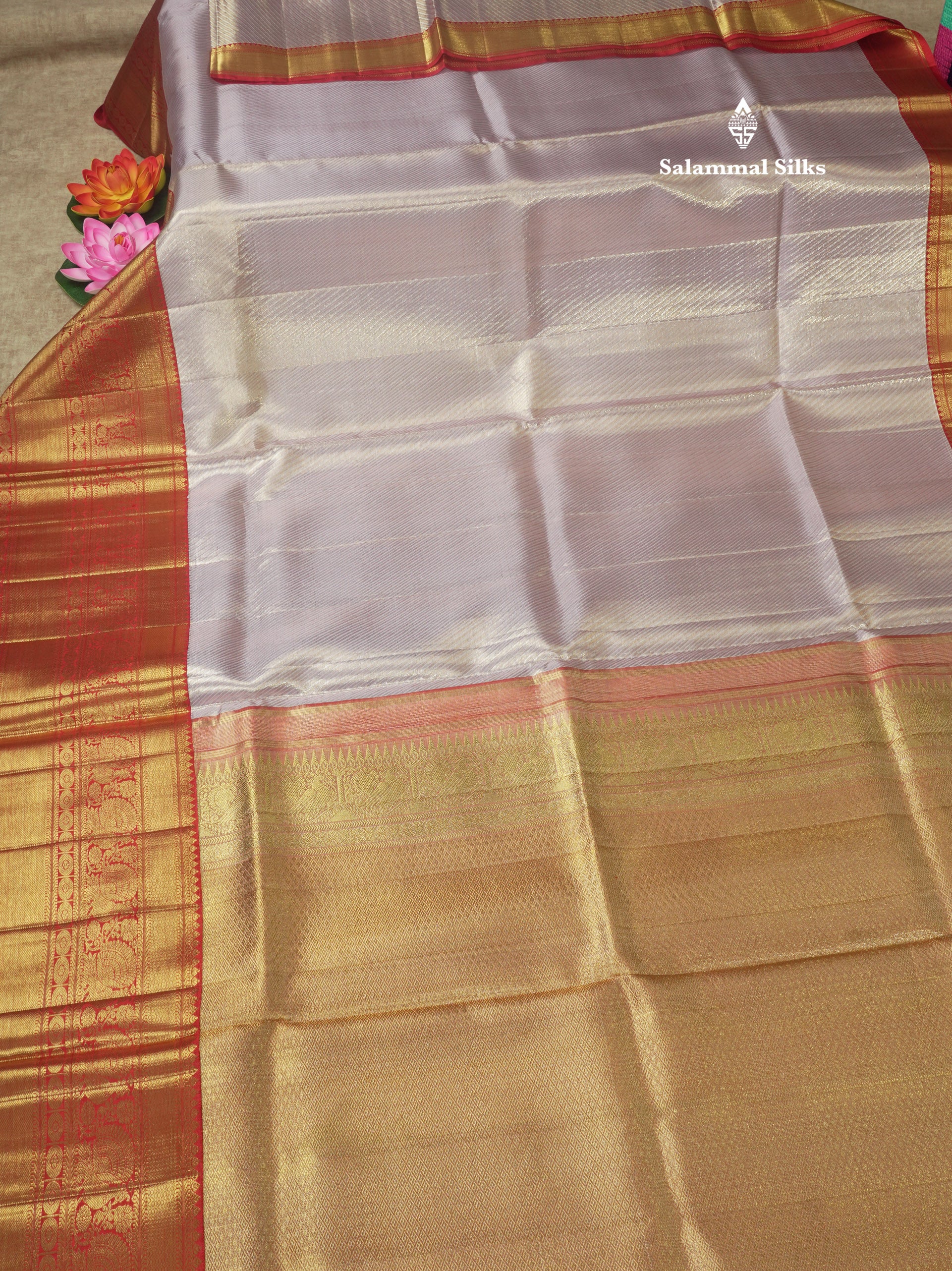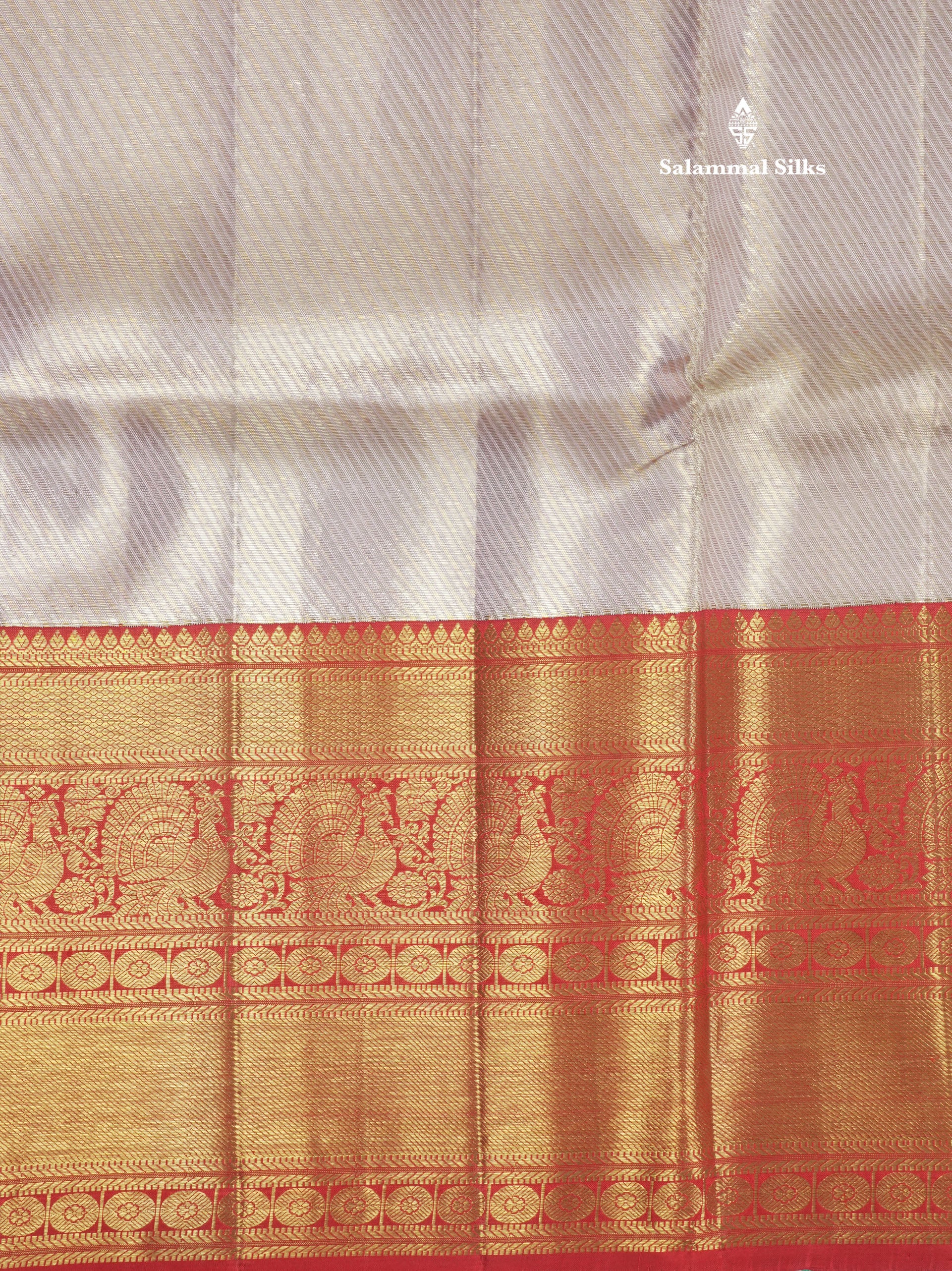 Salammal is known for its handloom sarees. In some sarees, there is cross-weaving between the body and the pallu, which is a sign of pure handloom sarees. This can be seen in Kanchipuram embossed sarees.