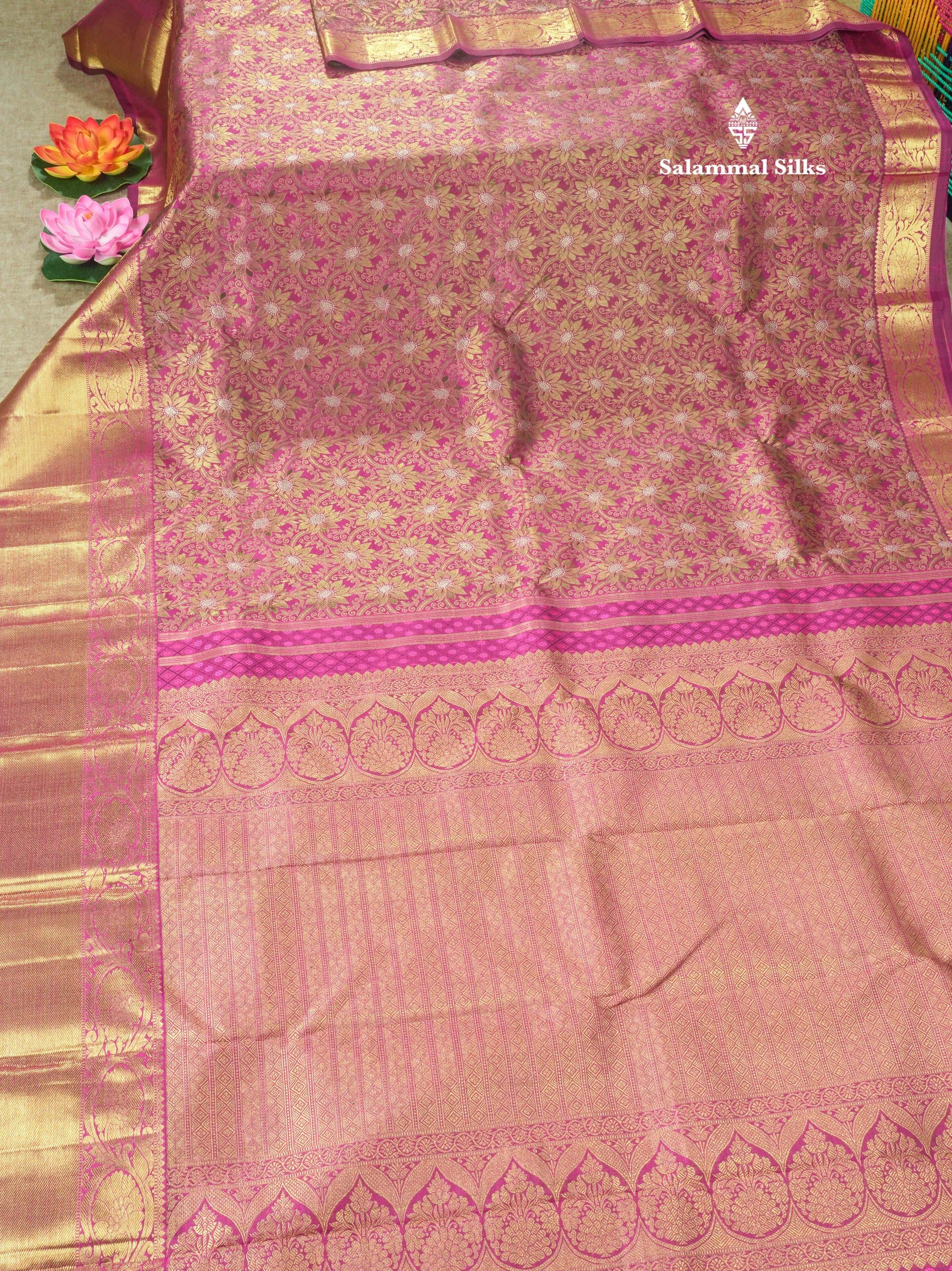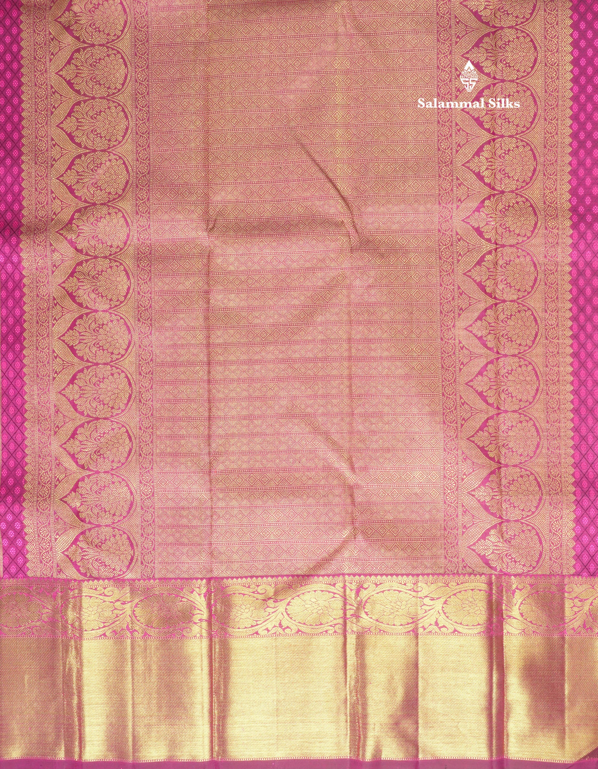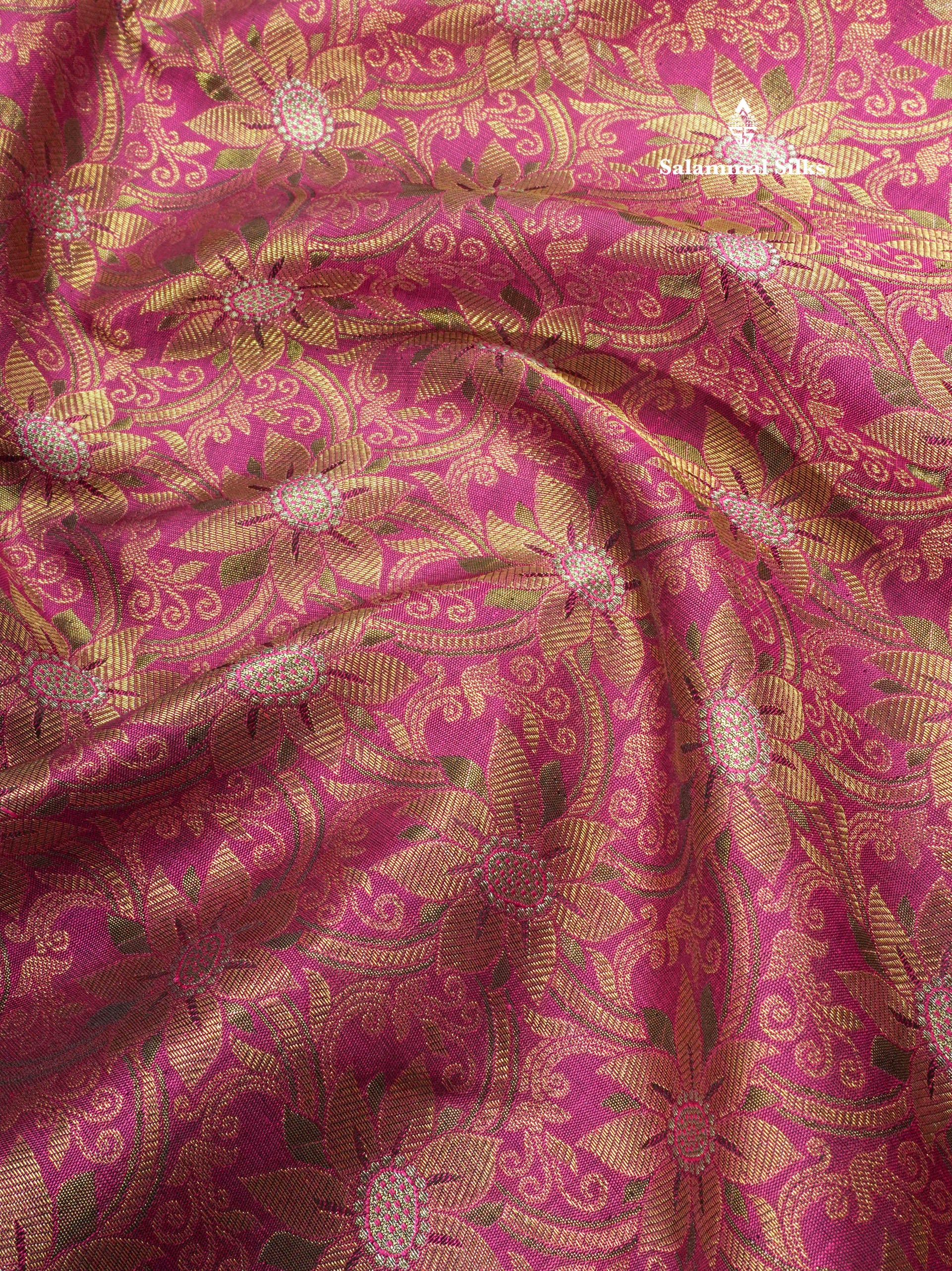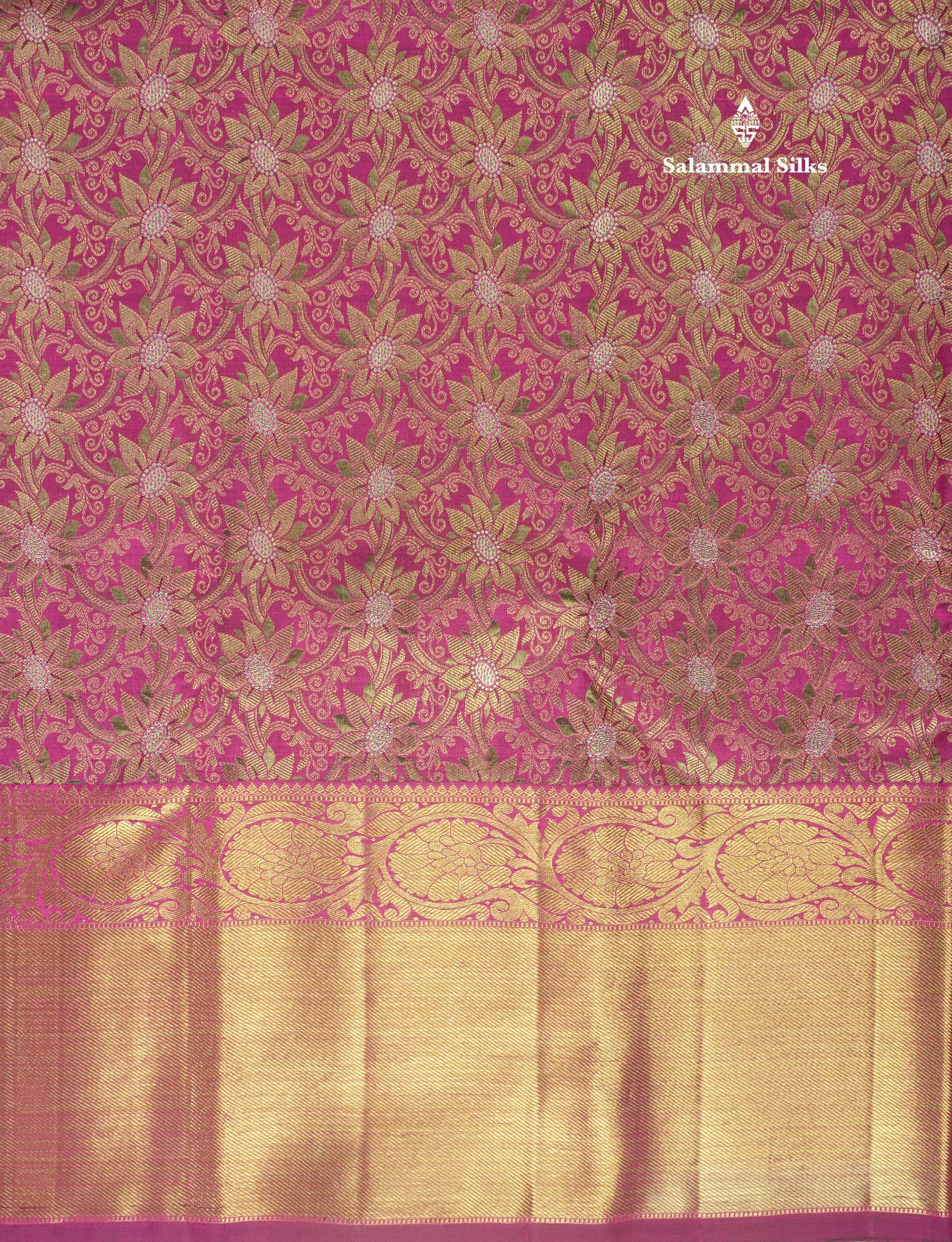 Salammal is known for its handloom sarees. In some sarees, there is cross-weaving between the body and the pallu, which is a sign of pure handloom sarees. This can be seen in Kanchipuram embossed sarees.