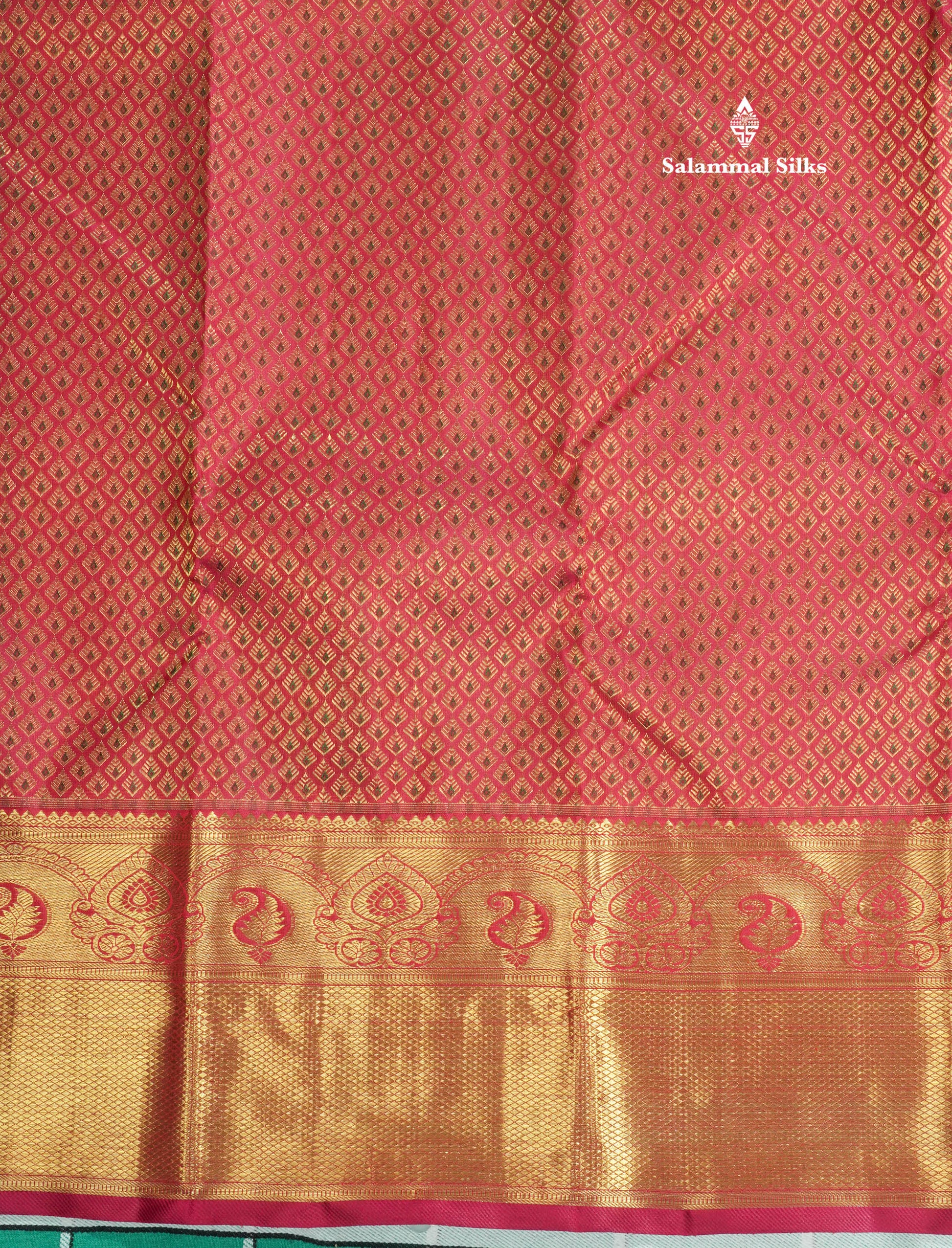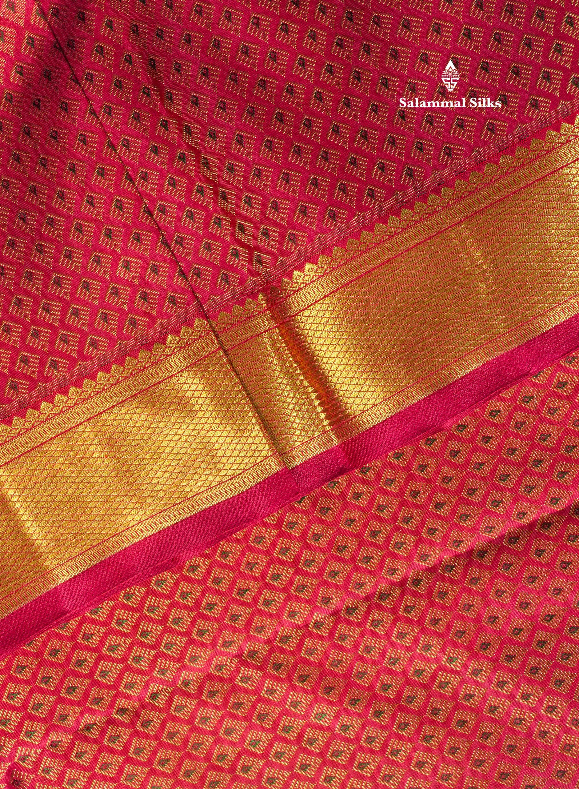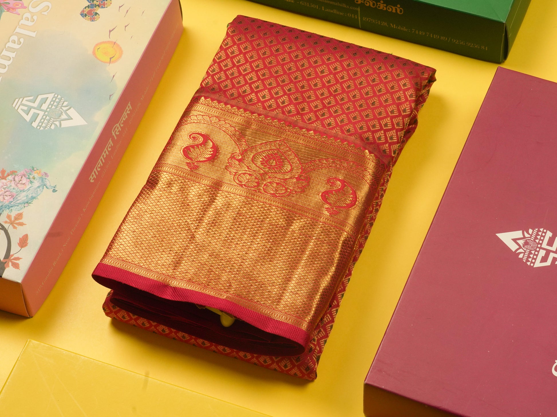 Salammal is known for its handloom sarees. In some sarees, there is cross-weaving between the body and the pallu, which is a sign of pure handloom sarees. This can be seen in Kanchipuram embossed sarees.