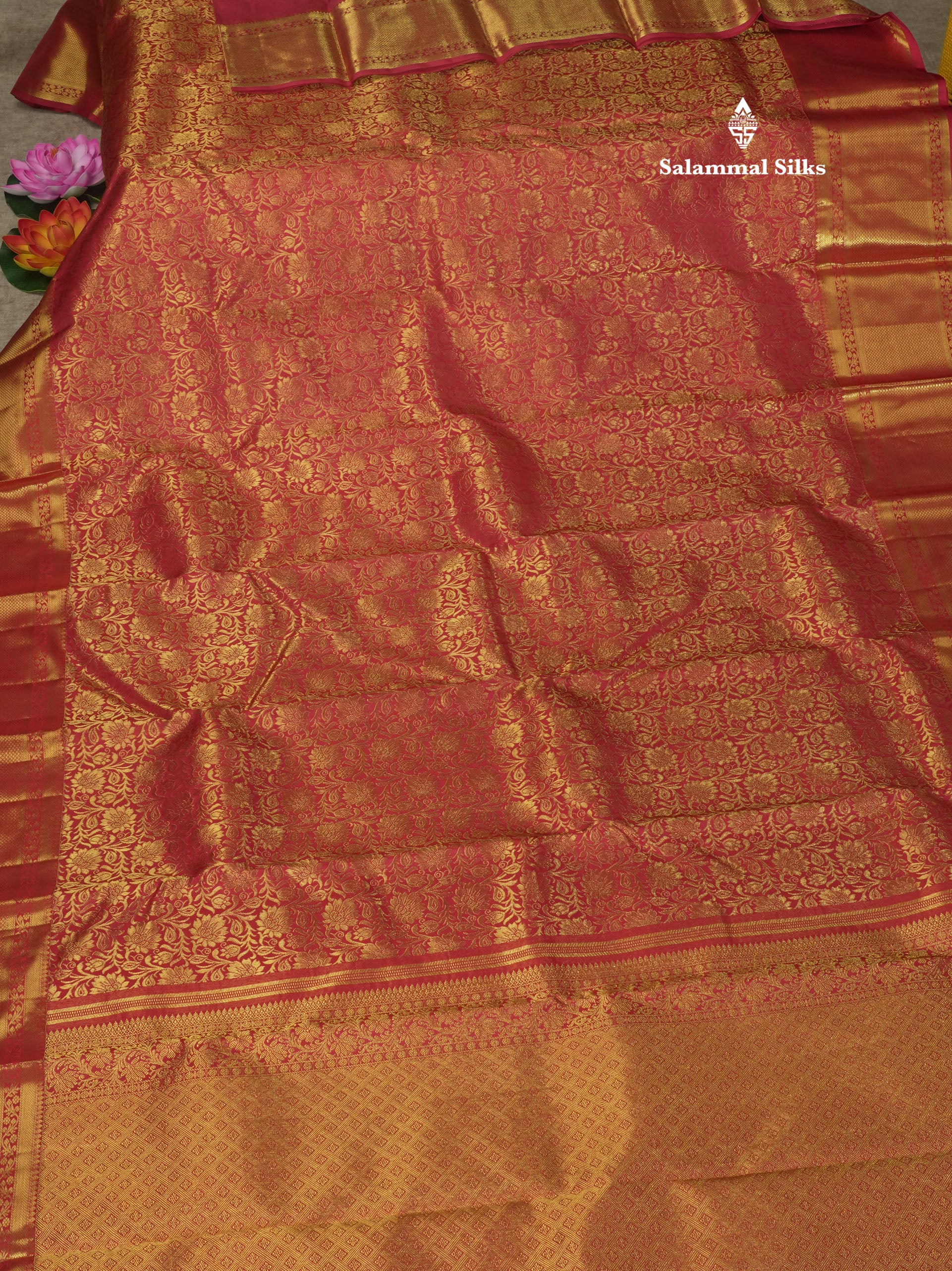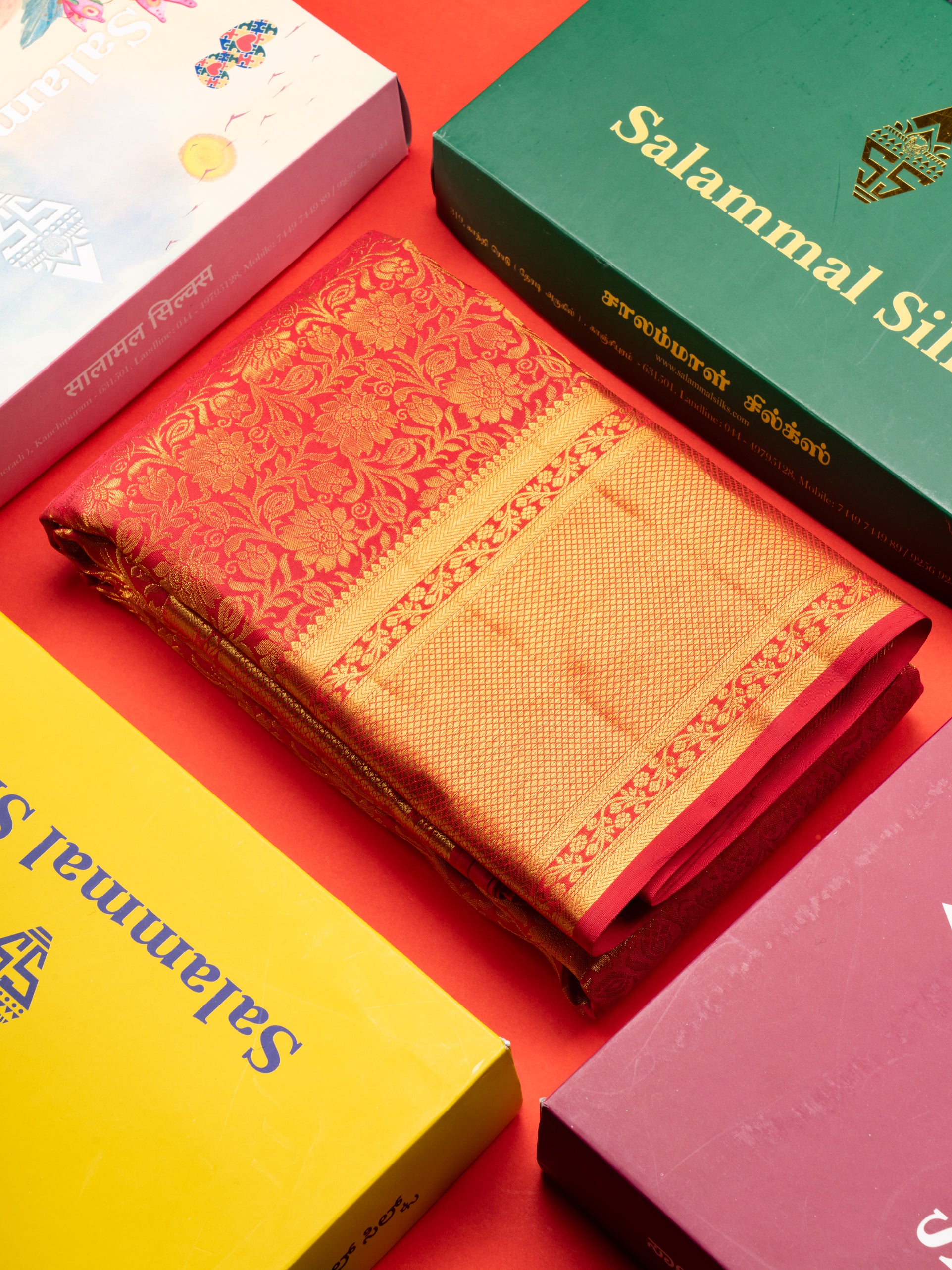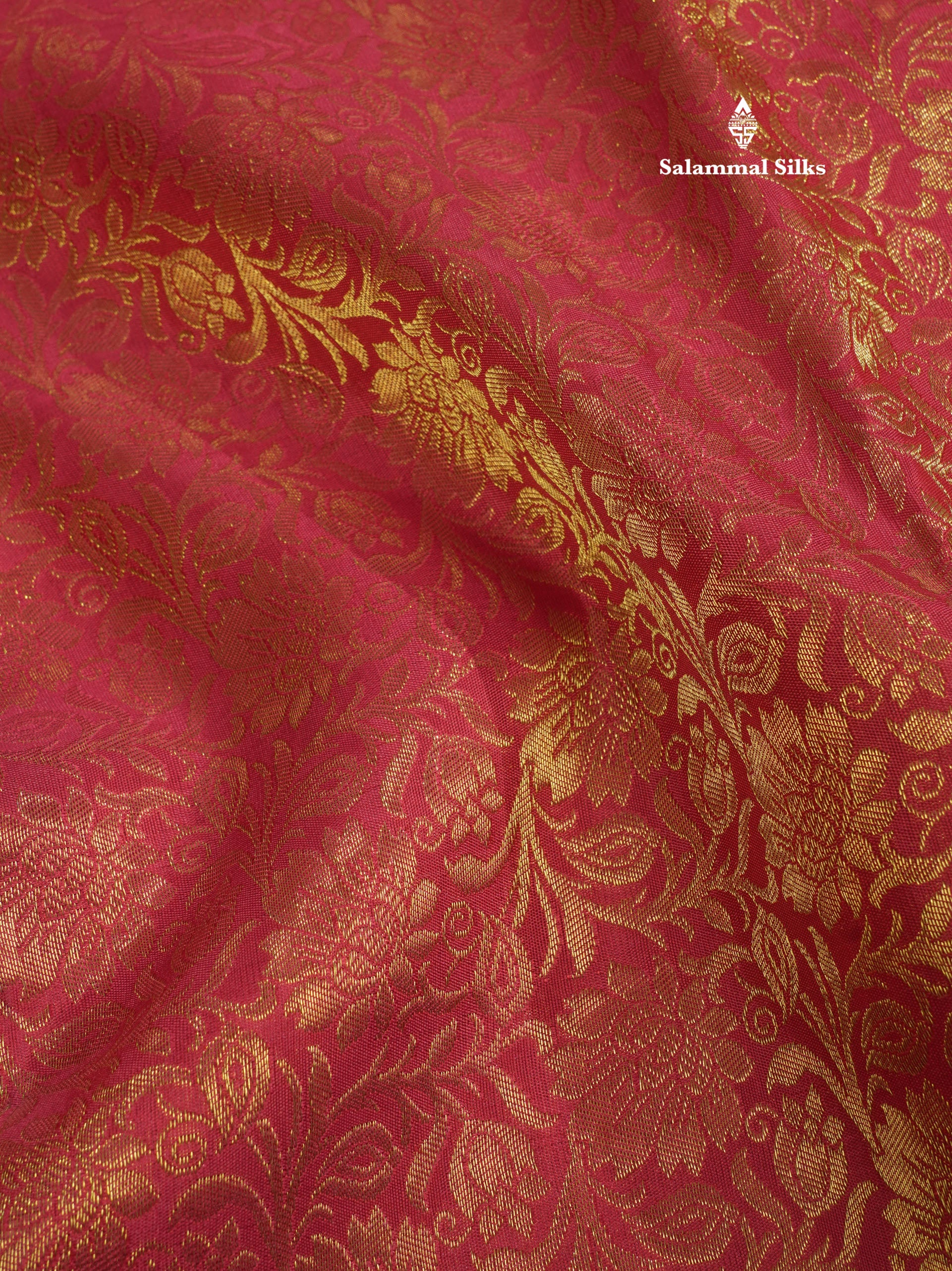 Salammal is known for its handloom sarees. In some sarees, there is cross-weaving between the body and the pallu, which is a sign of pure handloom sarees. This can be seen in Kanchipuram embossed sarees.