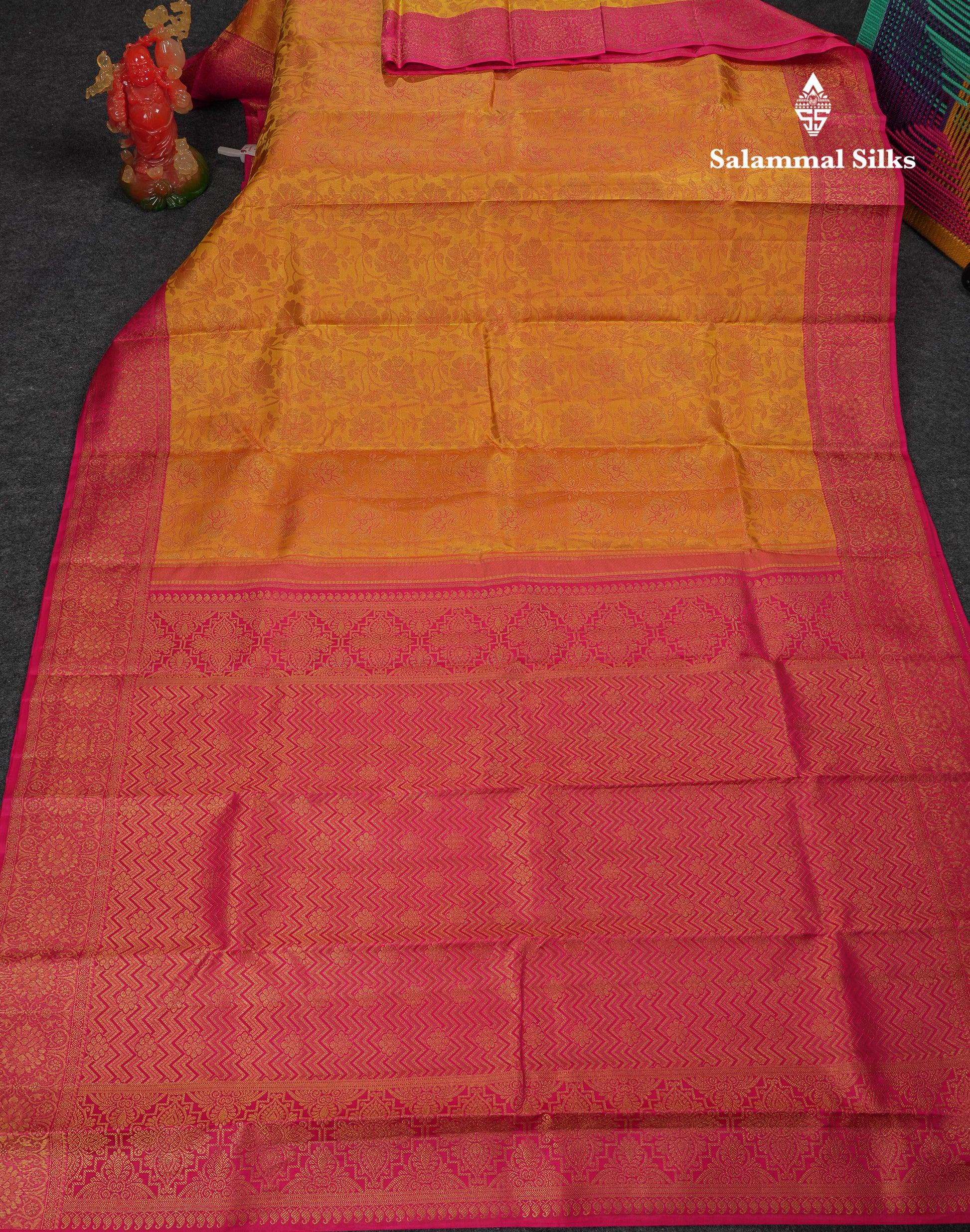 Salammal is known for its handloom sarees. In some sarees, there is cross-weaving between the body and the pallu, which is a sign of pure handloom sarees. This can be seen in Kanchipuram embossed sarees.
