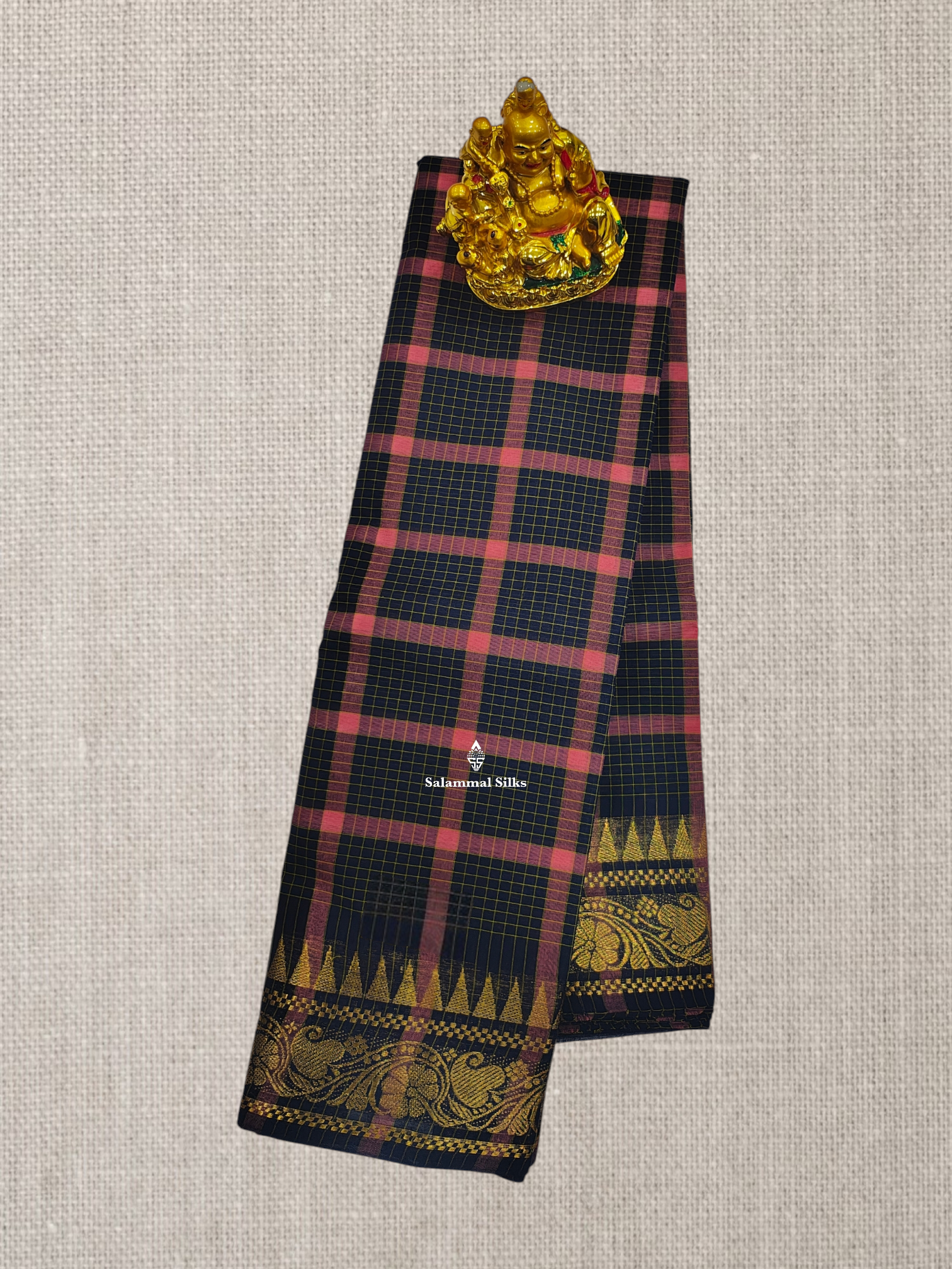 Beautiful Navy Blue Thread Checks Chettinad Pure Cotton Saree With Self Border