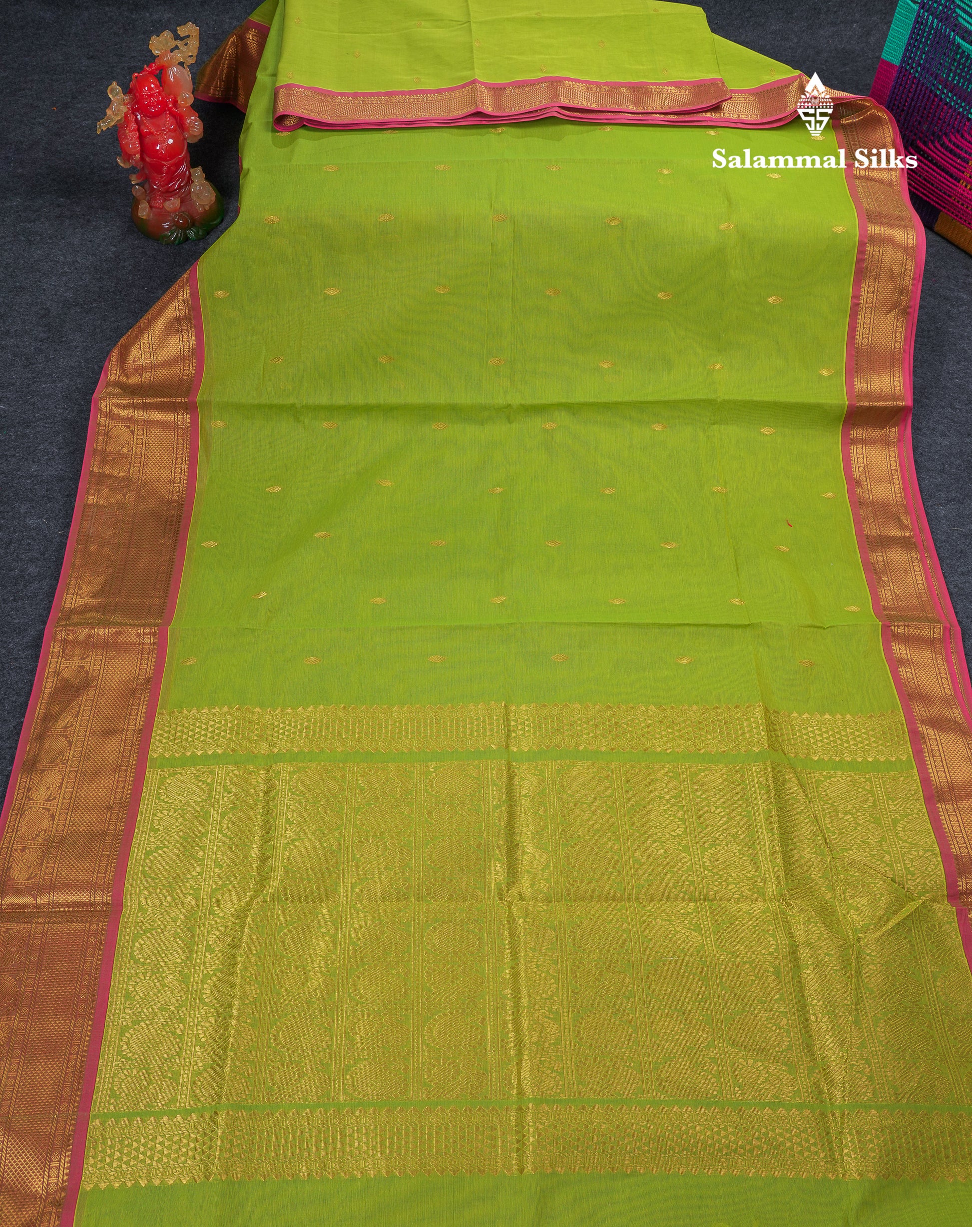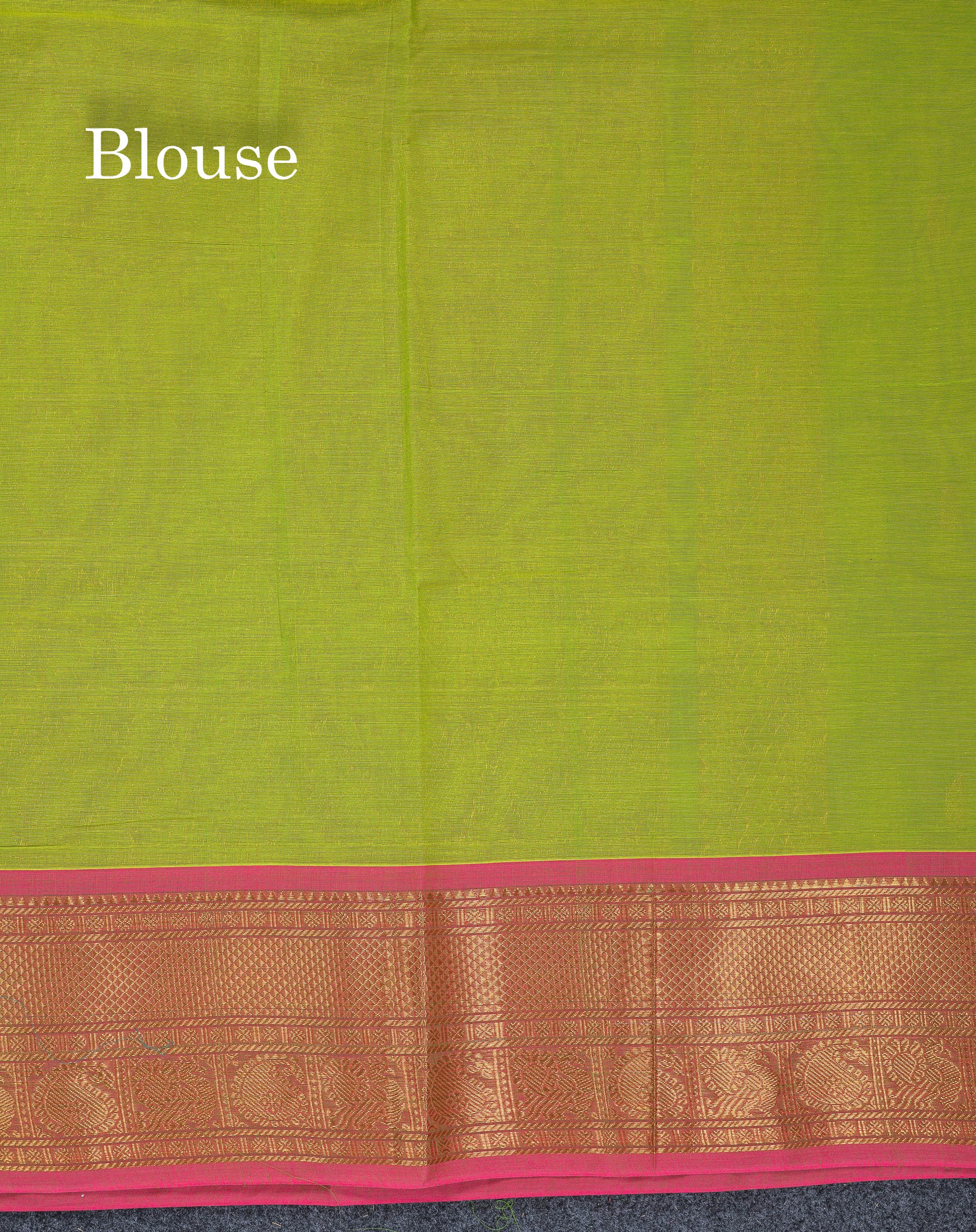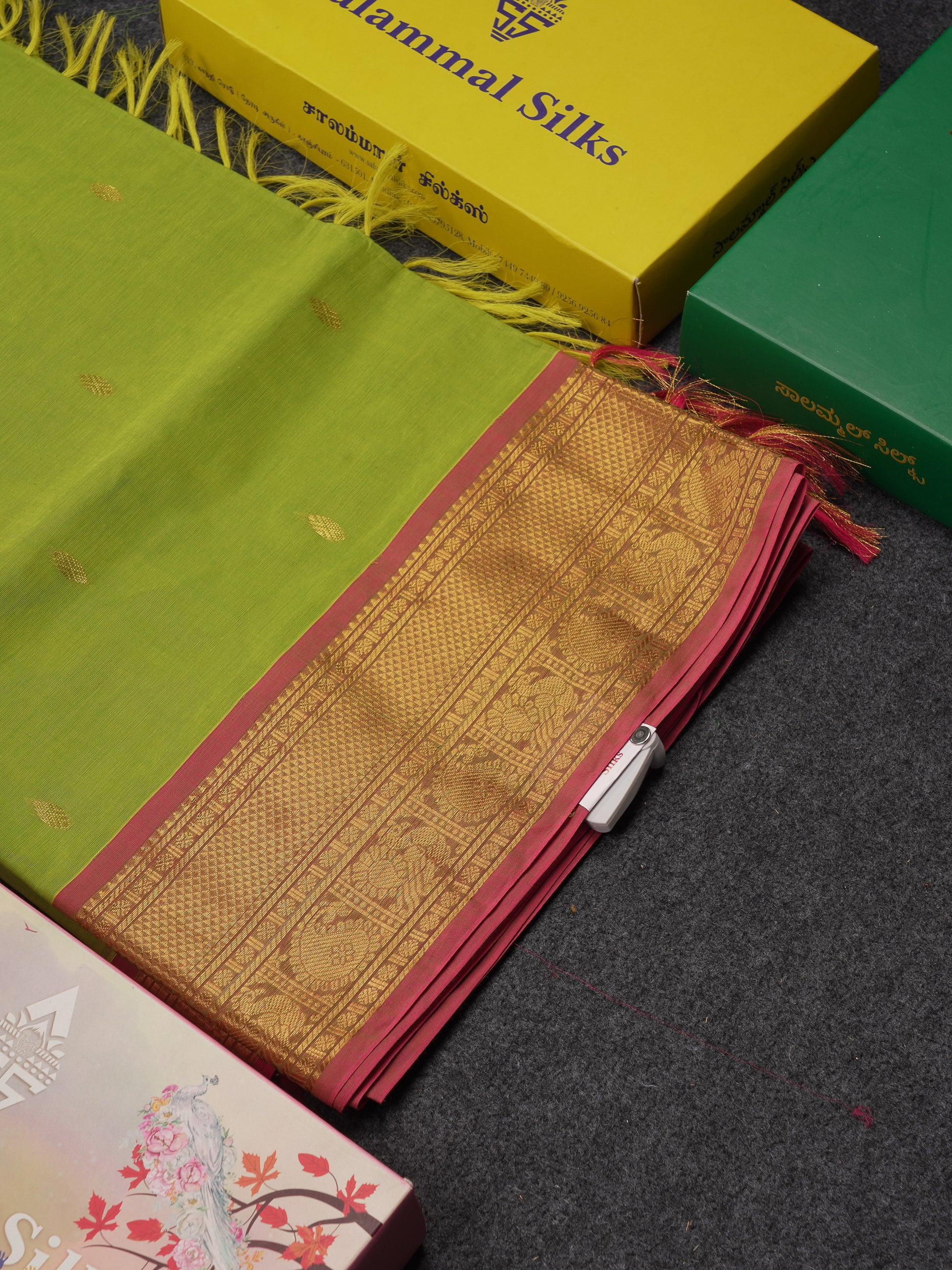 Beautiful Parrot Green Pure Cotton Saree With Contrast Pink Traditional Border