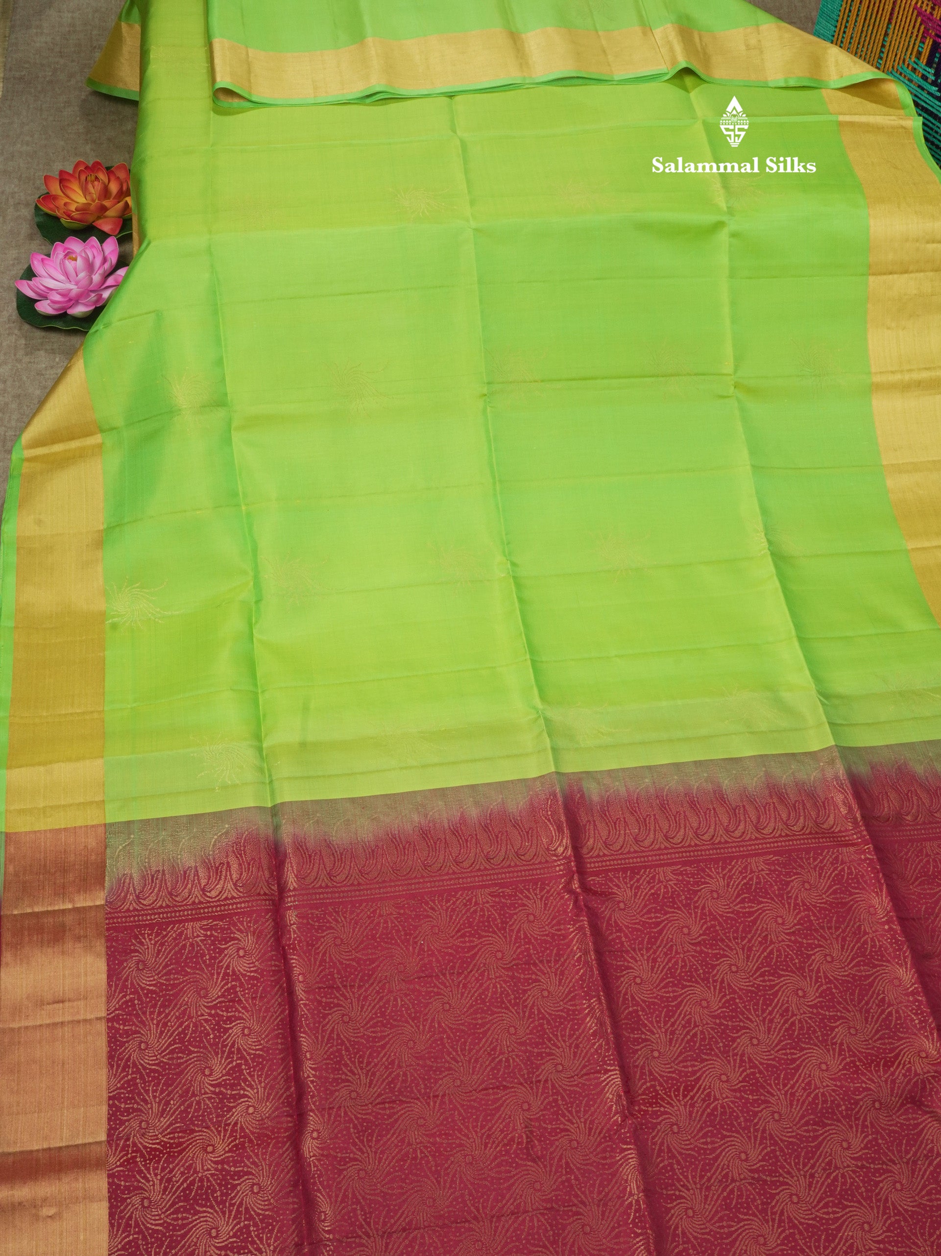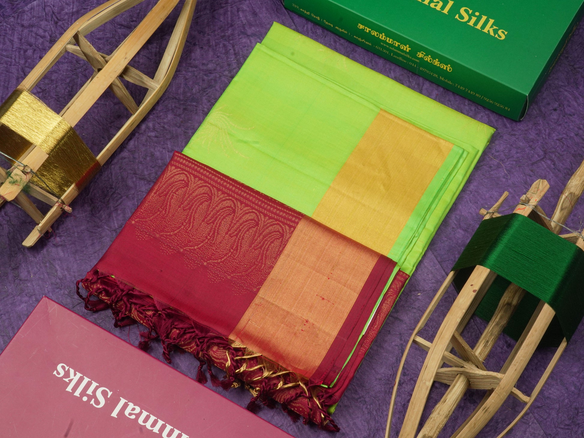 Salammal is known for its handloom sarees. In some sarees, there is cross-weaving between the body and the pallu, which is a sign of pure handloom sarees. This can be seen in Kanchipuram embossed sarees.