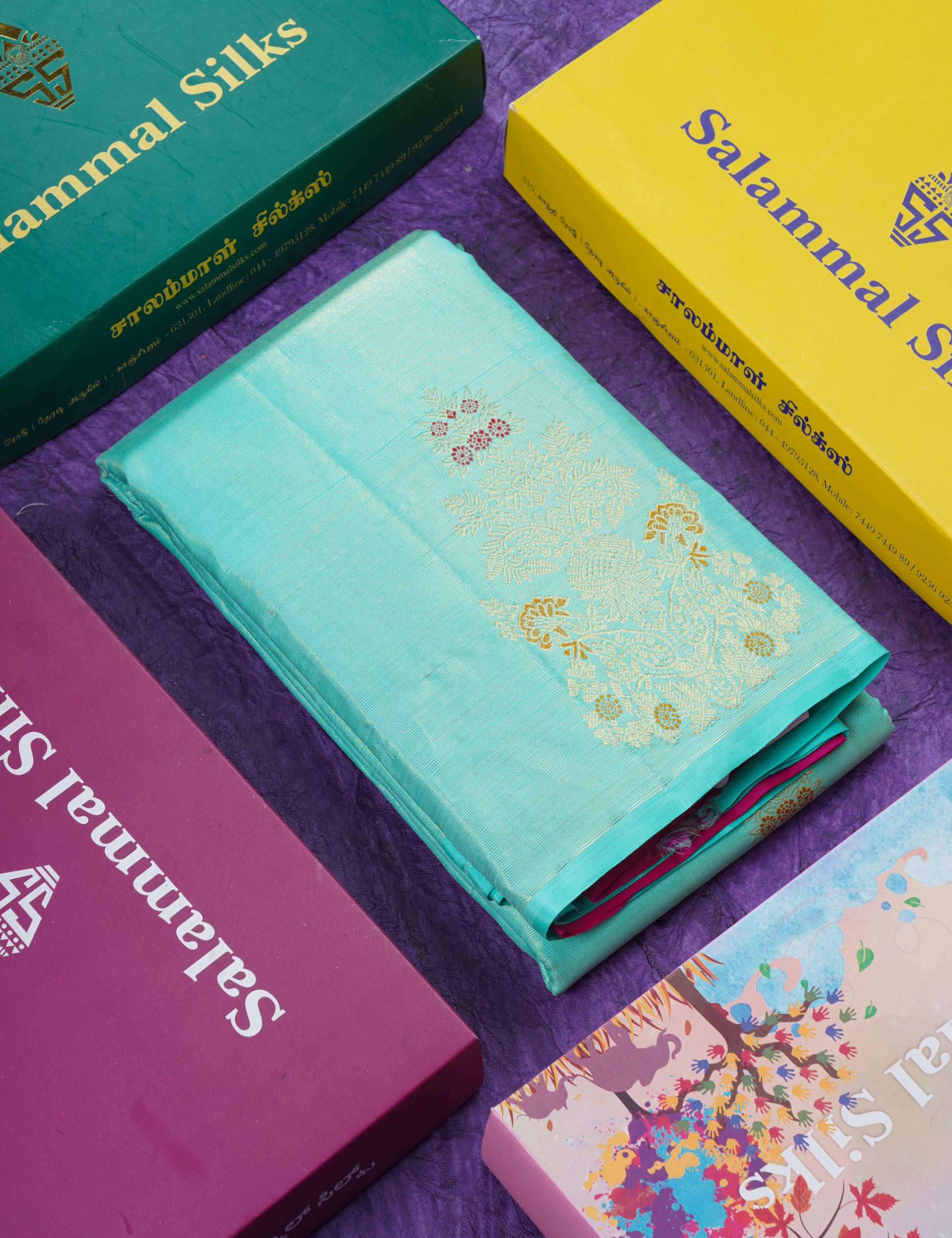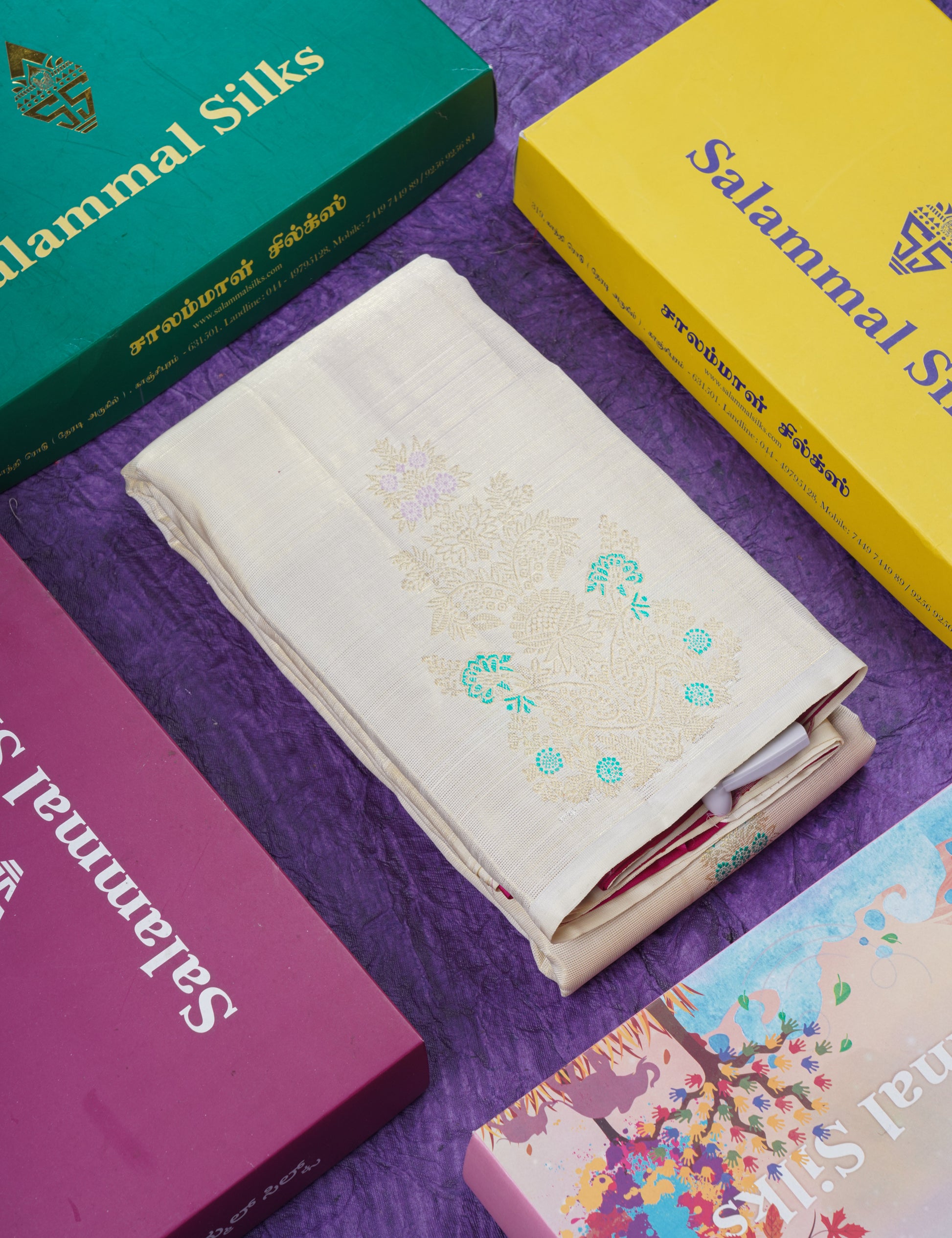 Salammal is known for its handloom sarees. In some sarees, there is cross-weaving between the body and the pallu, which is a sign of pure handloom sarees. This can be seen in Kanchipuram embossed sarees.
