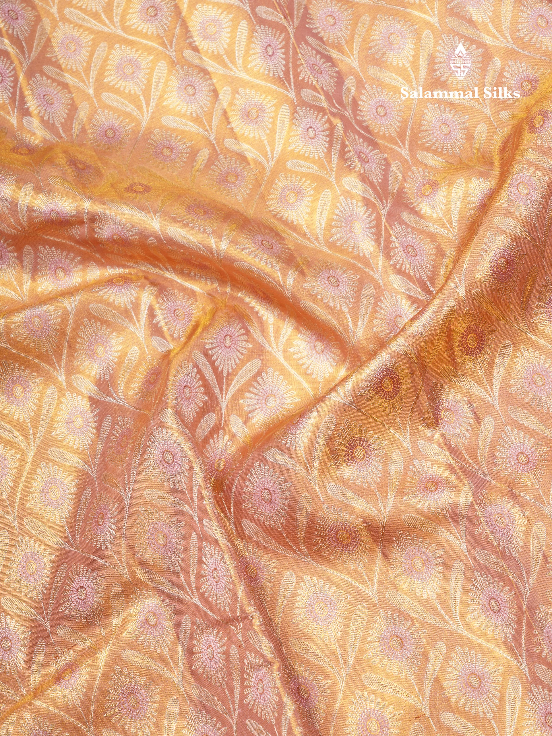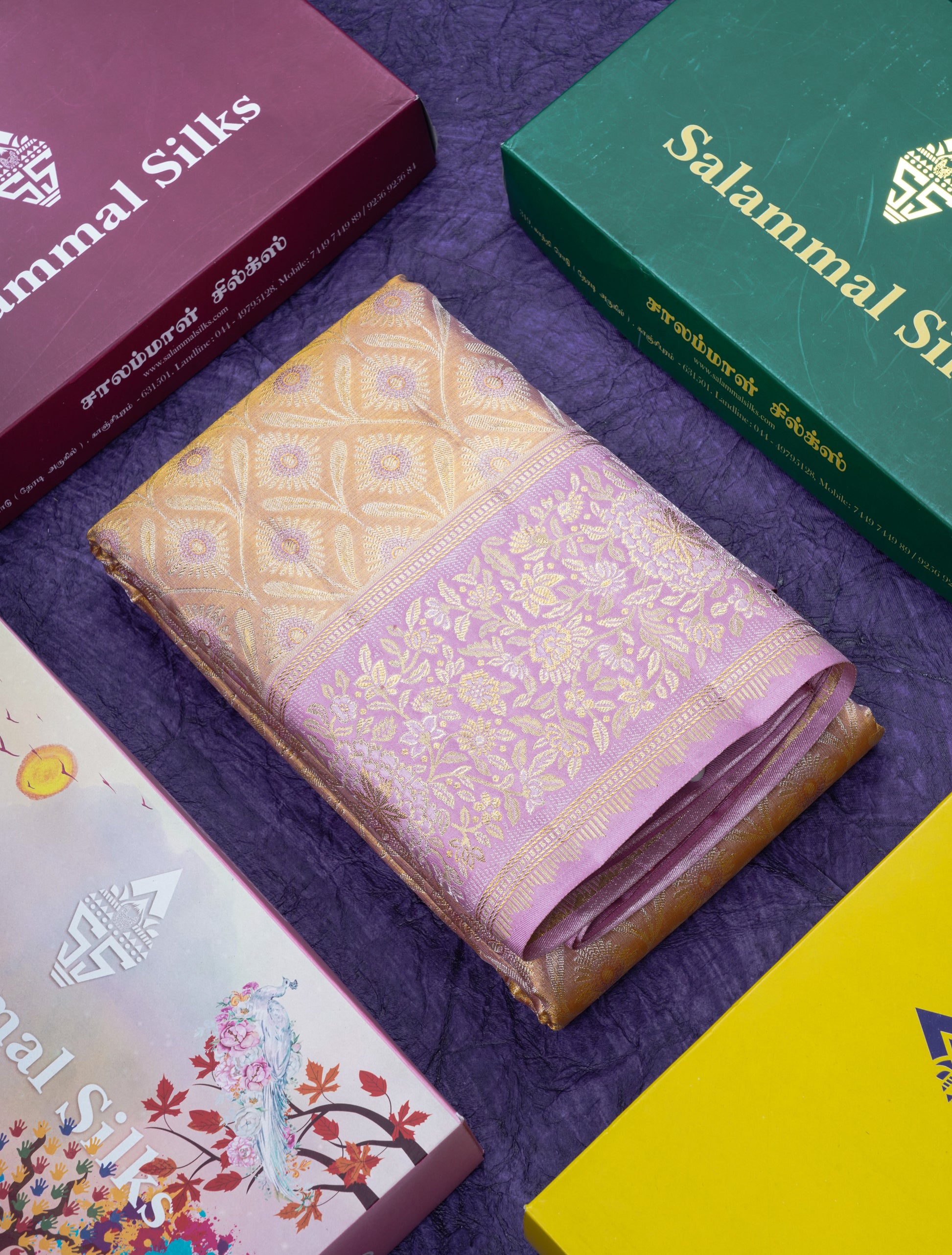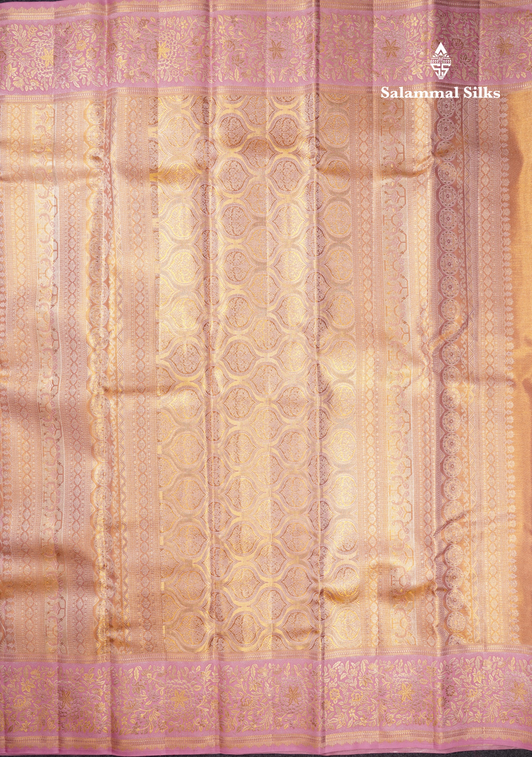 Beautiful Peach Tissue Bridal Pure Kanjivaram Silk Saree With Contrast Lavender Border