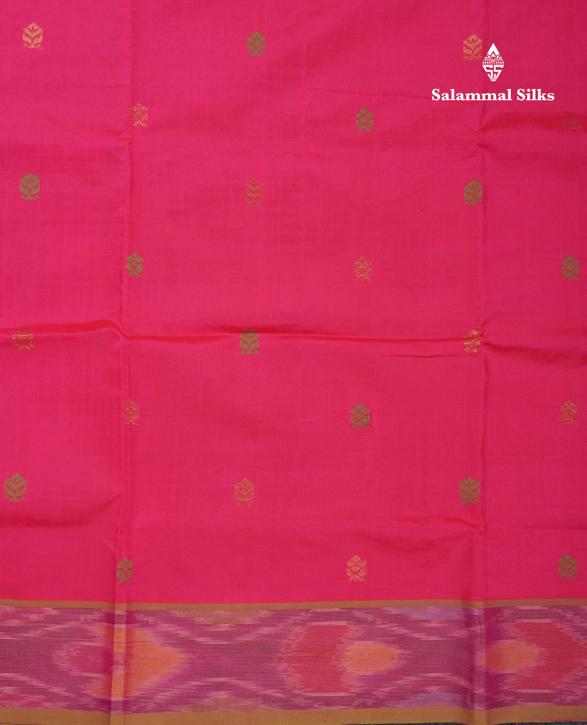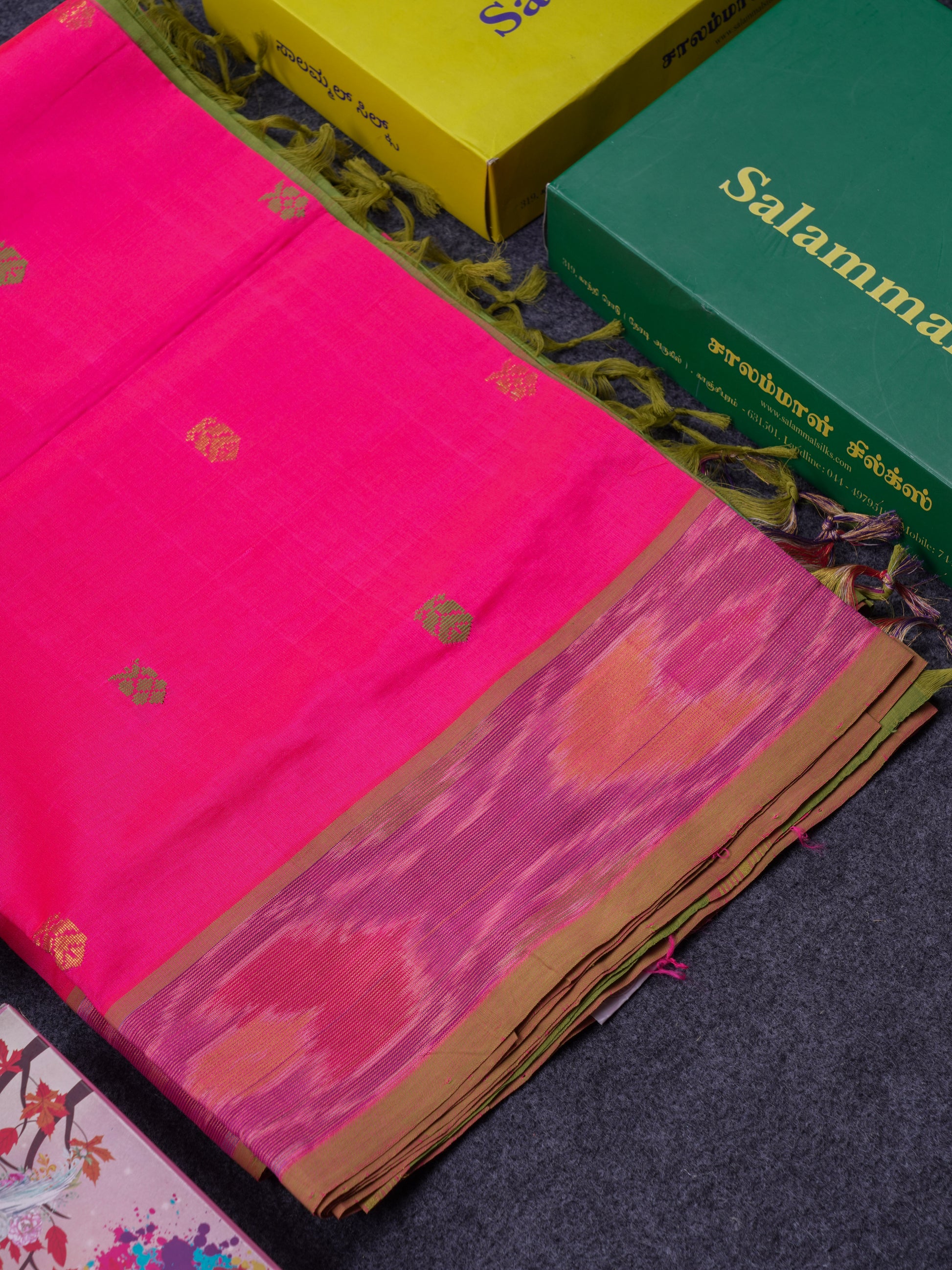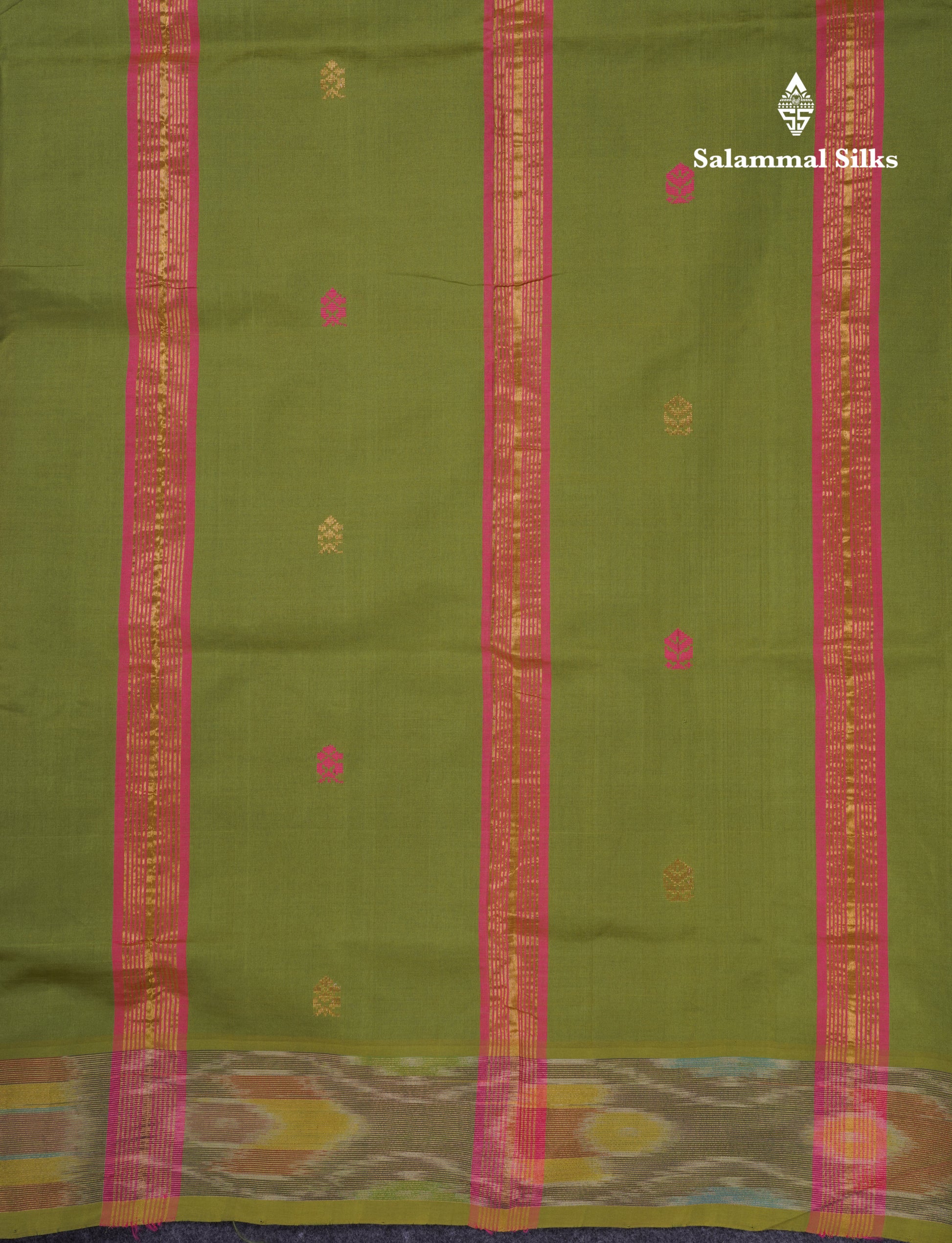 Salammal is known for its handloom sarees. In some sarees, there is cross-weaving between the body and the pallu, which is a sign of pure handloom sarees. This can be seen in Kanchipuram embossed sarees.