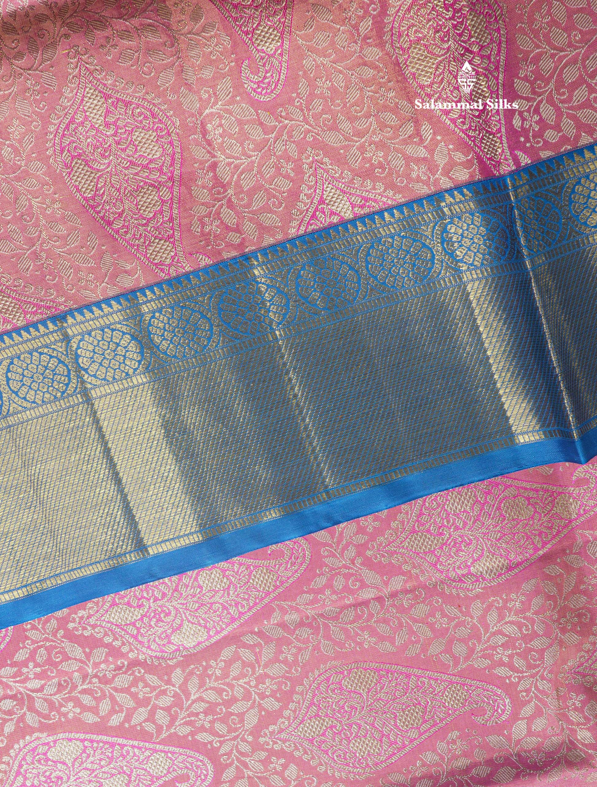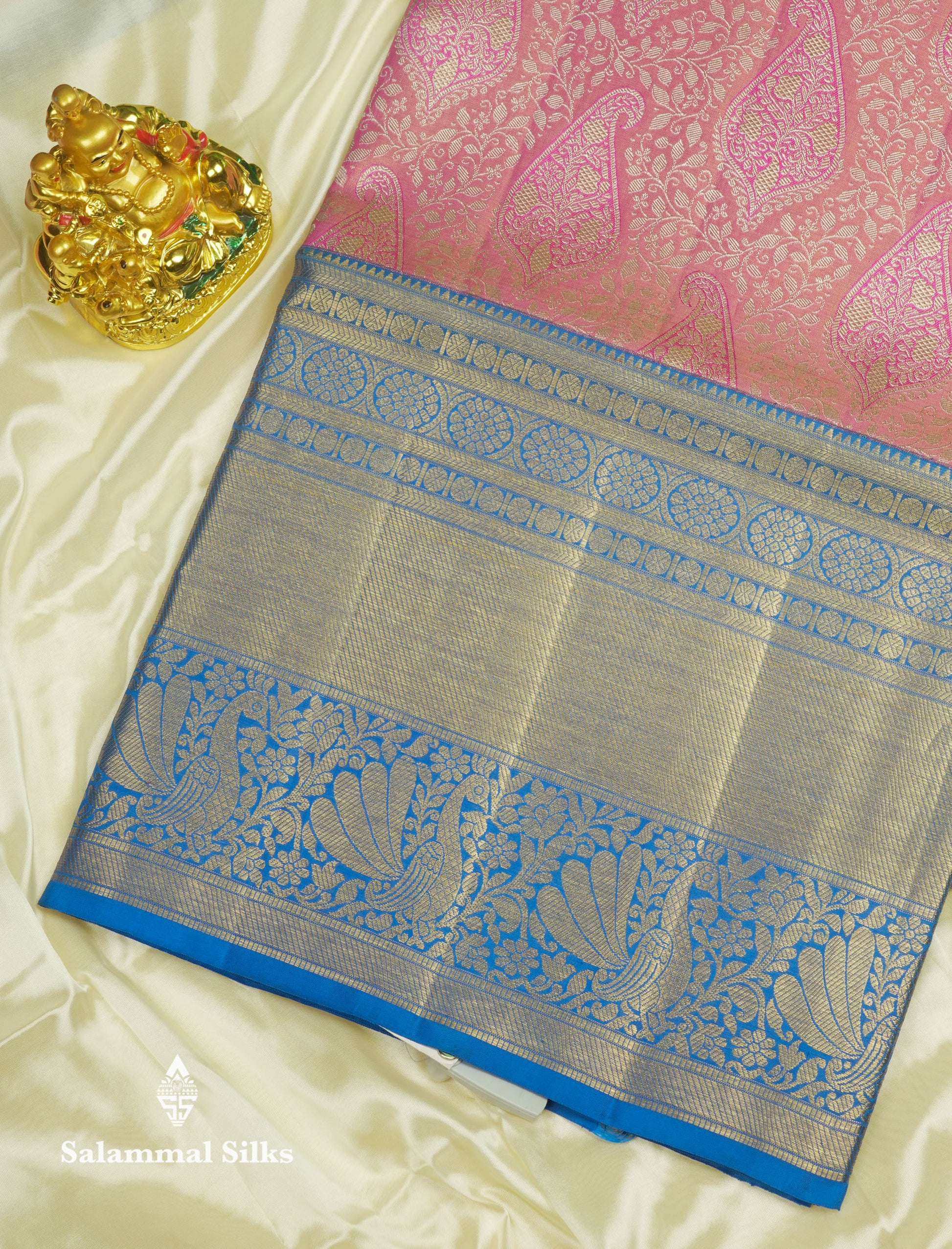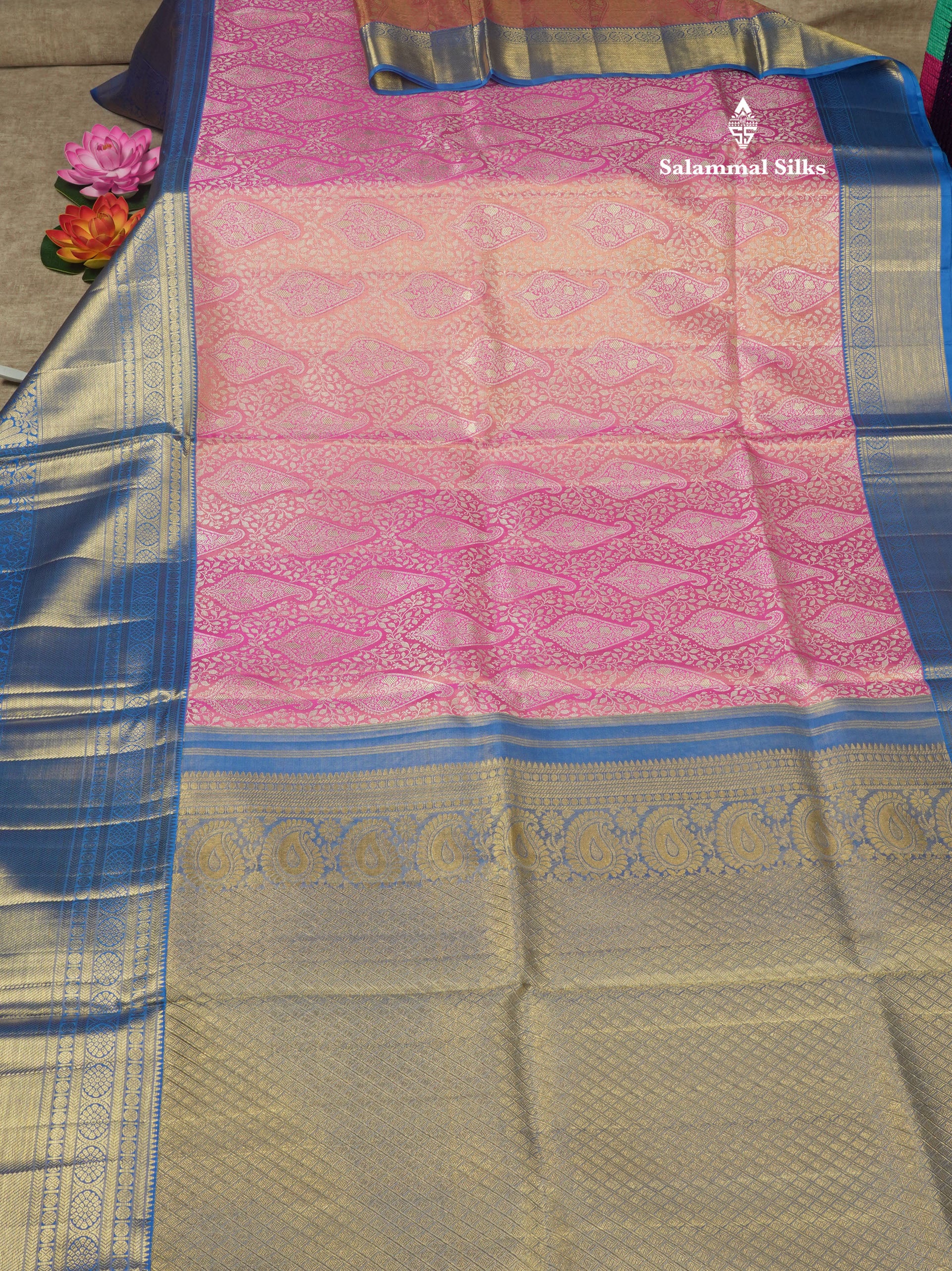 Beautiful Pink Tissue Pure Kanjivaram Silk Saree (2G) Zari With Contrast Royal Blue Border