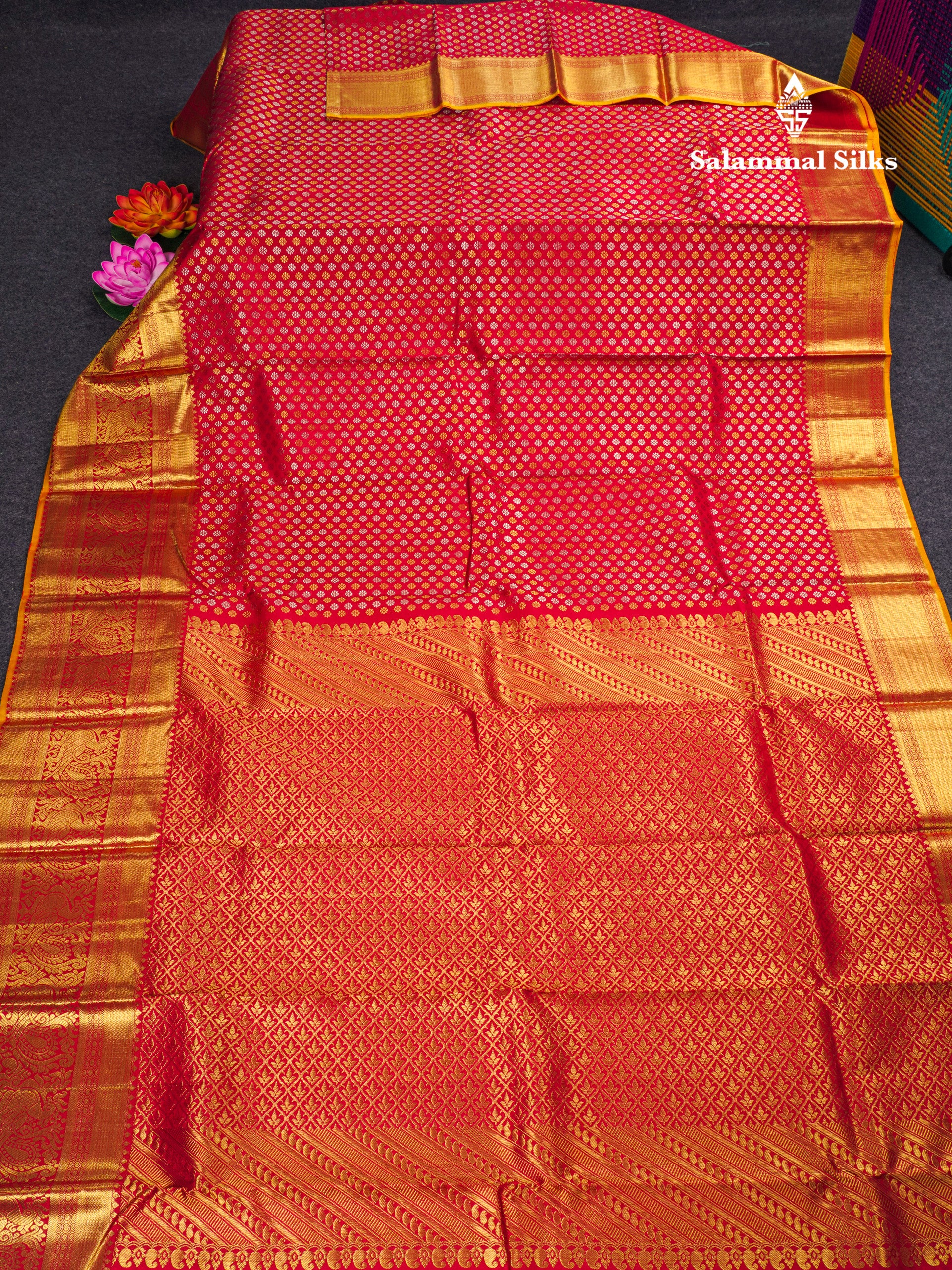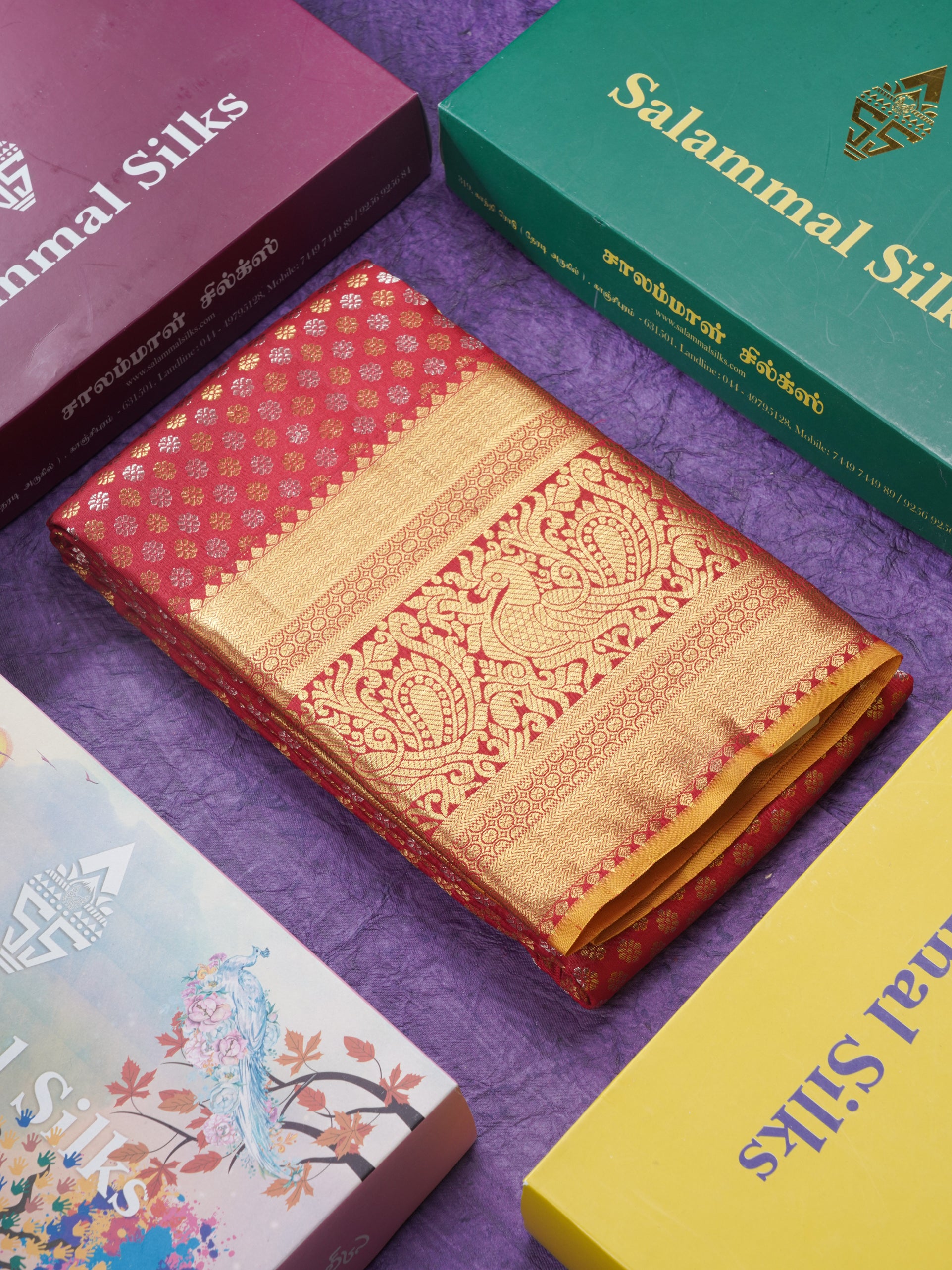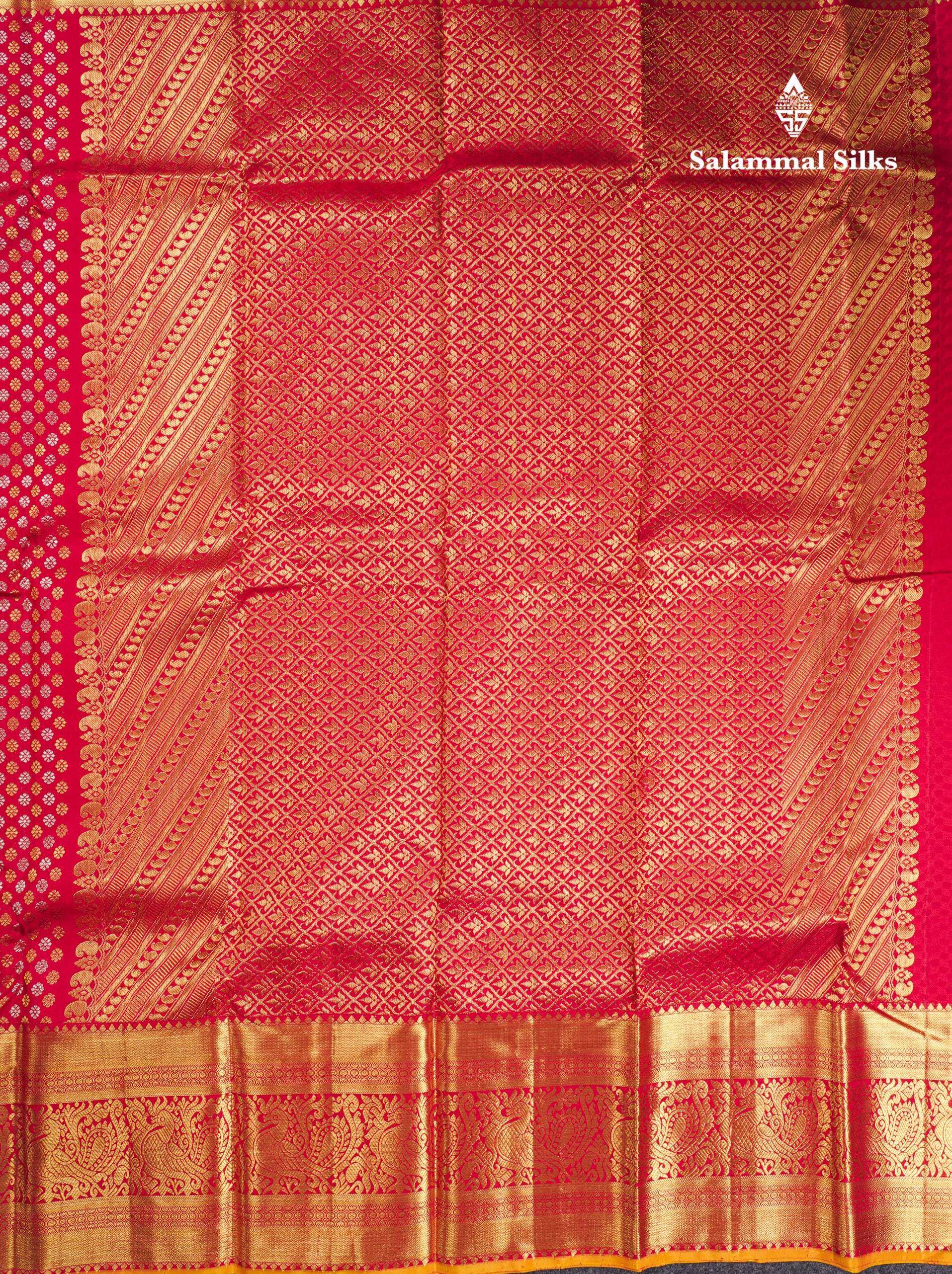 Salammal is known for its handloom sarees. In some sarees, there is cross-weaving between the body and the pallu, which is a sign of pure handloom sarees. This can be seen in Kanchipuram embossed sarees.