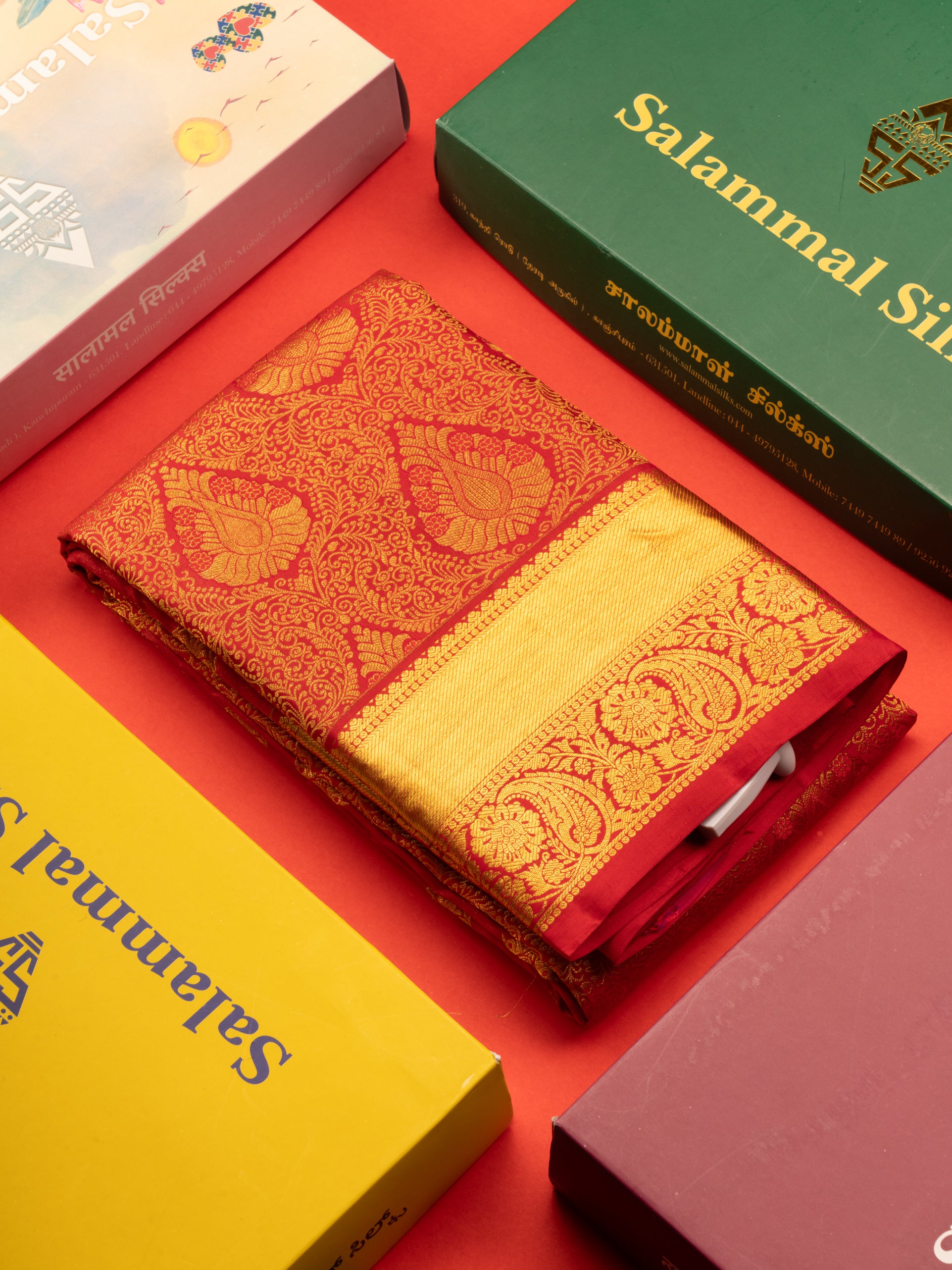Salammal is known for its handloom sarees. In some sarees, there is cross-weaving between the body and the pallu, which is a sign of pure handloom sarees. This can be seen in Kanchipuram embossed sarees.