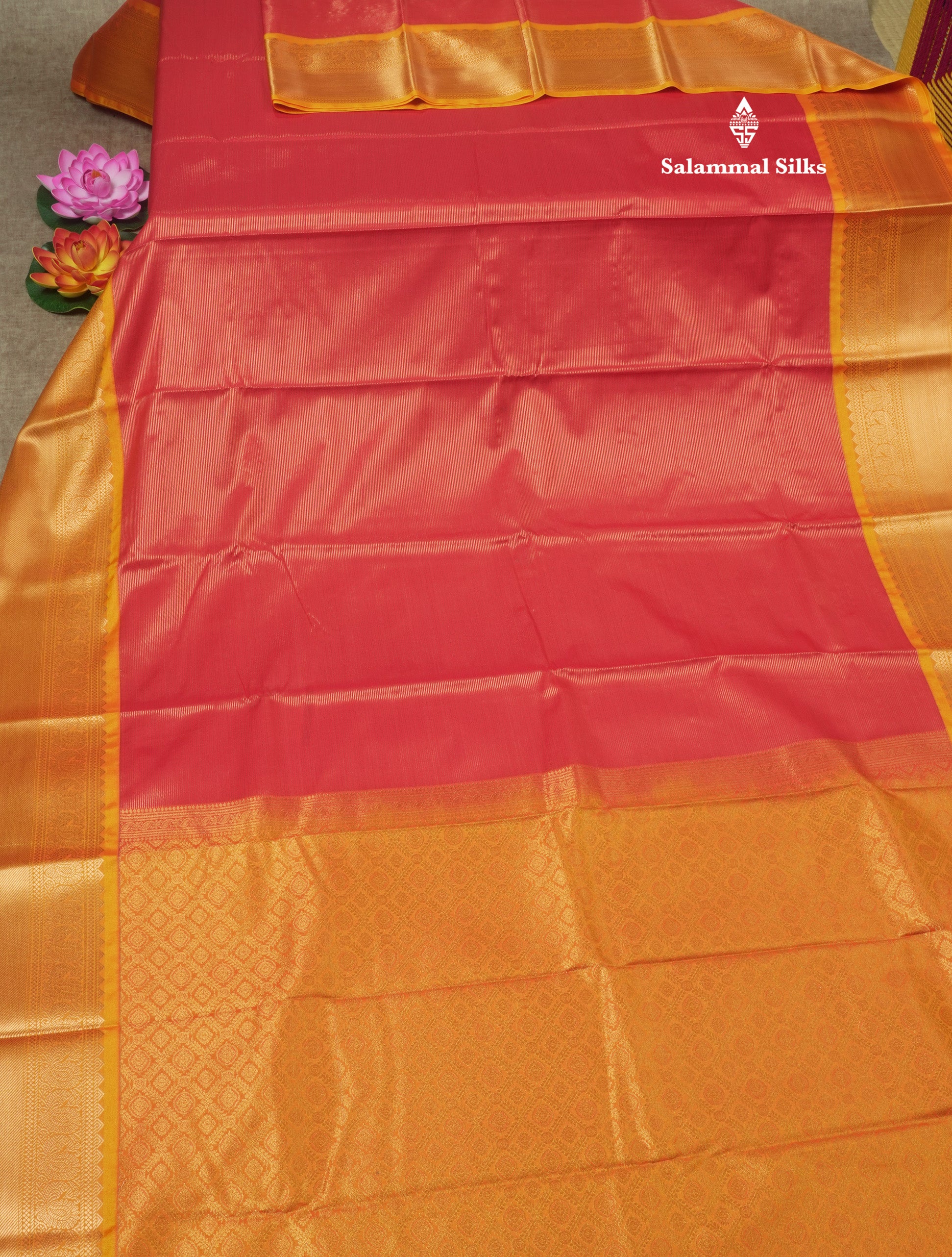 Salammal is known for its handloom sarees. In some sarees, there is cross-weaving between the body and the pallu, which is a sign of pure handloom sarees. This can be seen in Kanchipuram embossed sarees.