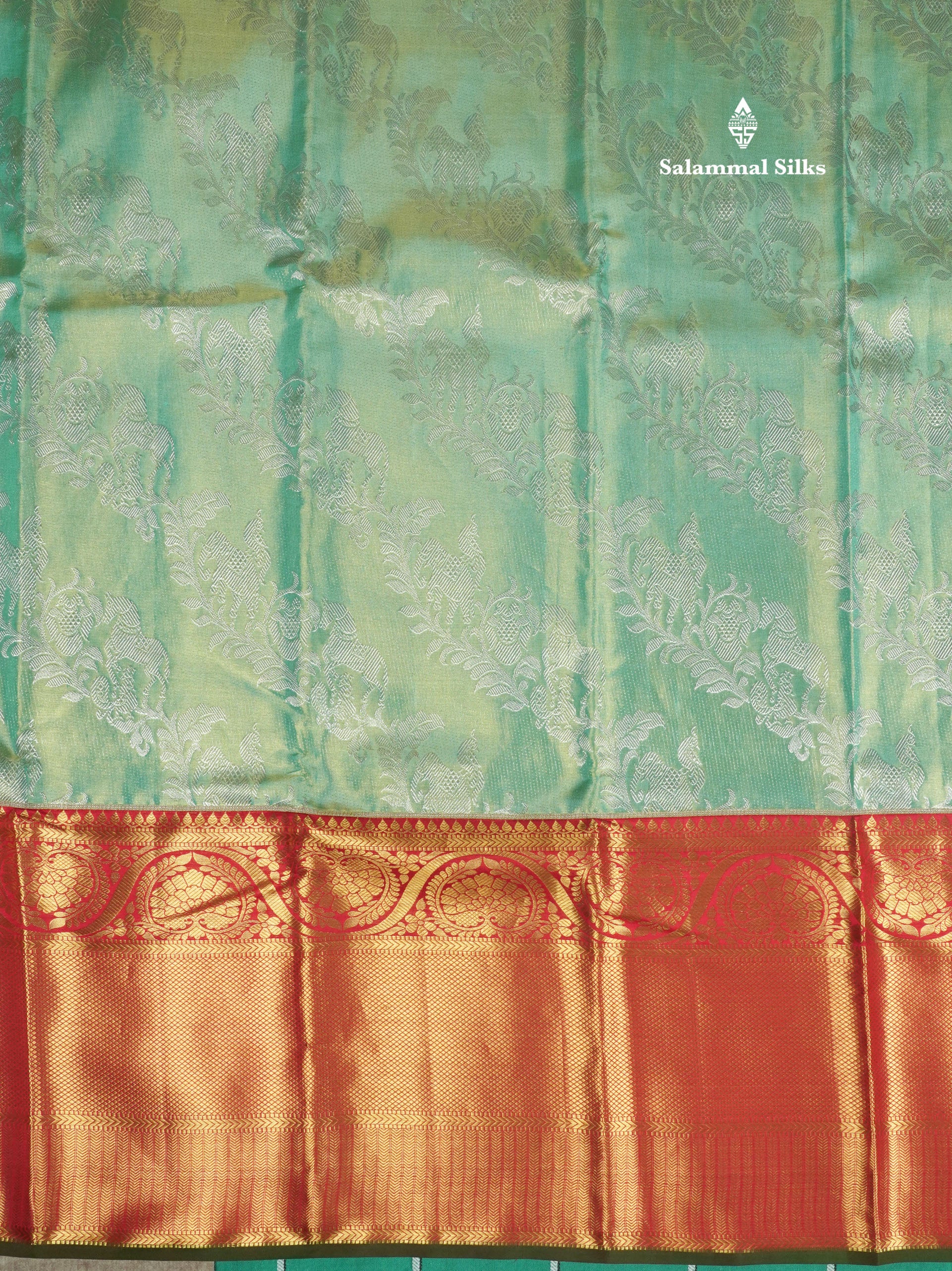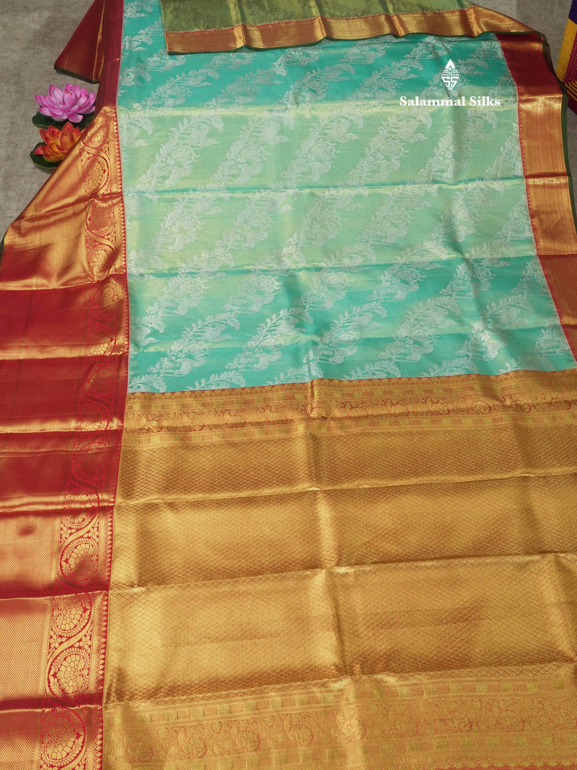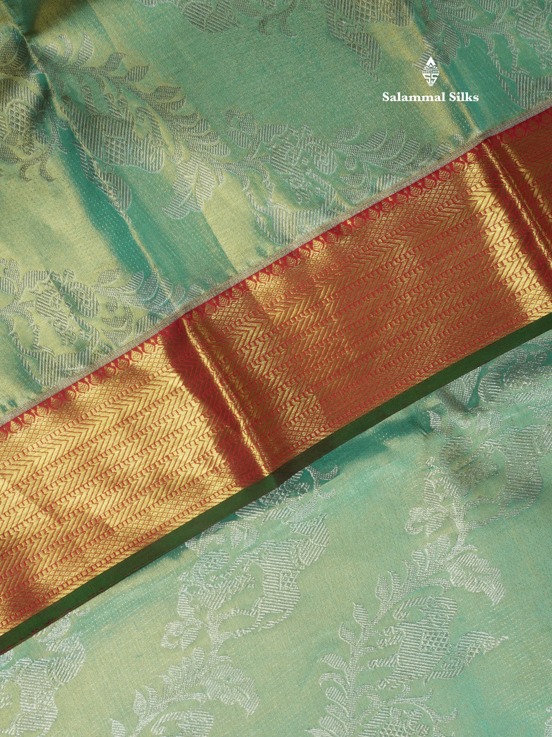 Beautiful Rexona Green Tissue Pure Kanjivaram Silk Saree With Contrast Red Border