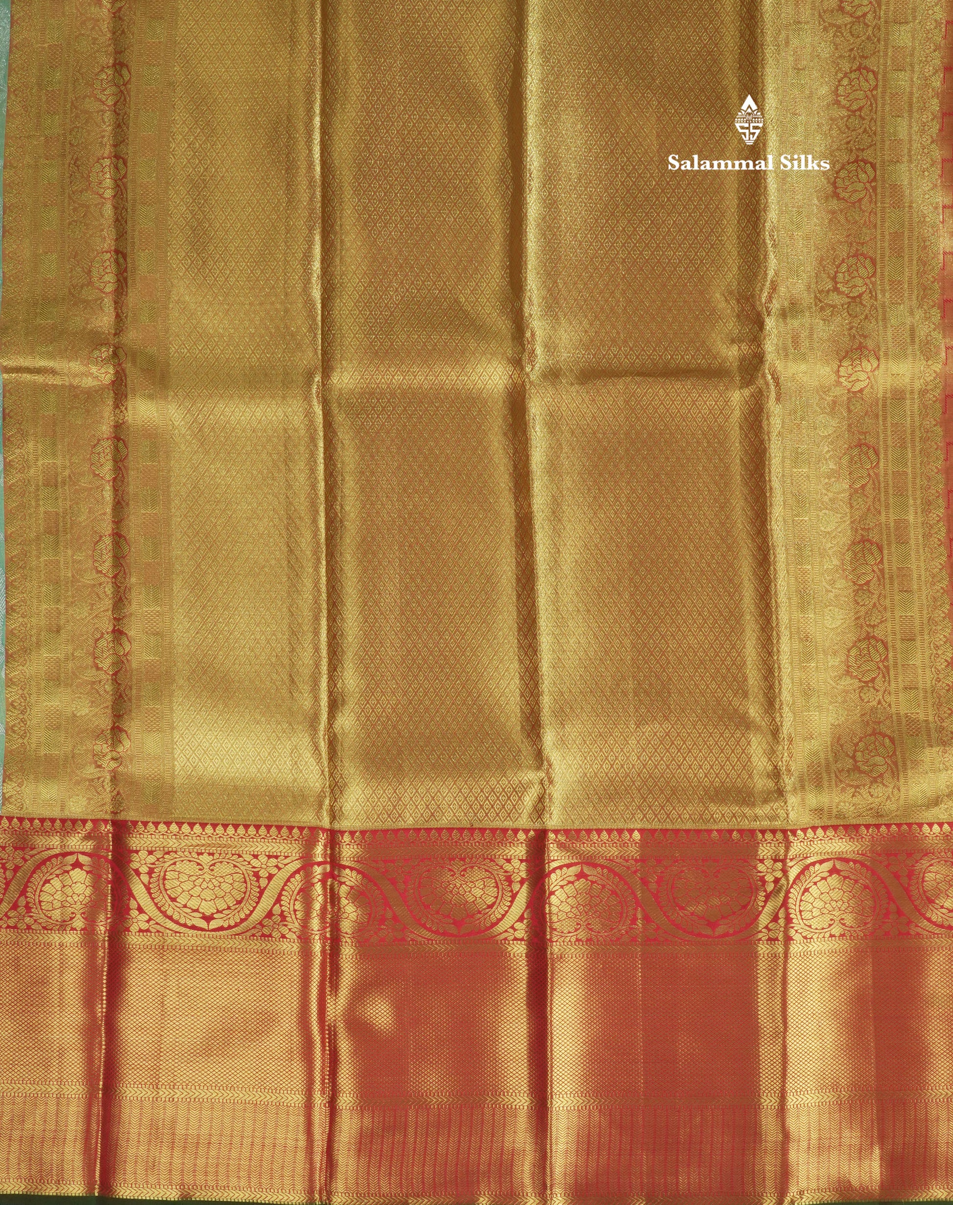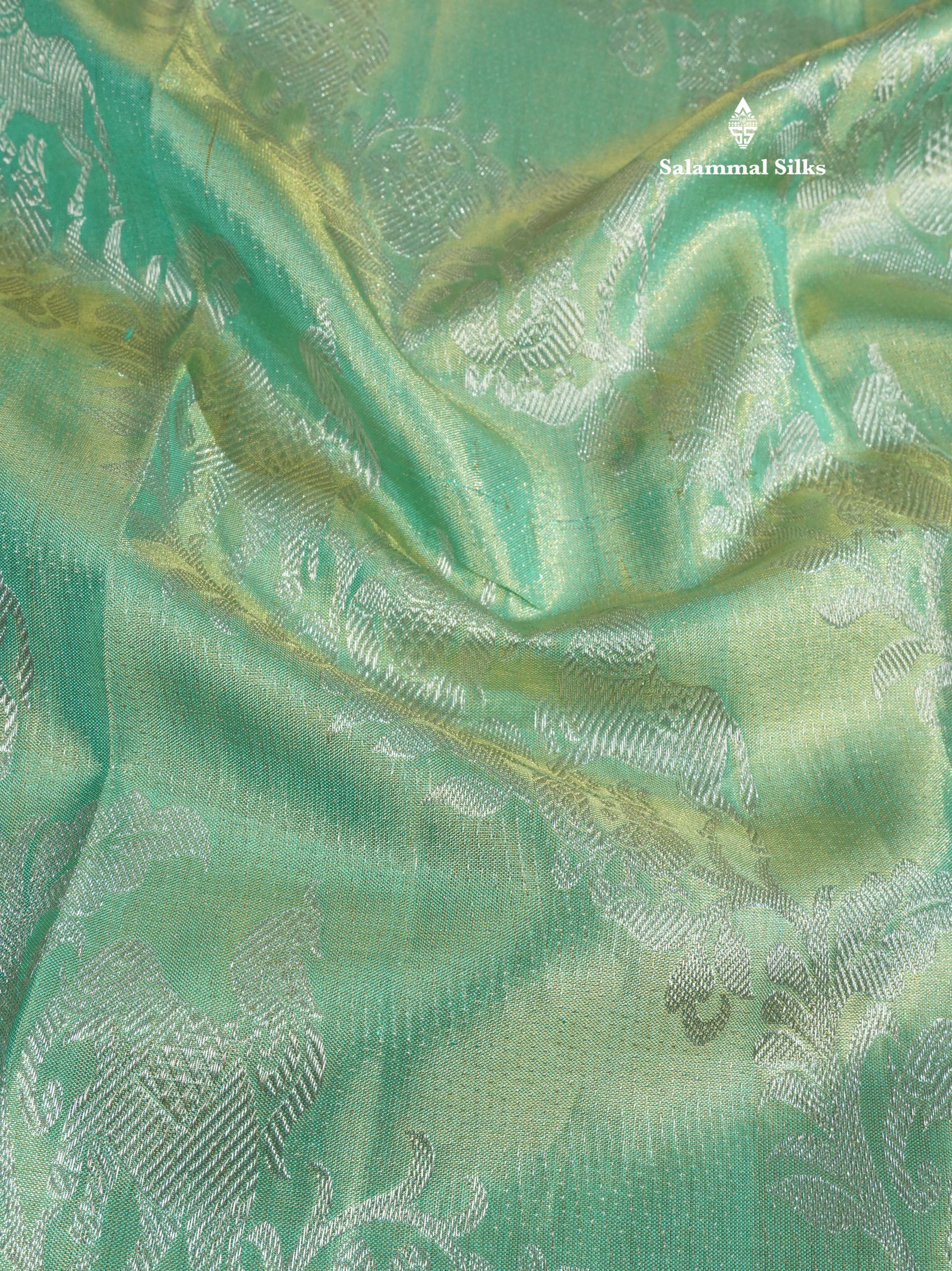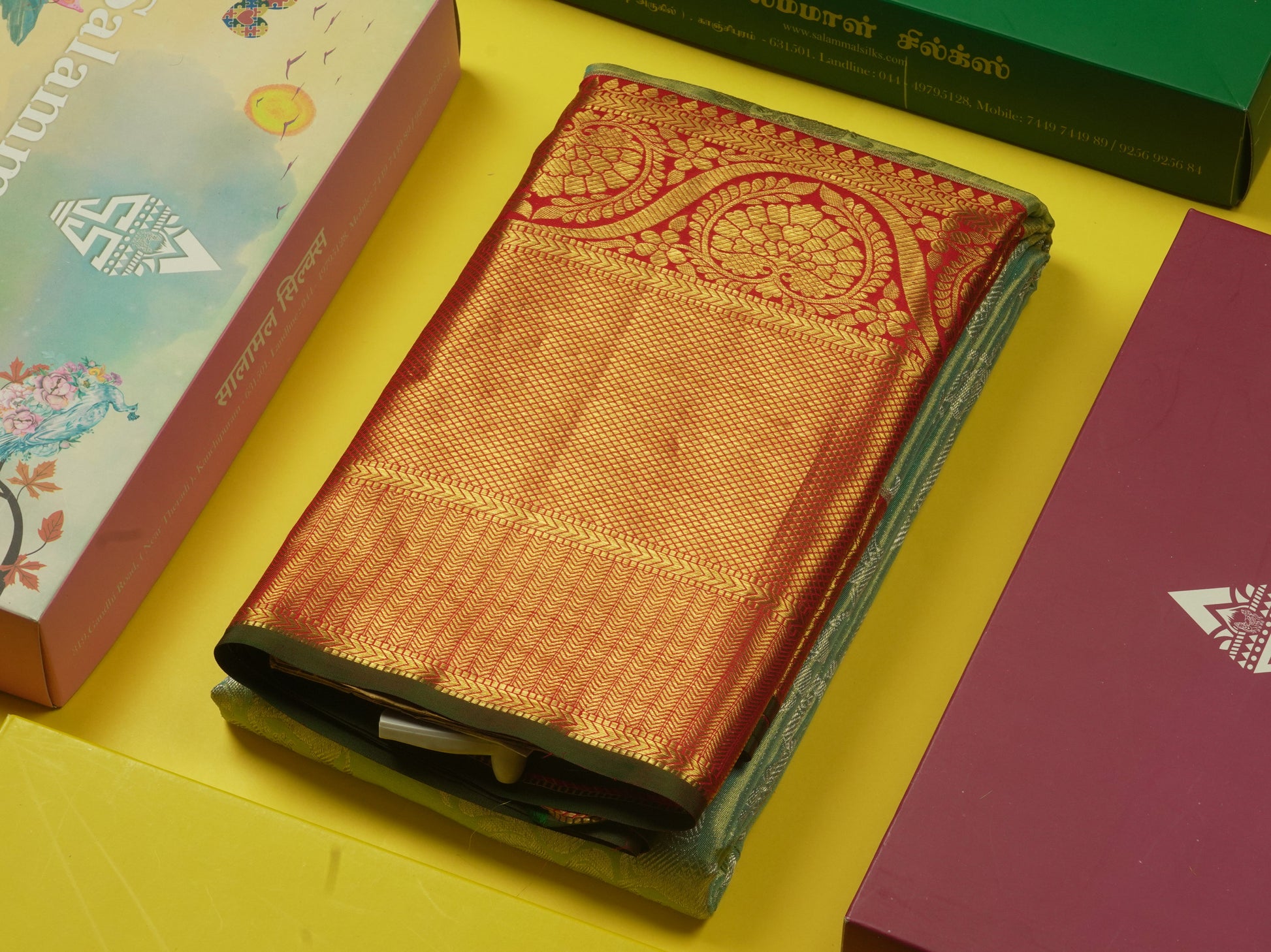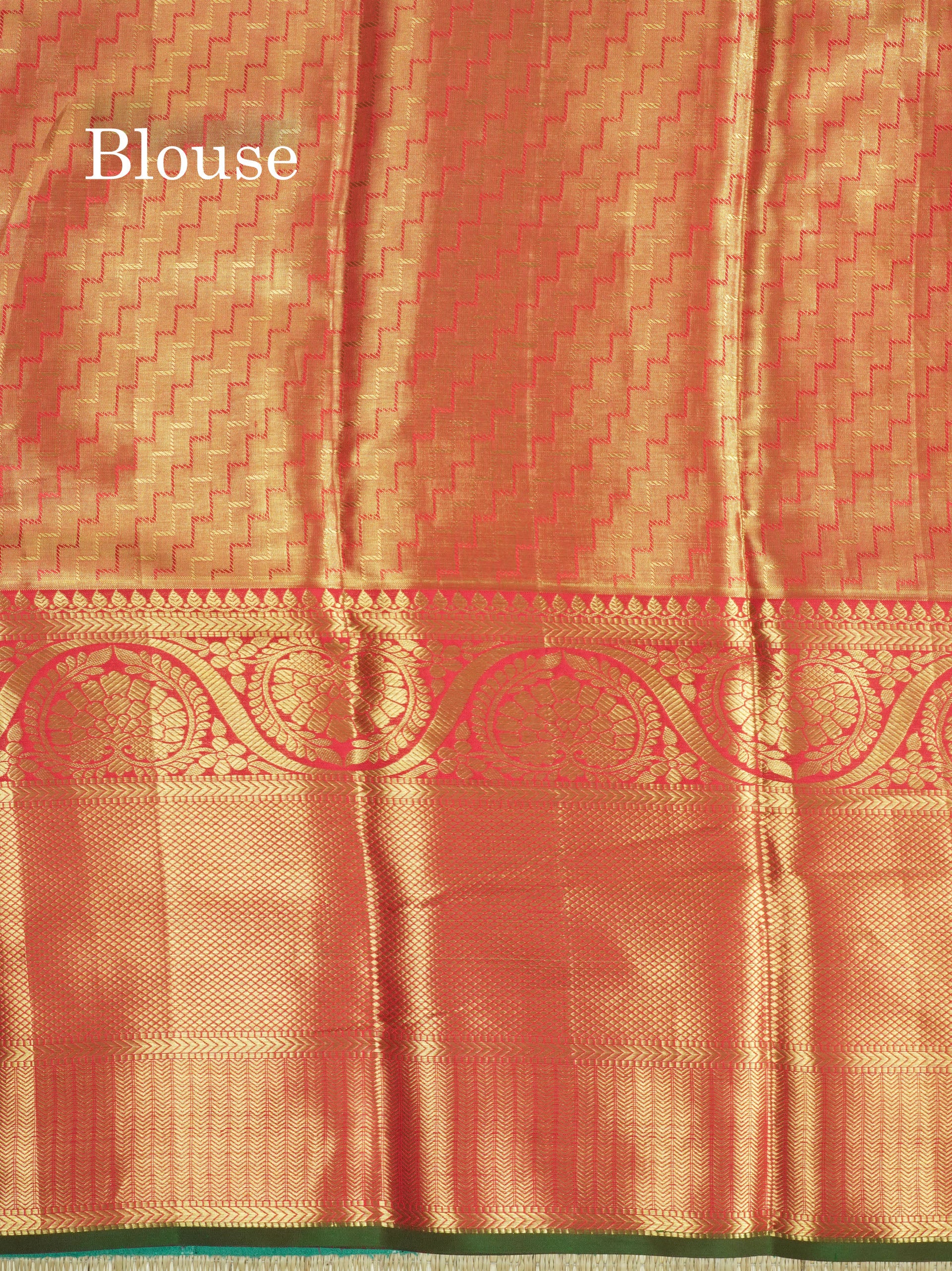 Beautiful Rexona Green Tissue Pure Kanjivaram Silk Saree With Contrast Red Border