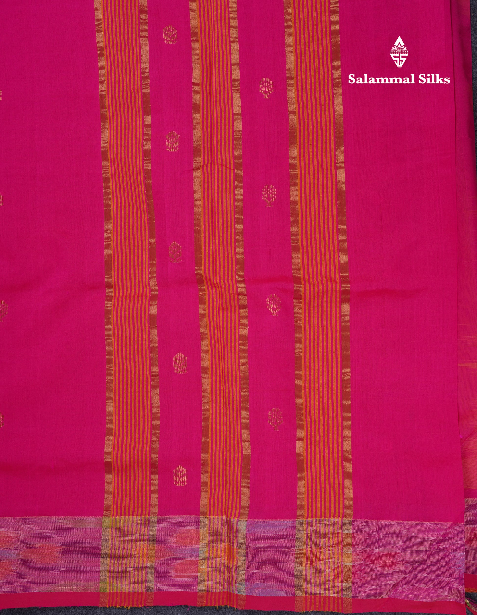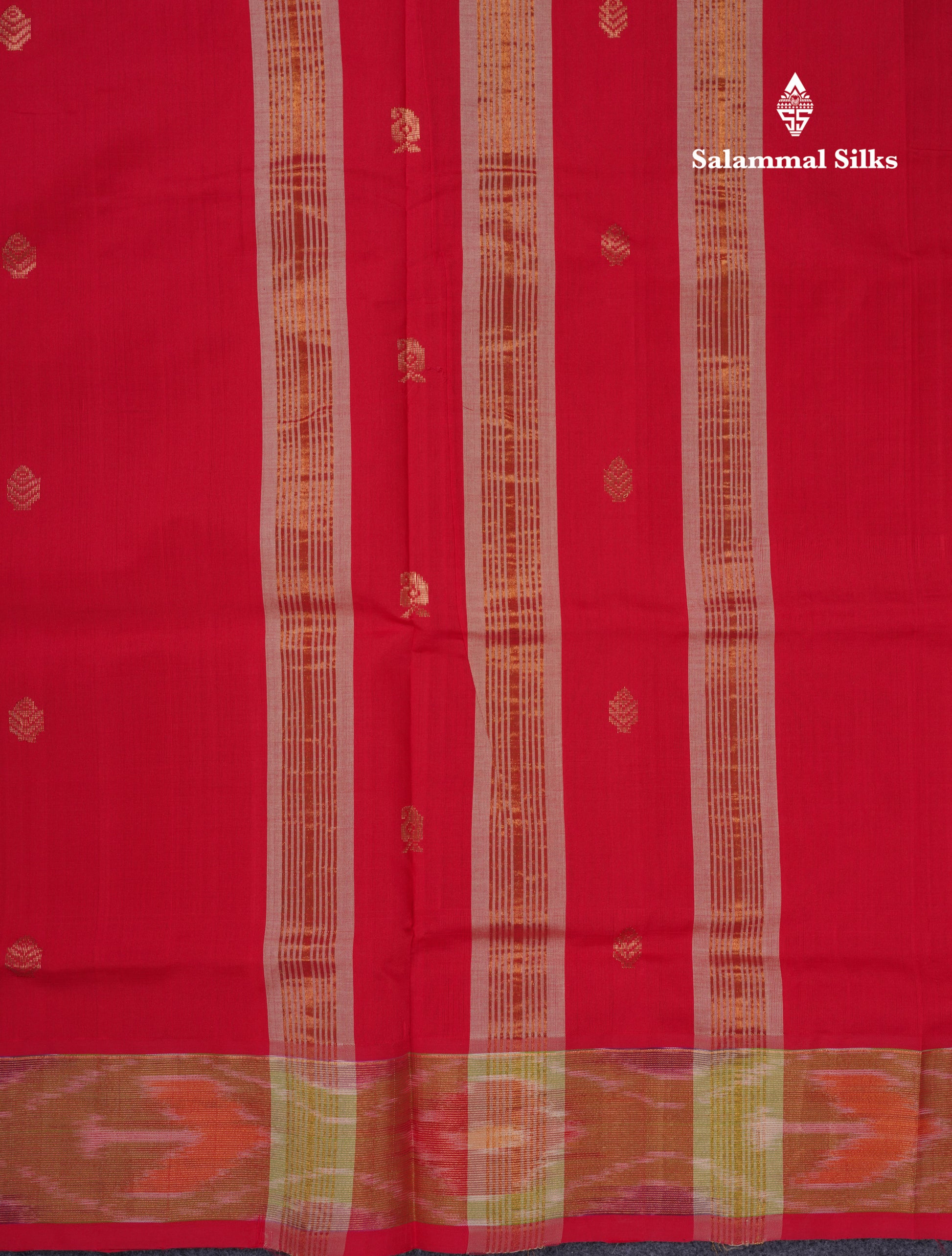 Salammal is known for its handloom sarees. In some sarees, there is cross-weaving between the body and the pallu, which is a sign of pure handloom sarees. This can be seen in Kanchipuram embossed sarees.