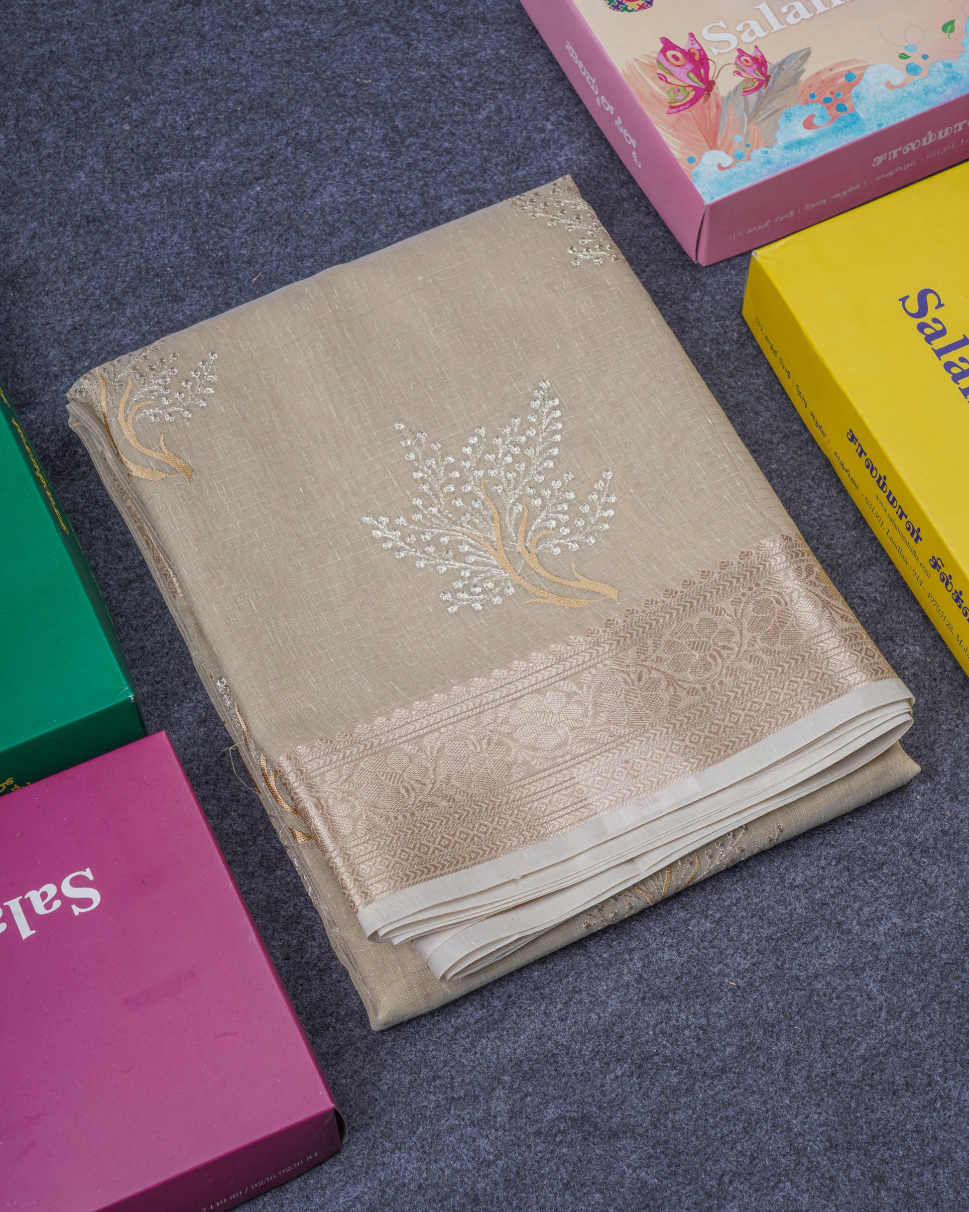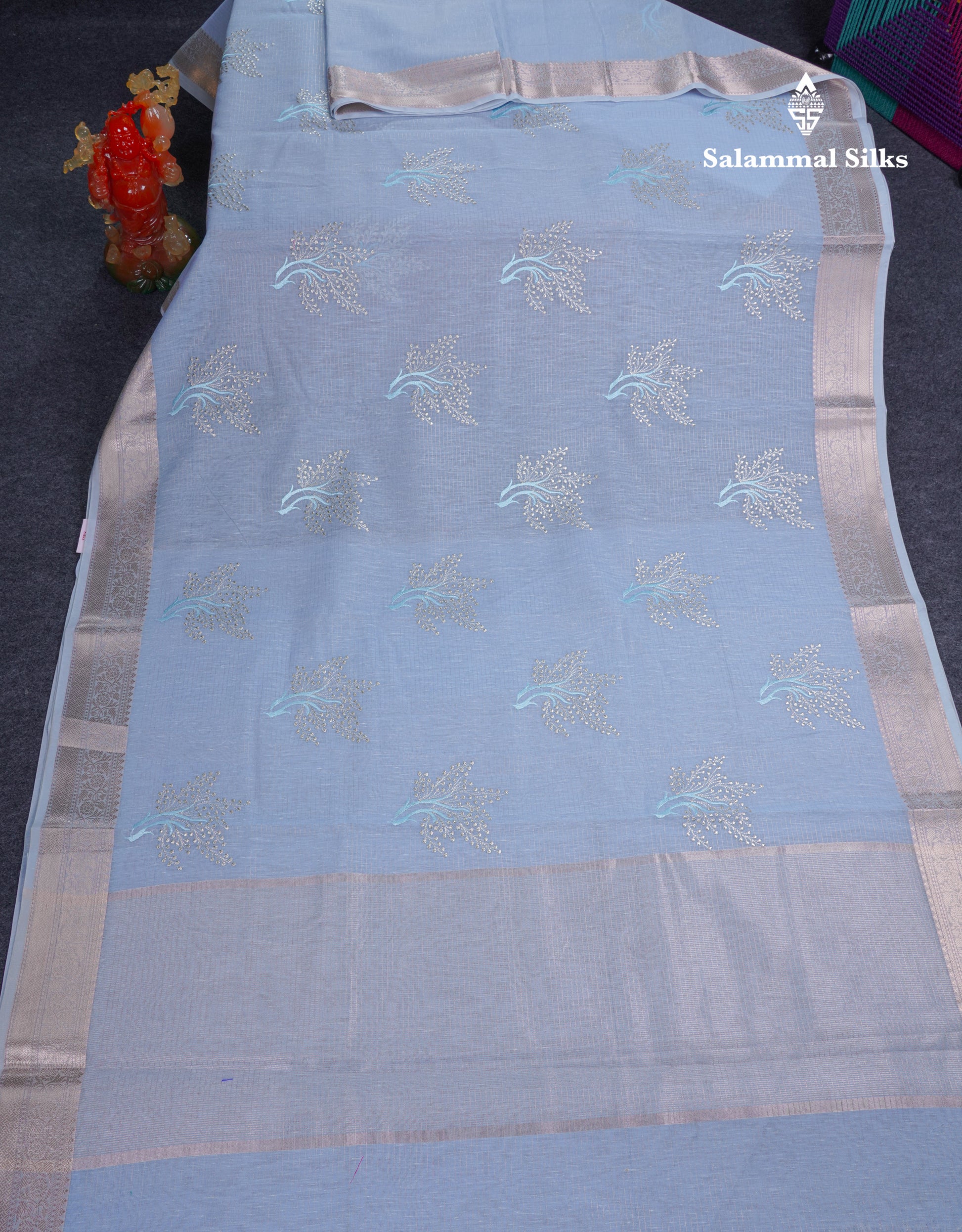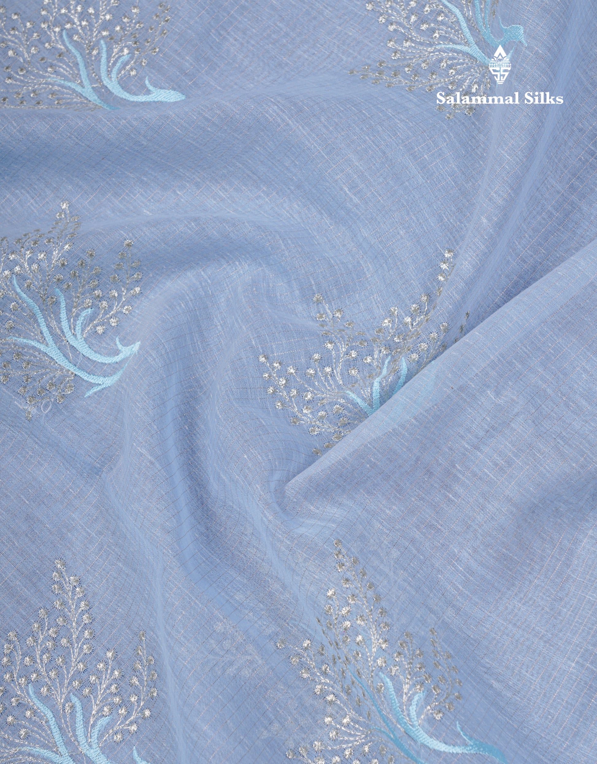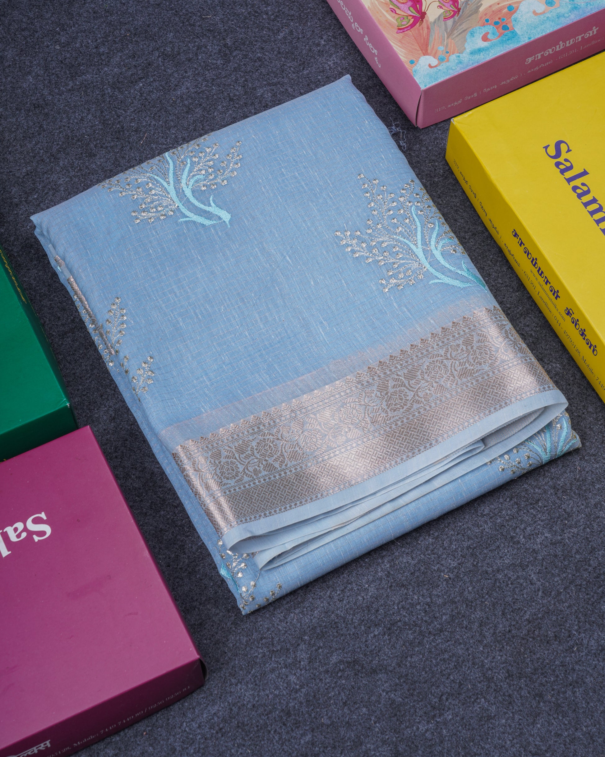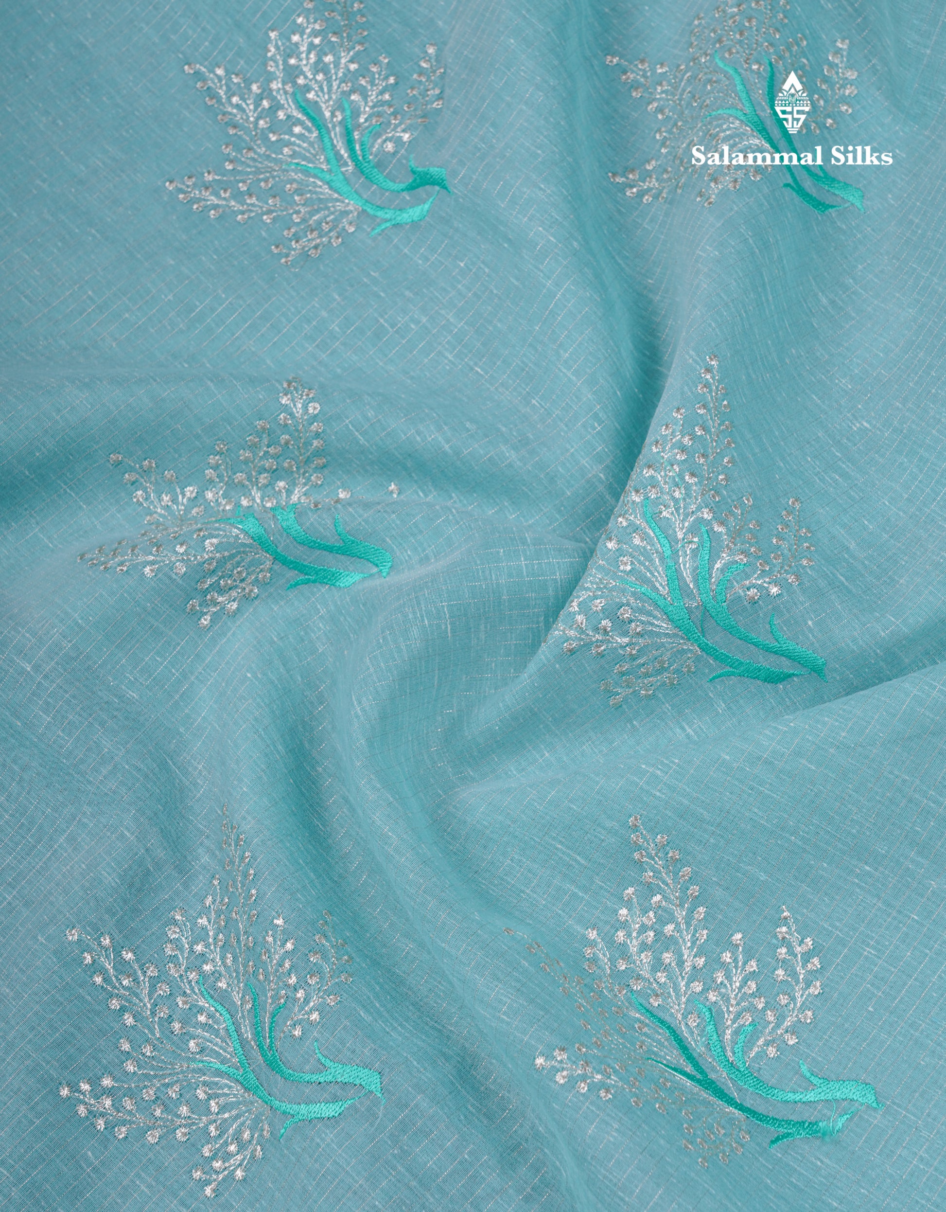 Beautiful Sapphire Green Embroidery Work Mixed Cotton Saree With Small Border