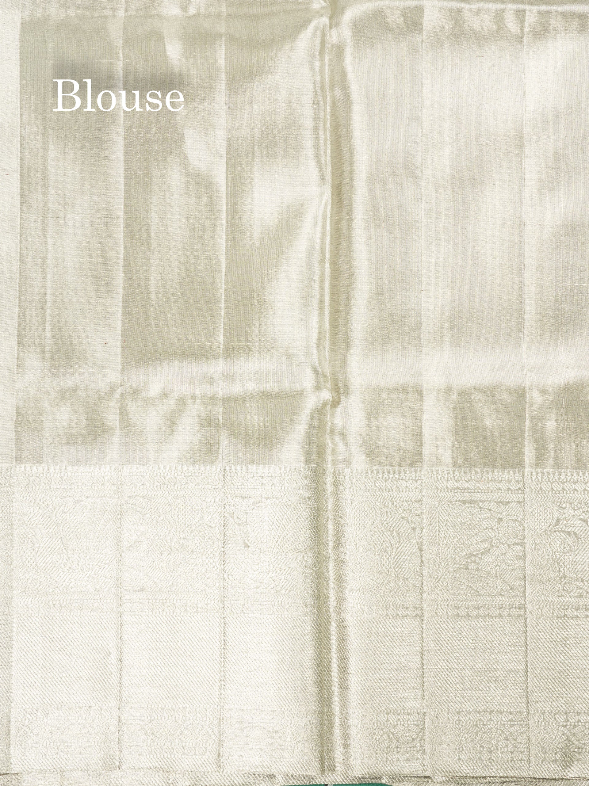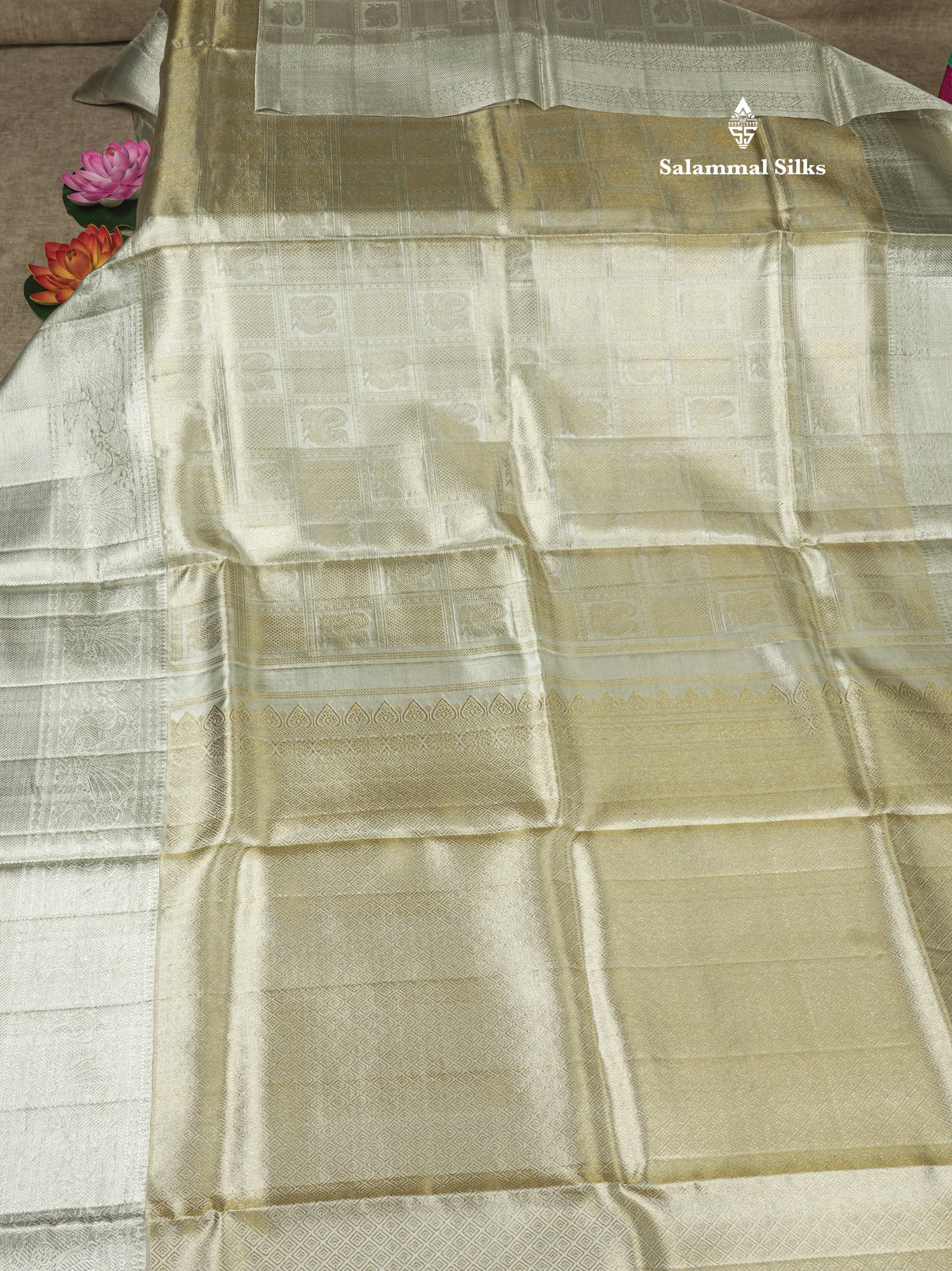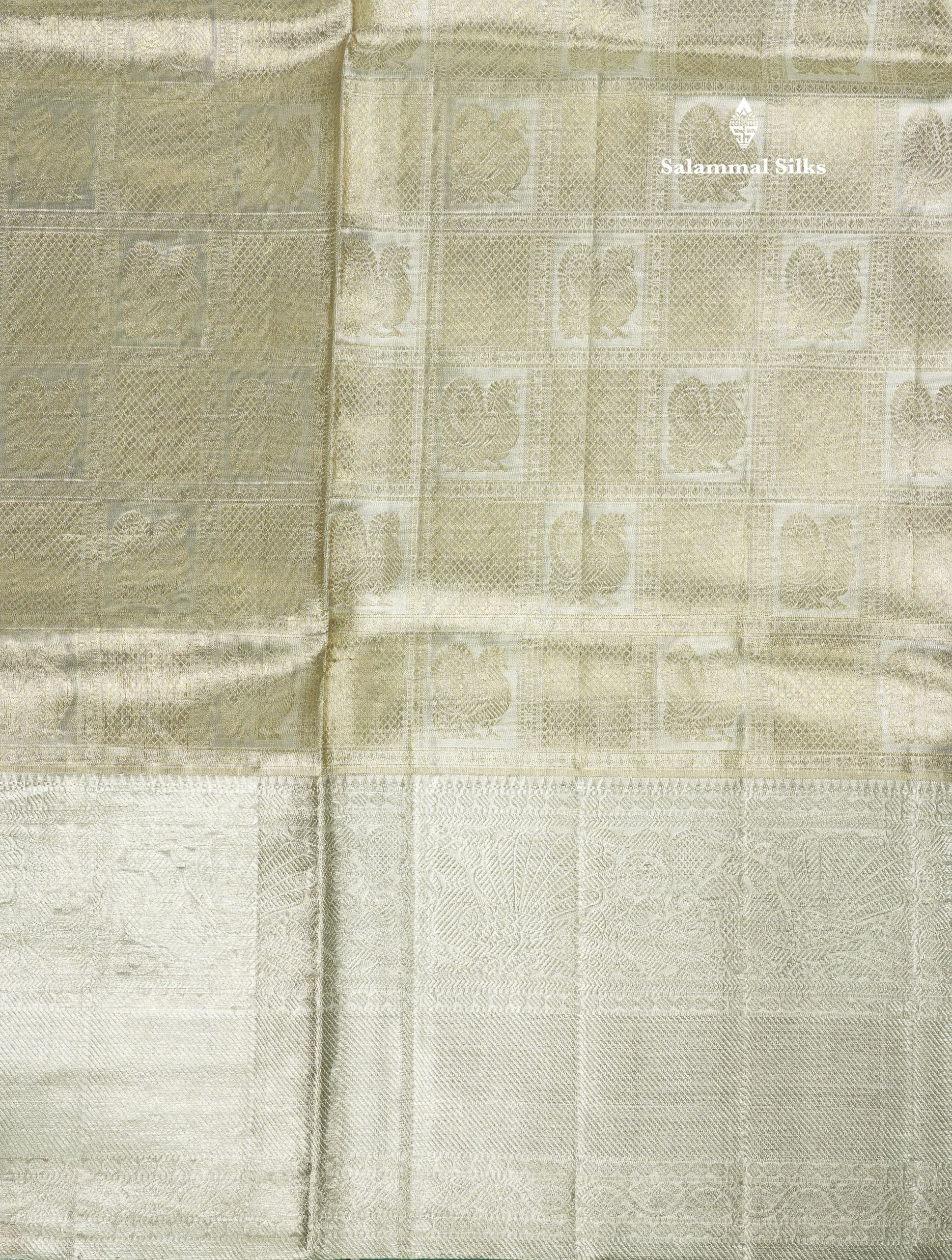 Beautiful Silver Colour Checks With Peacock Butta Tissue Pure Kanjivaram Silk Saree (2G) Zari With Self Border