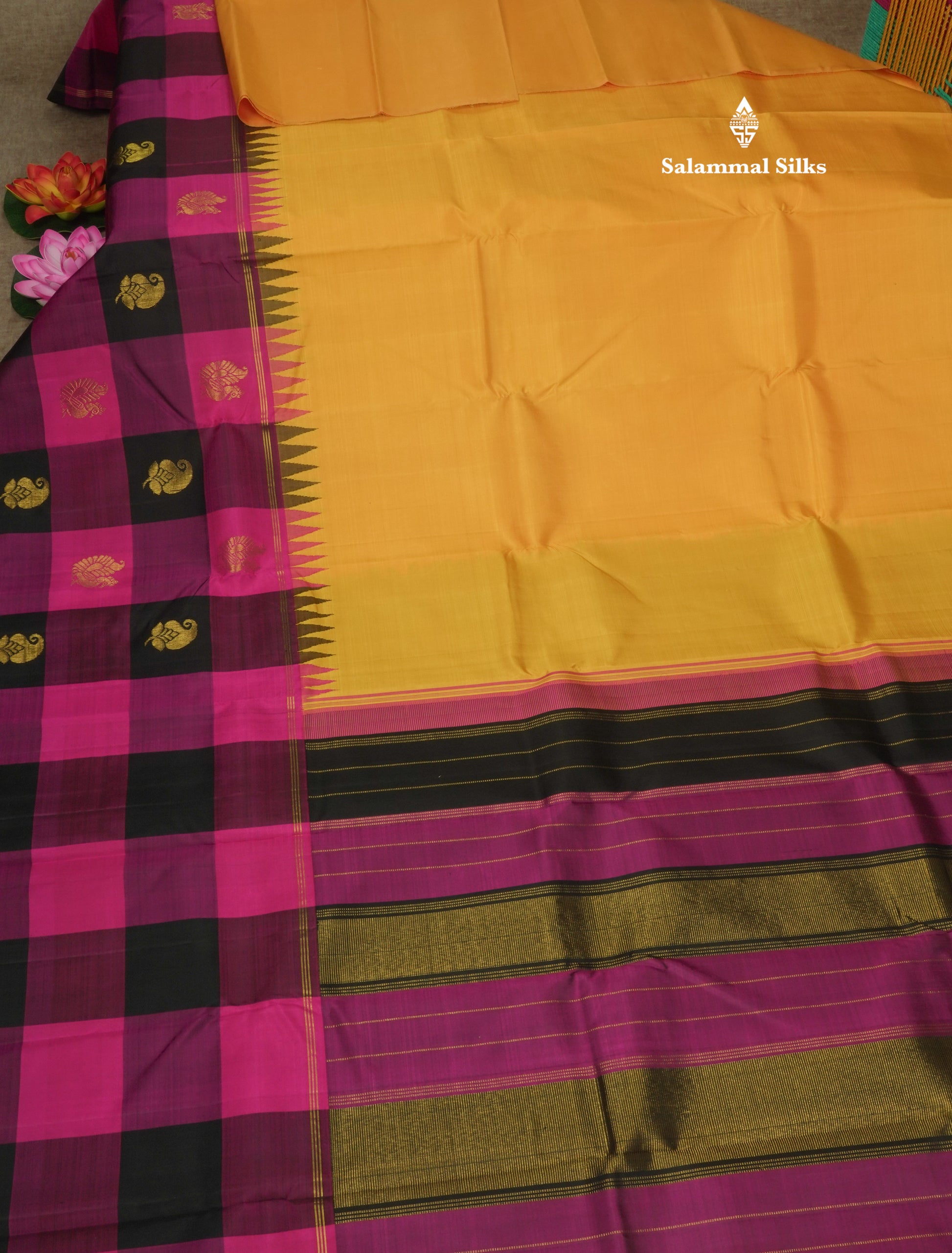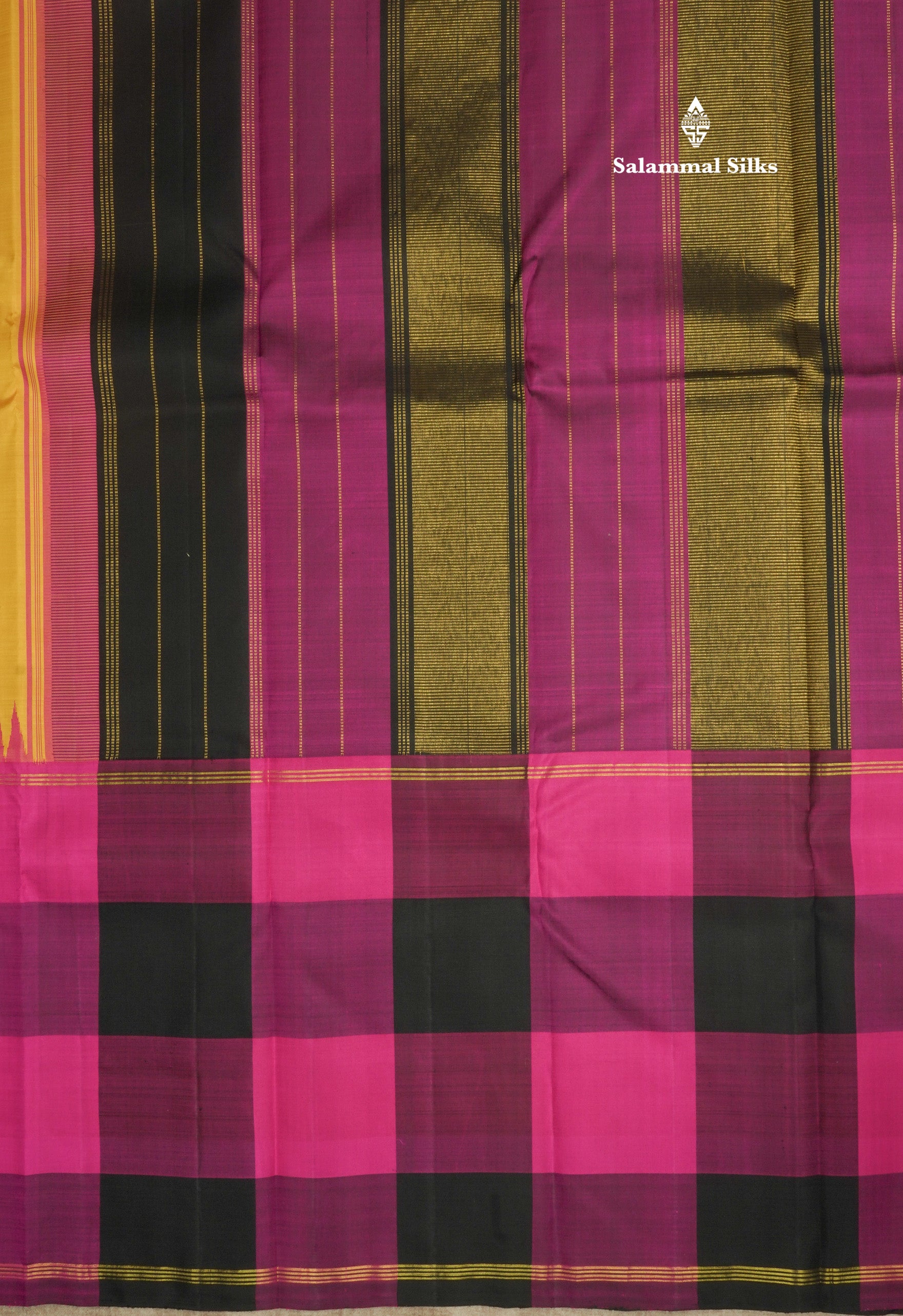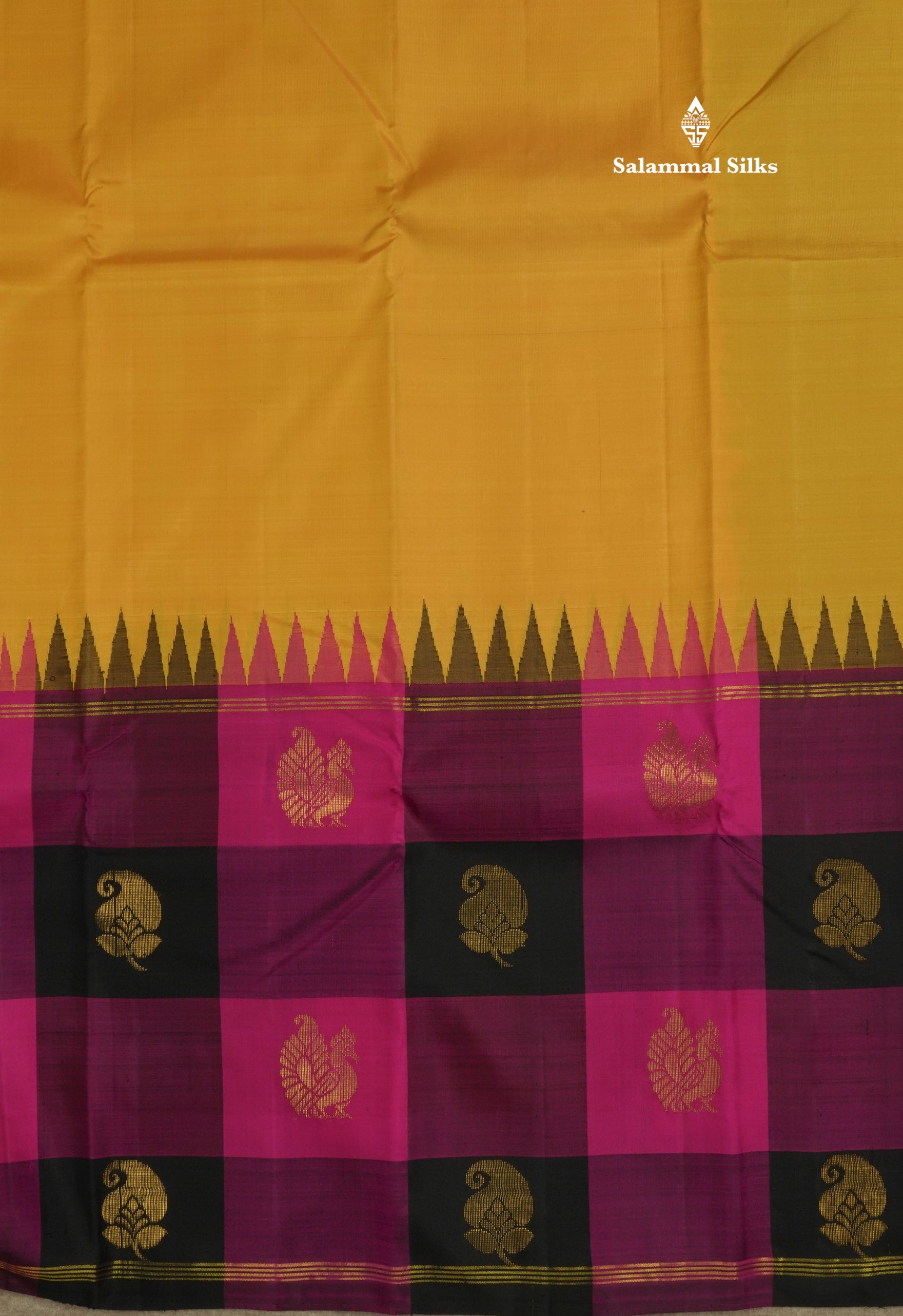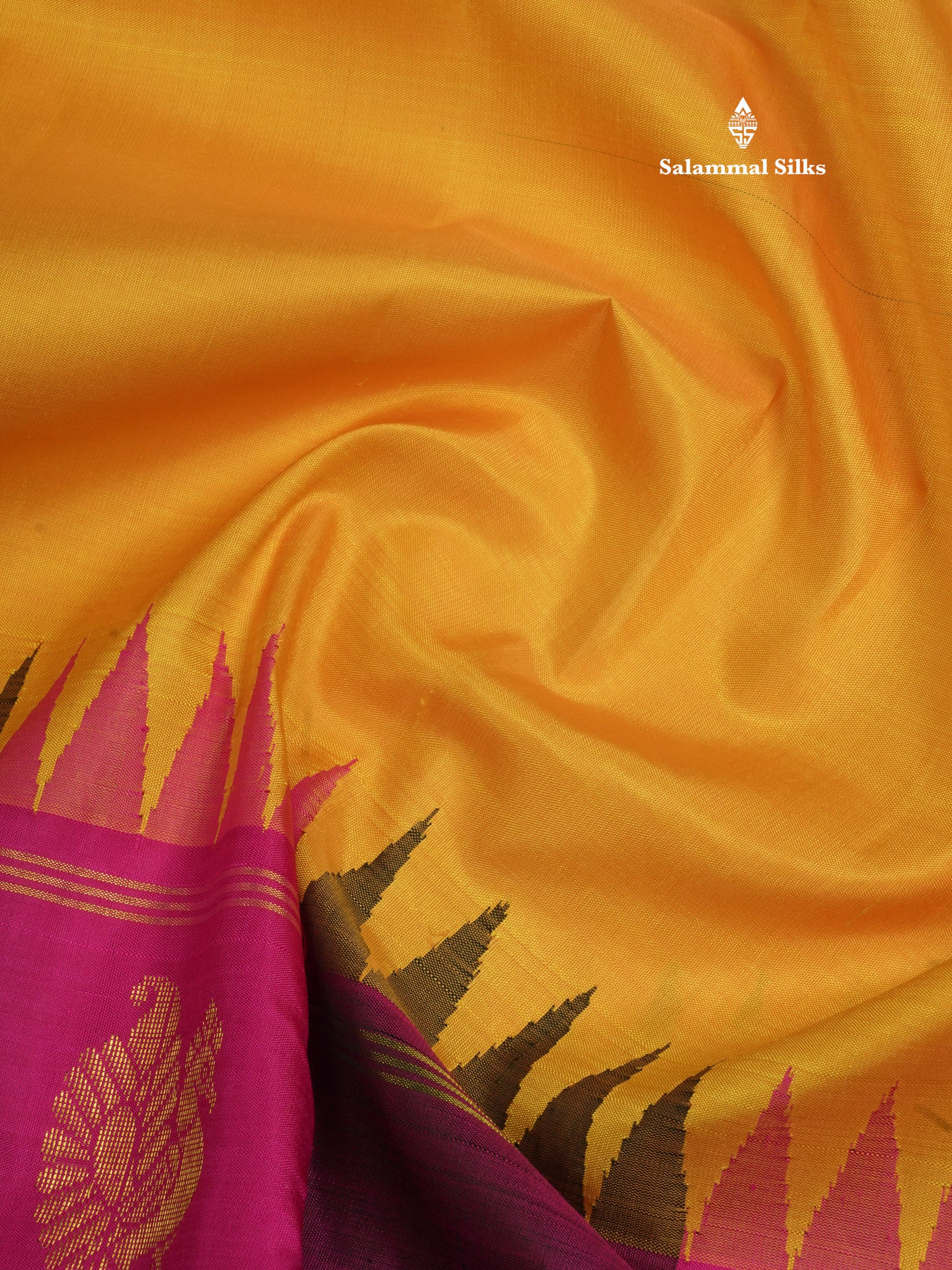 Salammal is known for its handloom sarees. In some sarees, there is cross-weaving between the body and the pallu, which is a sign of pure handloom sarees. This can be seen in Kanchipuram embossed sarees.