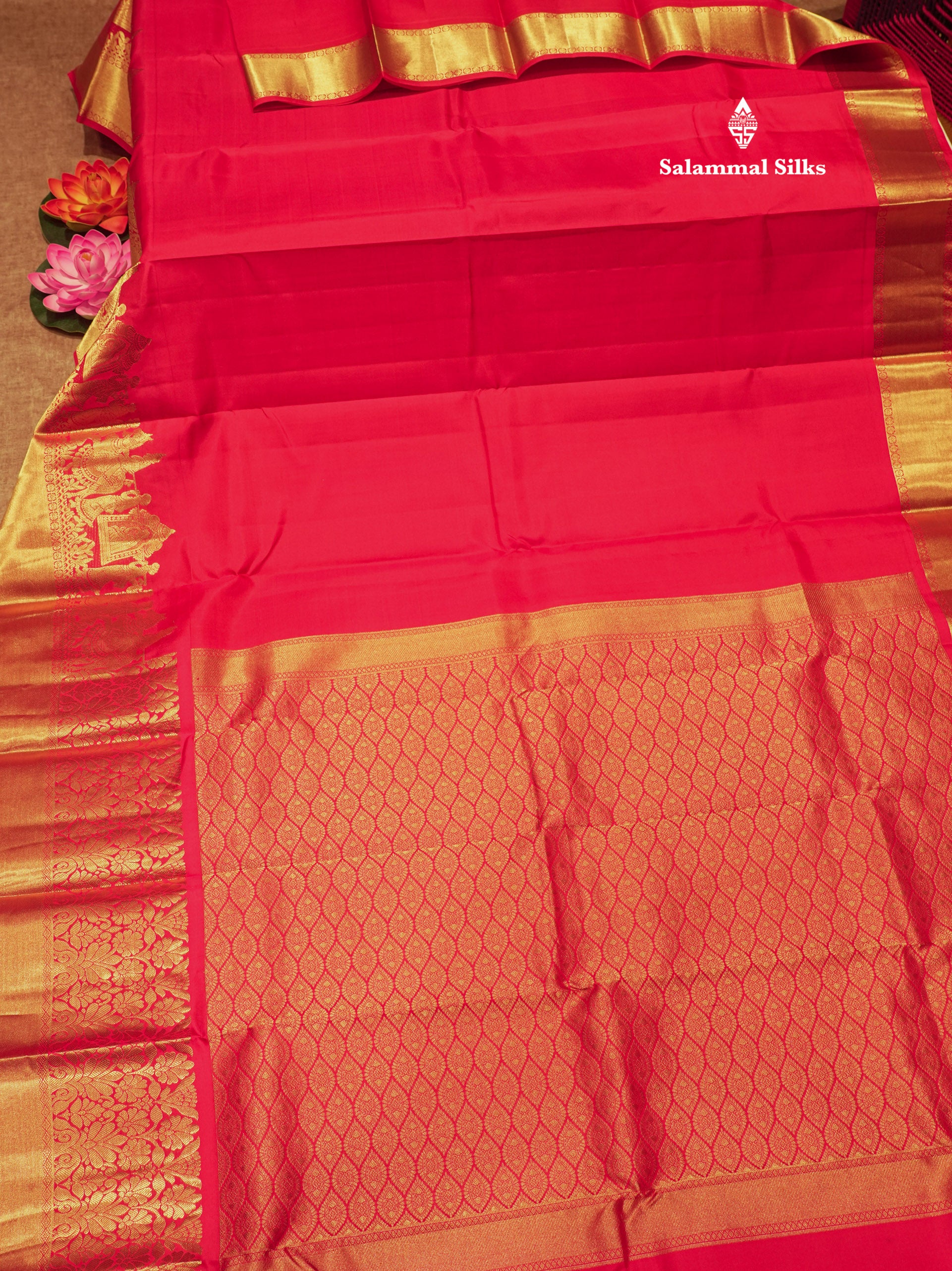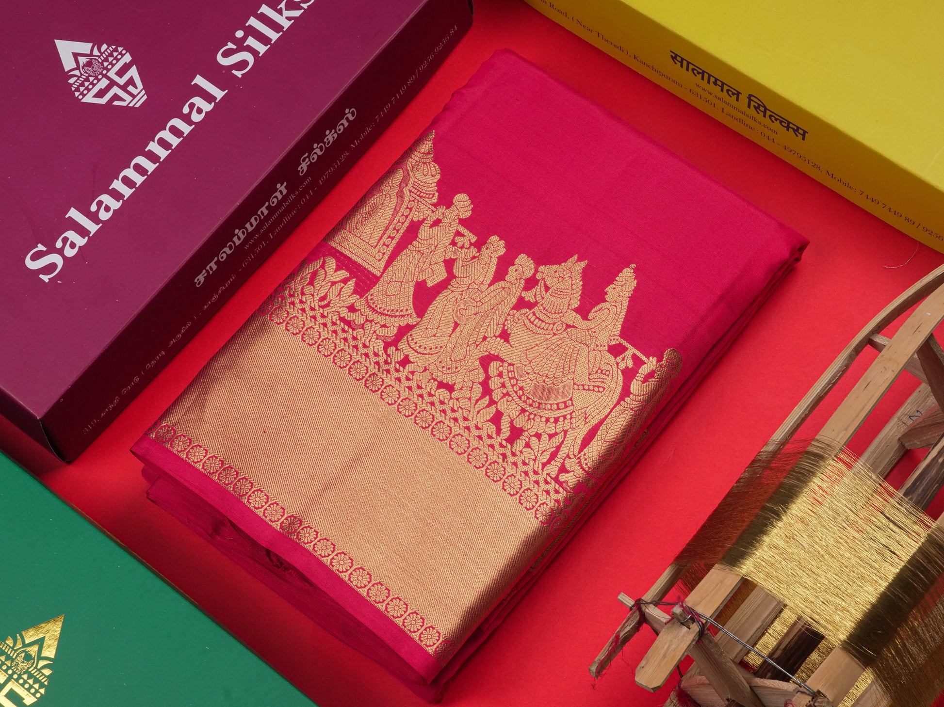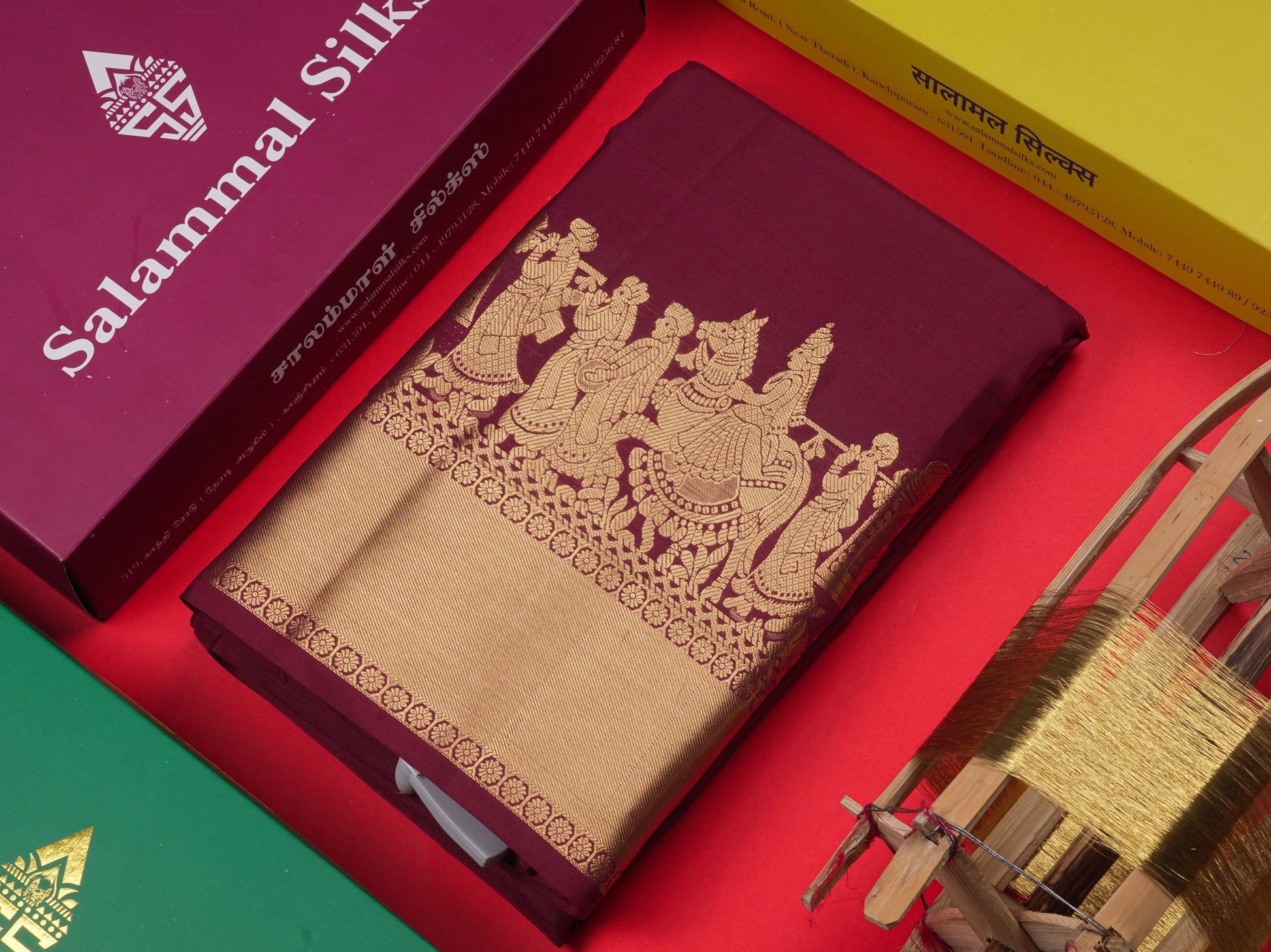 Salammal is known for its handloom sarees. In some sarees, there is cross-weaving between the body and the pallu, which is a sign of pure handloom sarees. This can be seen in Kanchipuram embossed sarees.