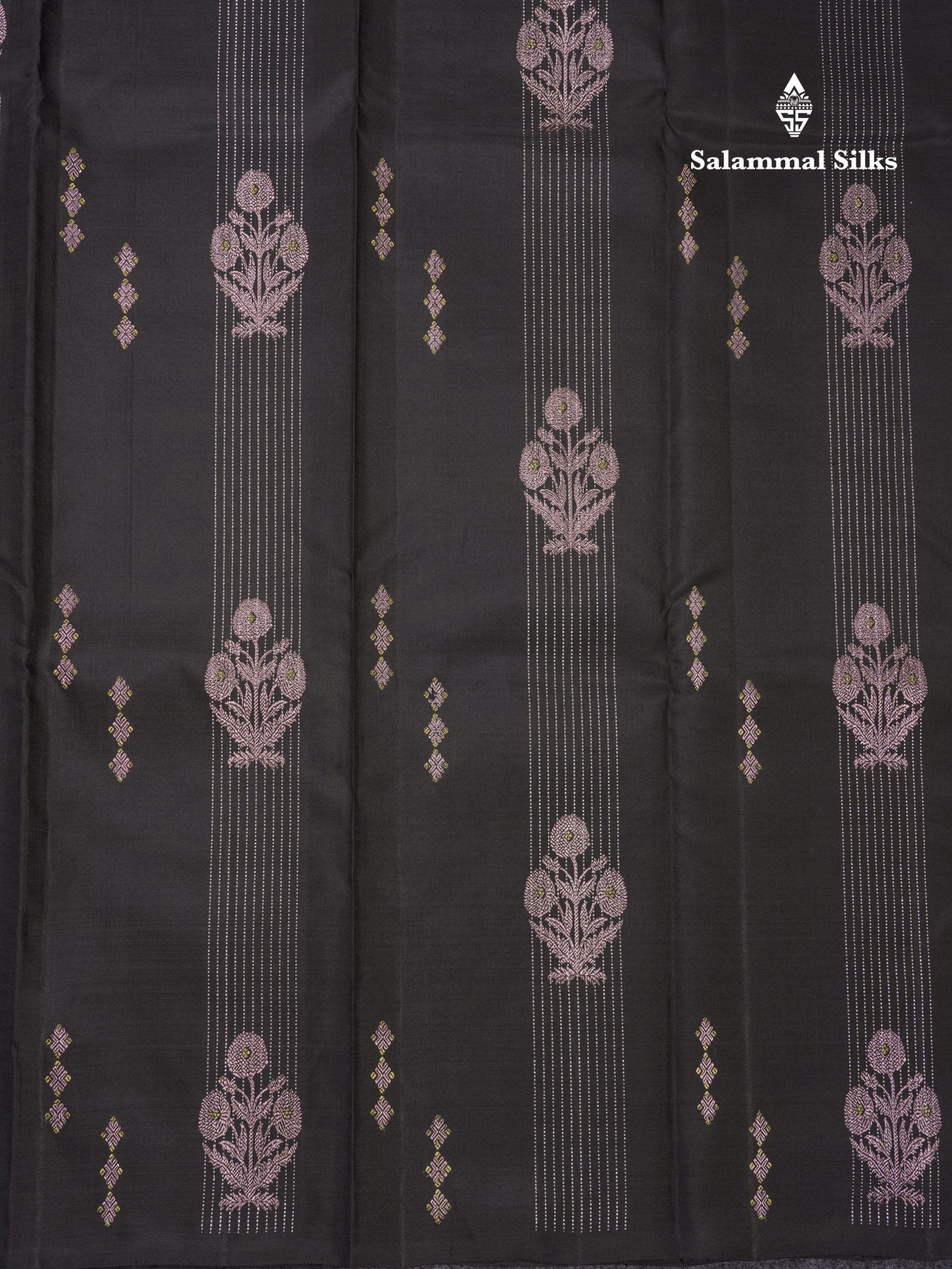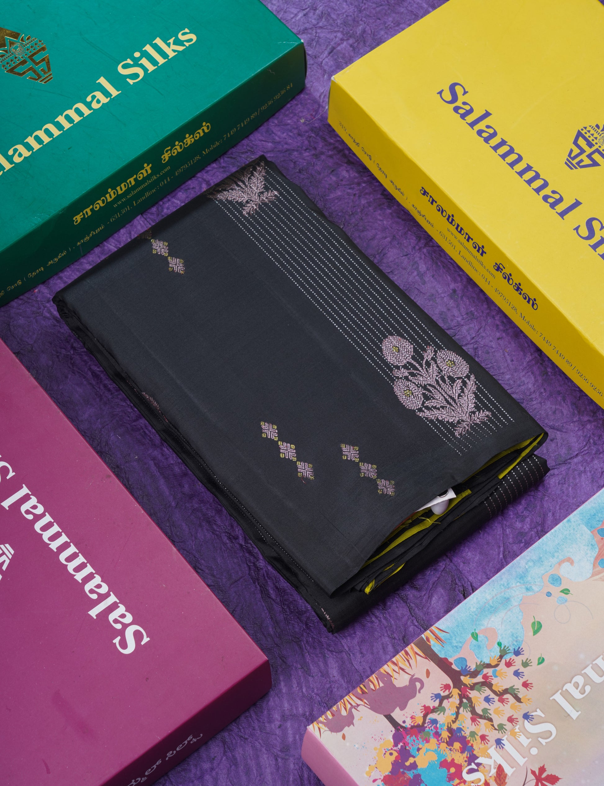 Black Fancy Pure Kanjivaram Silk Saree With Contrast Manthulir Yellow Blouse
