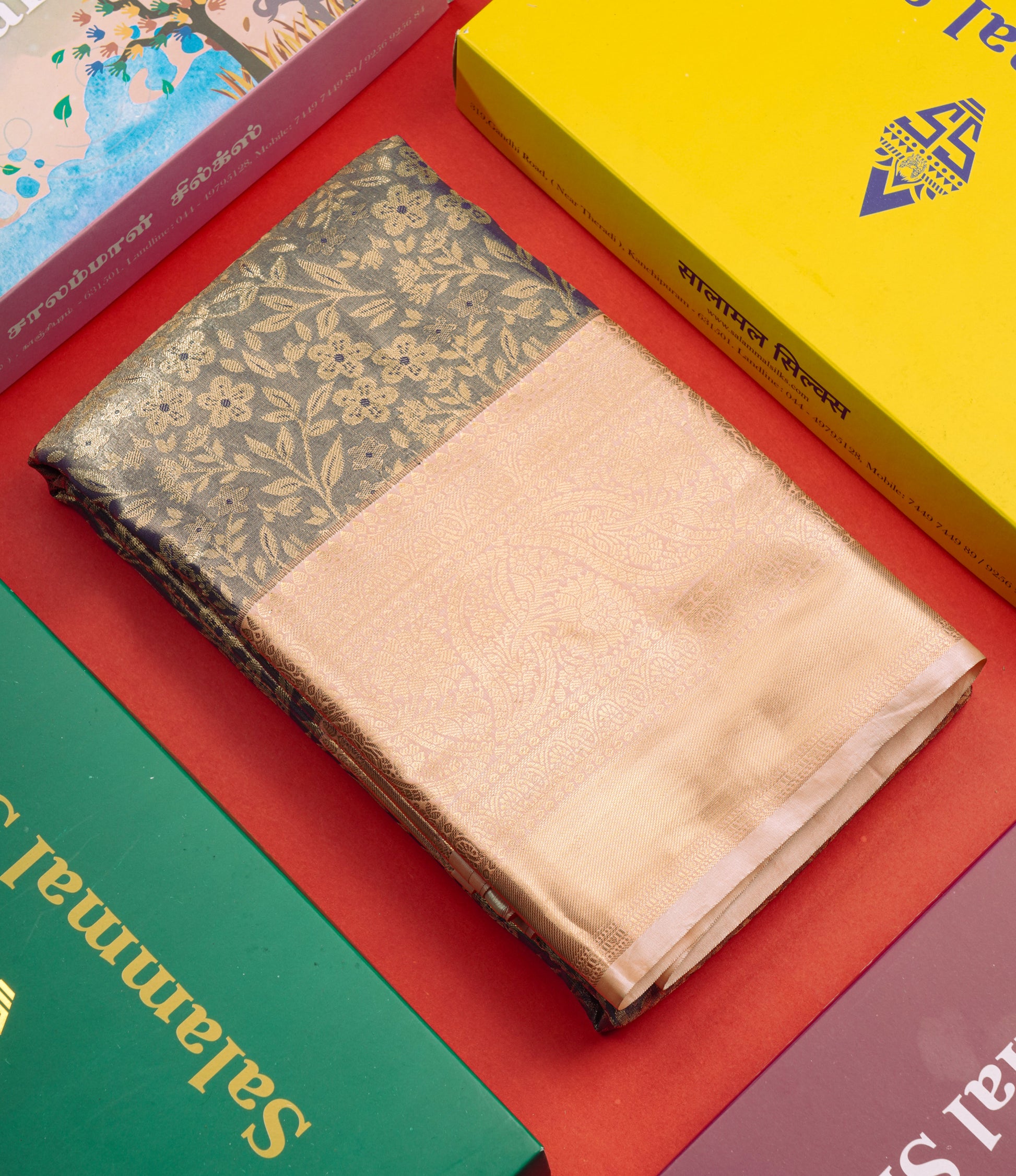Salammal is known for its handloom sarees. In some sarees, there is cross-weaving between the body and the pallu, which is a sign of pure handloom sarees. This can be seen in Kanchipuram embossed sarees.