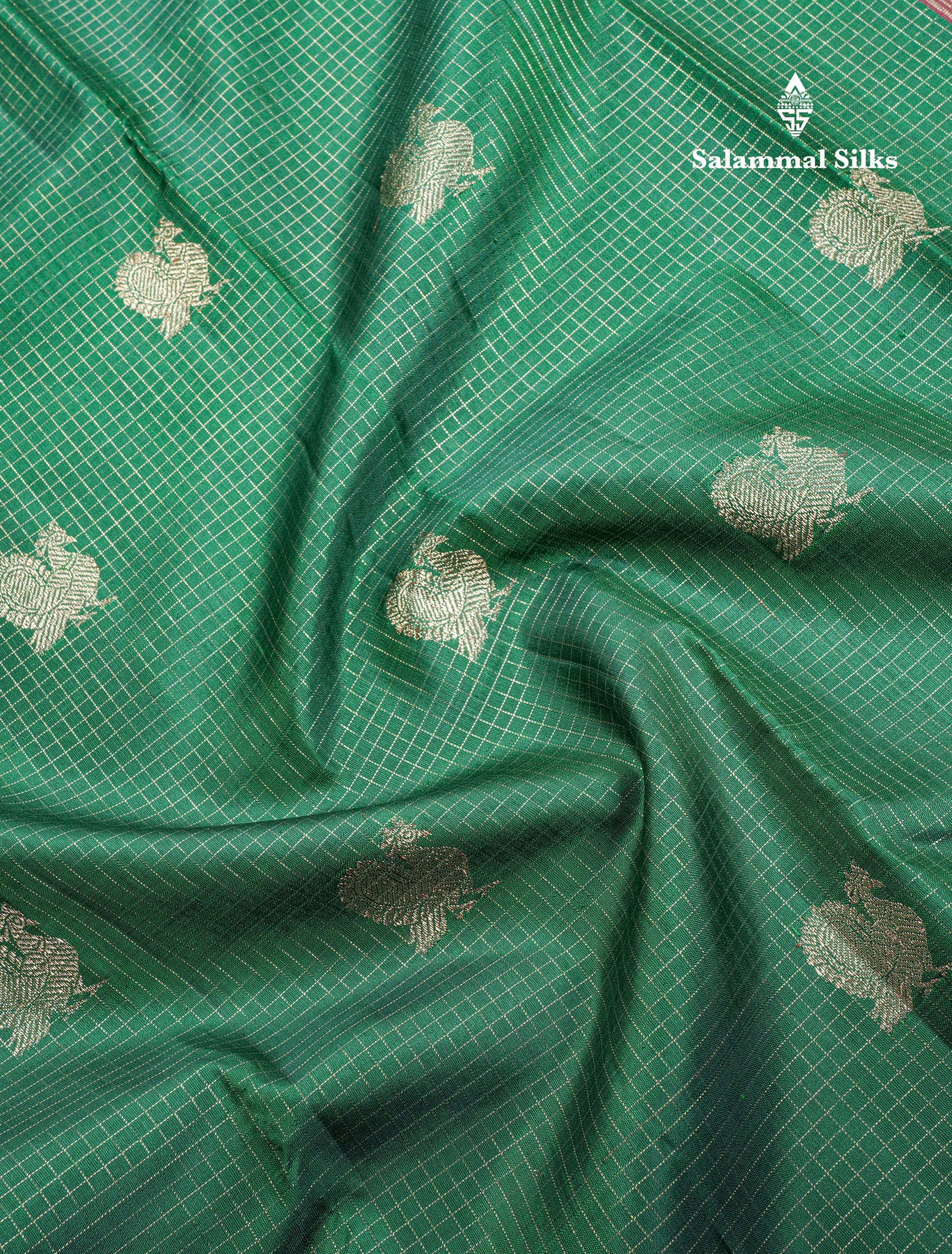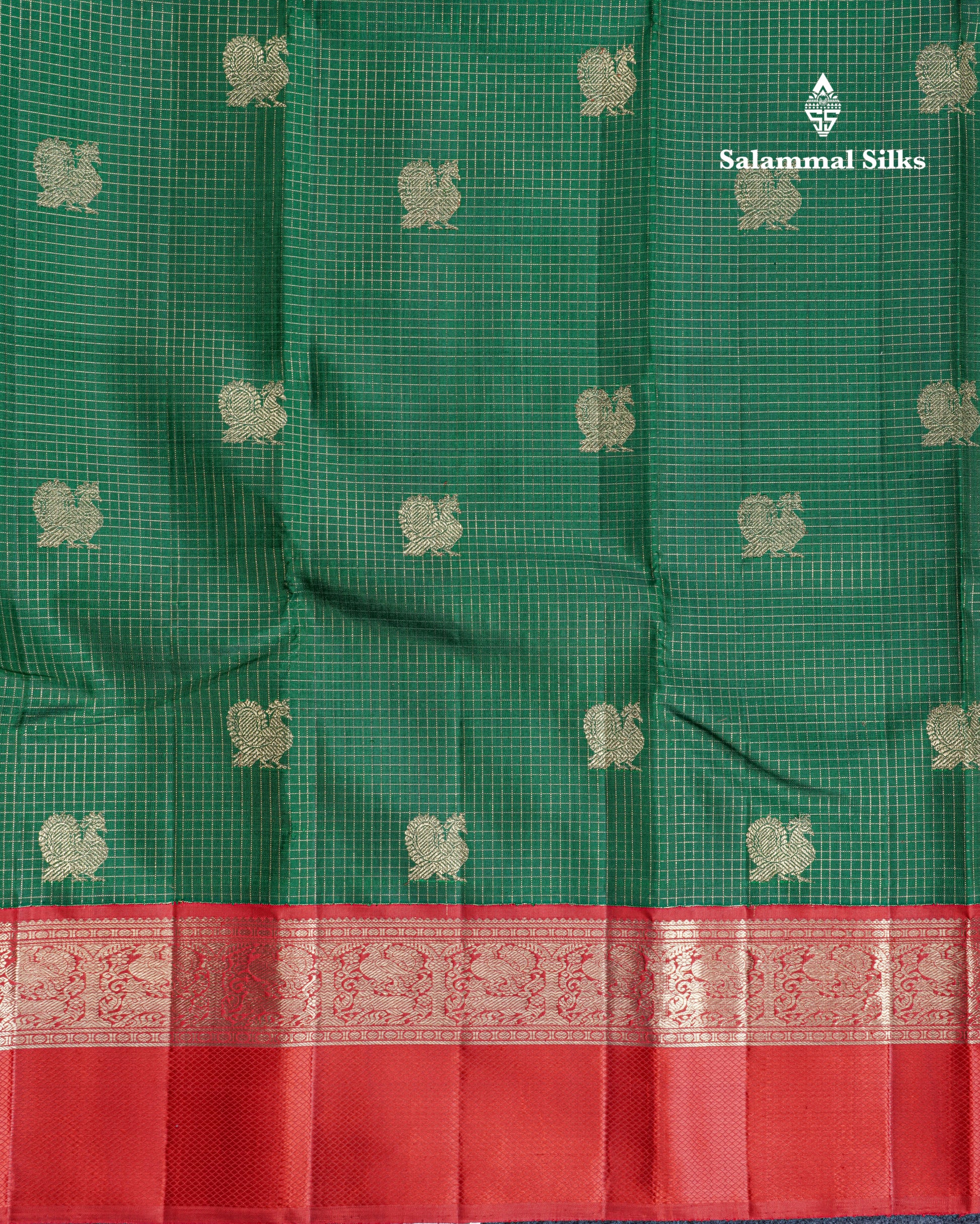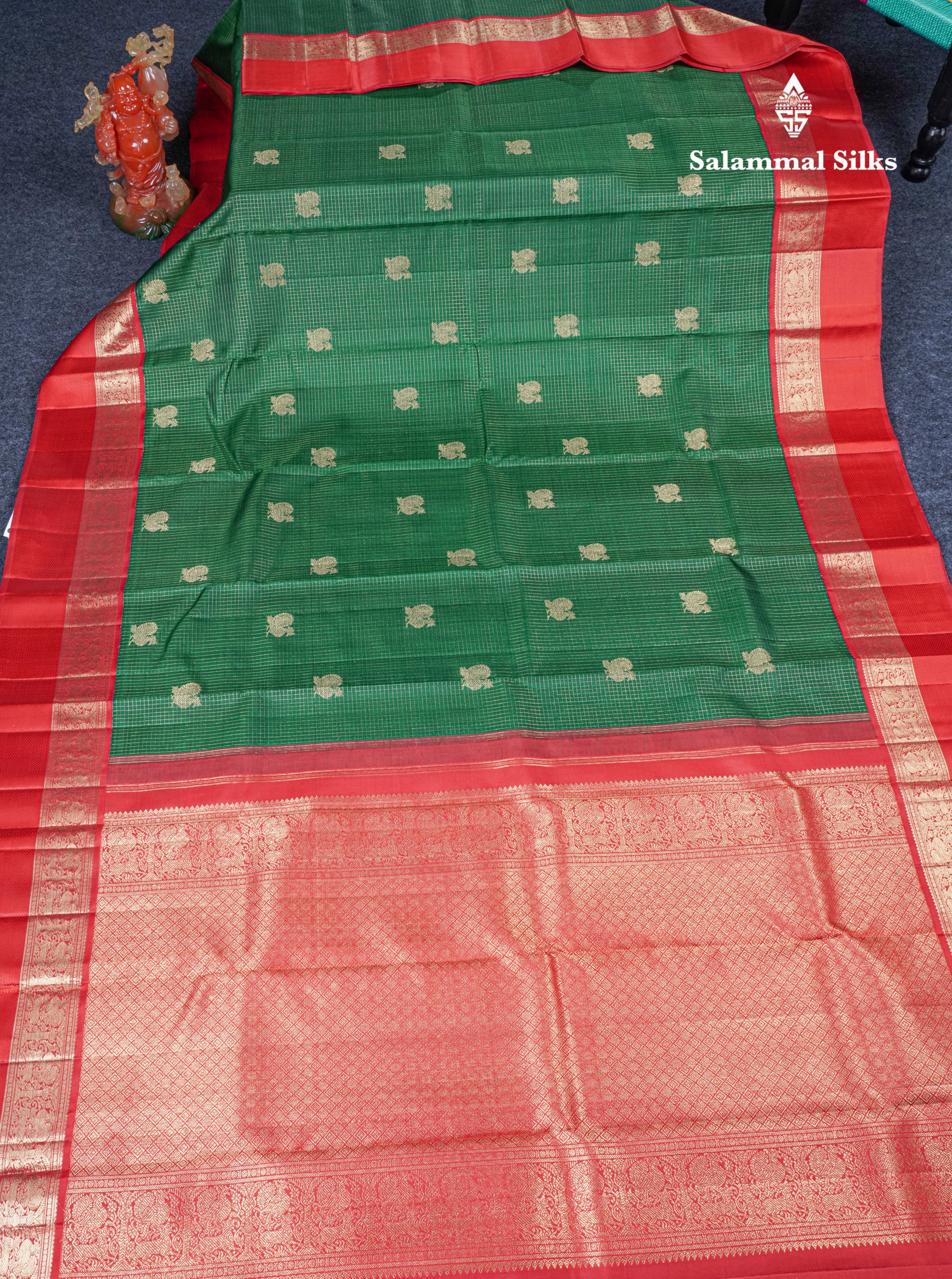 Bottle Green Beautiful Checks And Buttas Pure Kanjivaram Silk Saree Pure Zari with Traditional Red Korvai Border