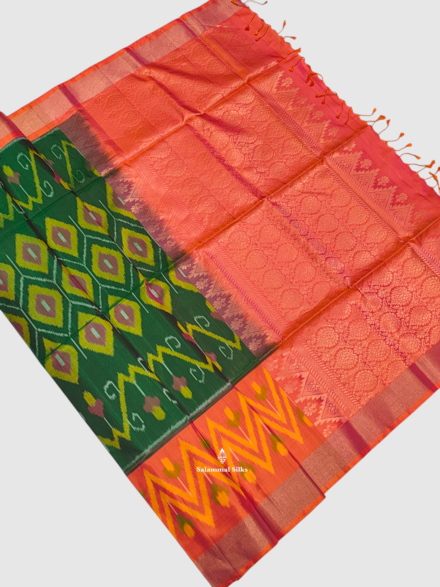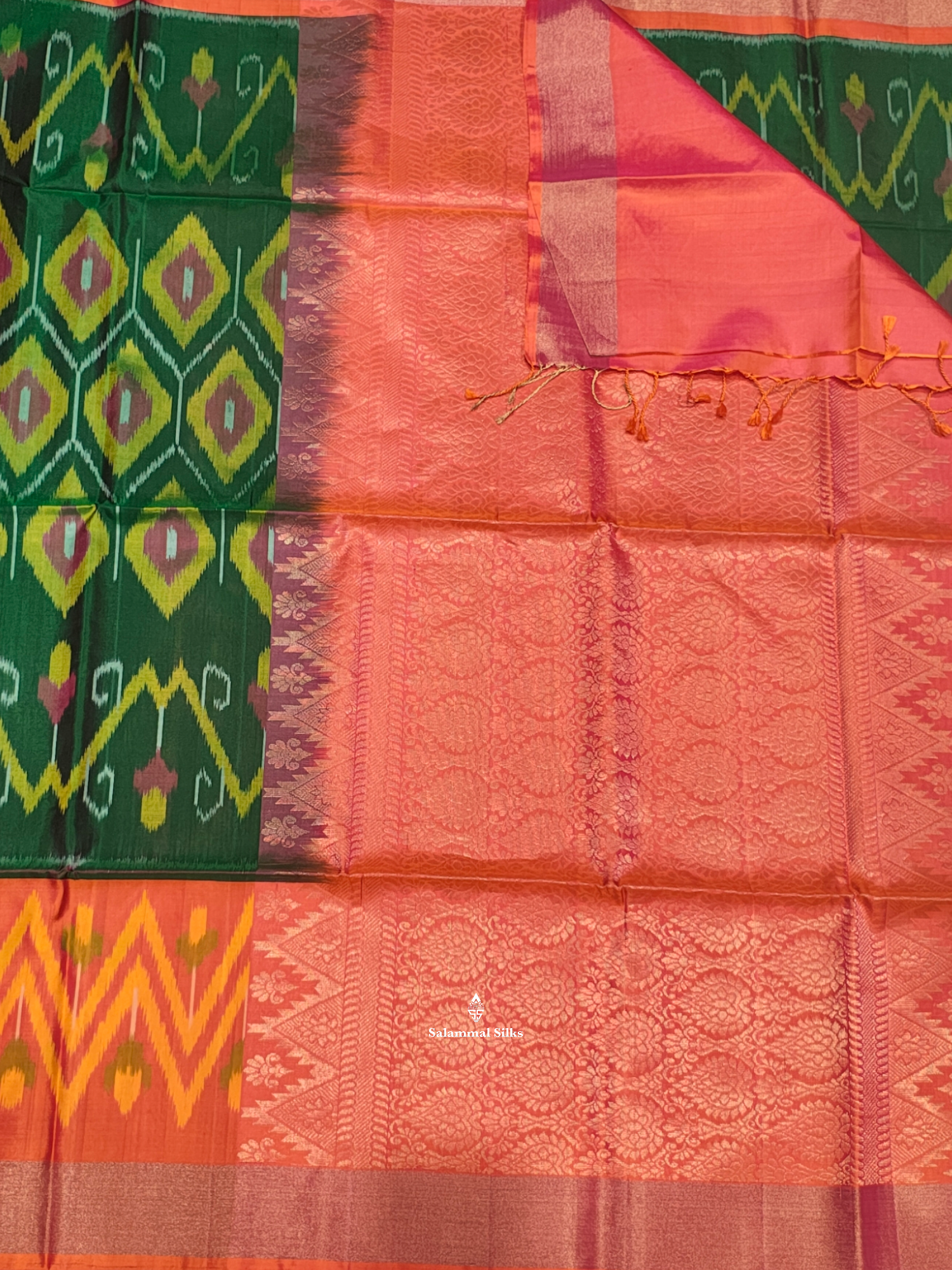 Bottle Green Beautiful Ikkat Fancy Pure Soft Silk Saree With Pinkish Orange Border