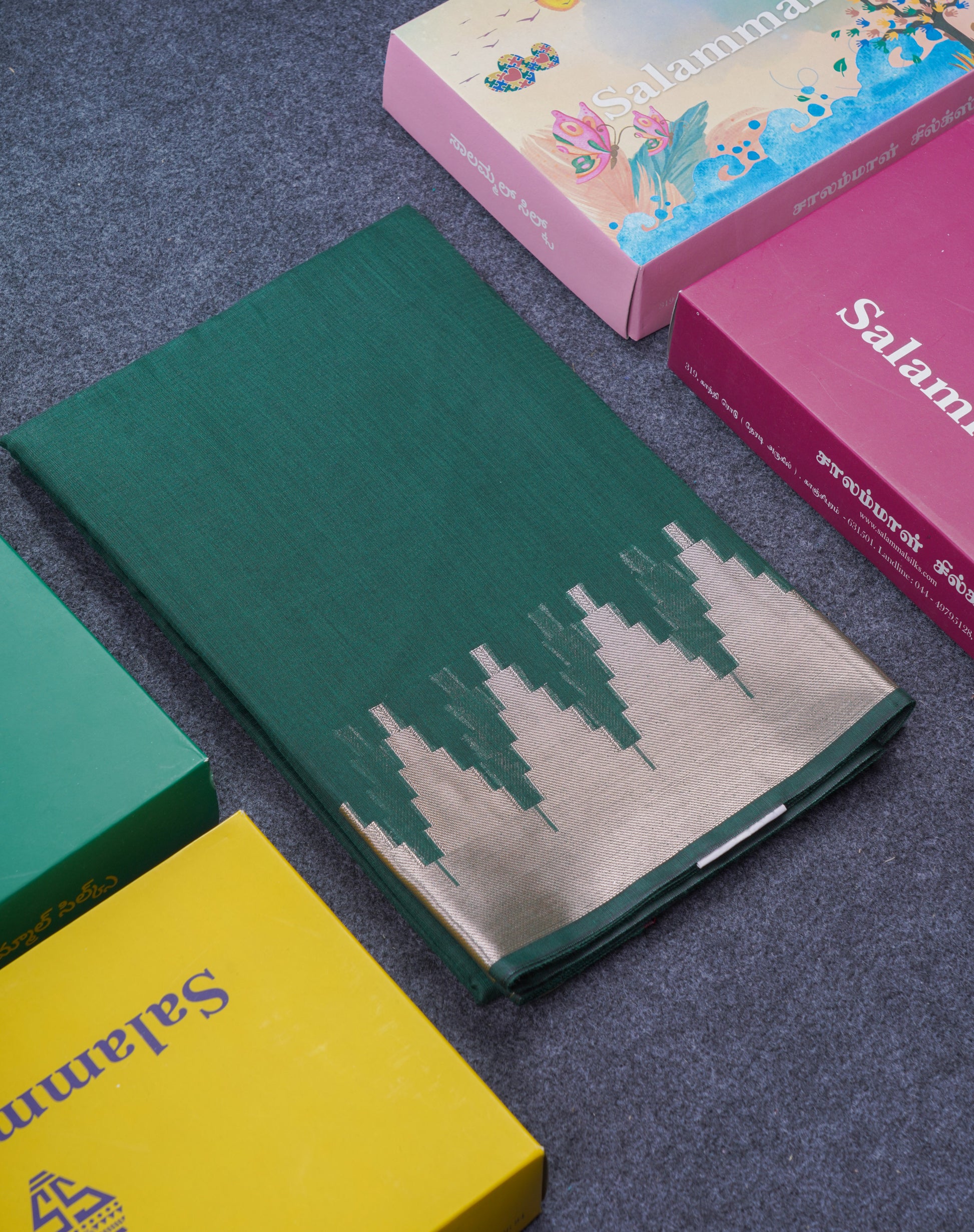 Salammal is known for its handloom sarees. In some sarees, there is cross-weaving between the body and the pallu, which is a sign of pure handloom sarees. This can be seen in Kanchipuram embossed sarees.