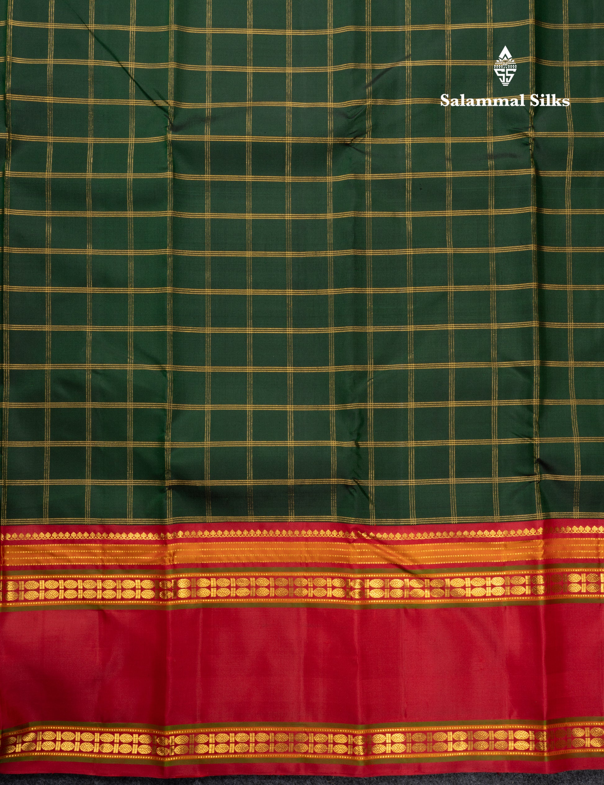 Bottle Green Checks Pure Kanjivaram Silk Saree With Contrast Reddish Pink Gap Border