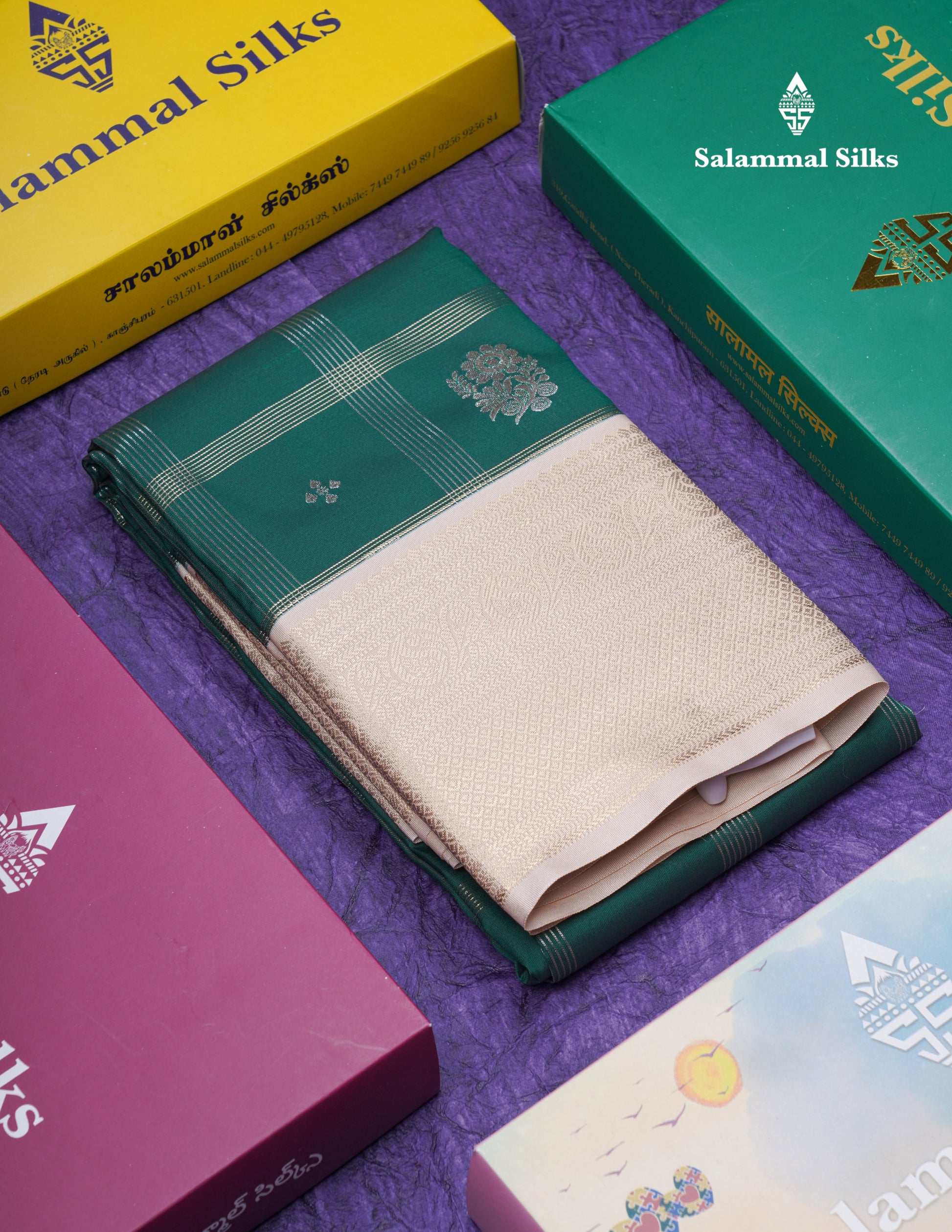 Bottle Green Semi Silk Saree With Contrast Cream Sandal Border