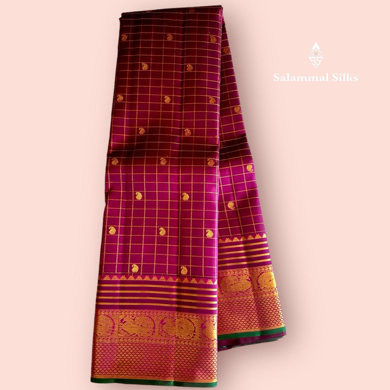 Salammal is known for its handloom sarees. In some sarees, there is cross-weaving between the body and the pallu, which is a sign of pure handloom sarees. This can be seen in Kanchipuram embossed sarees.