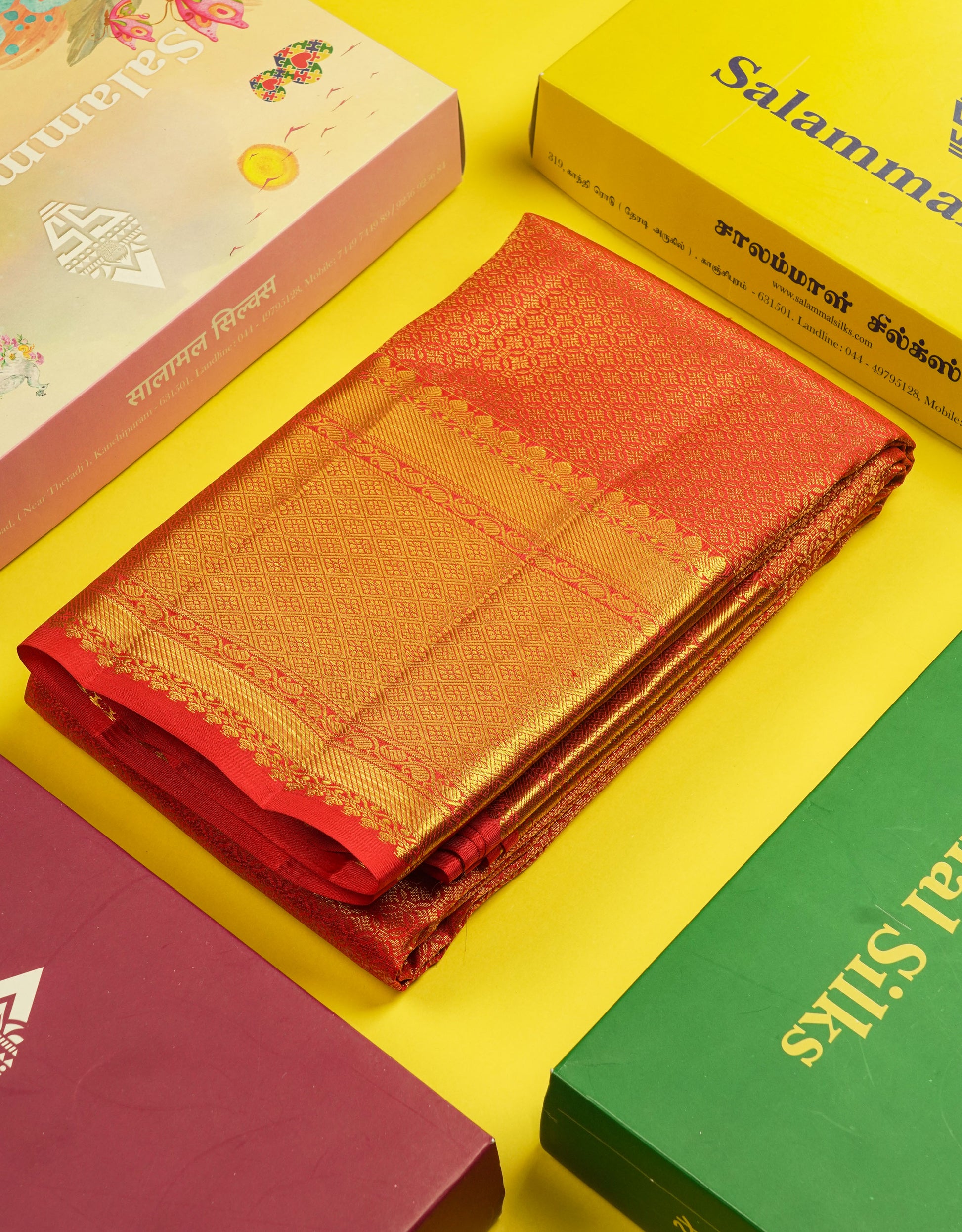 Salammal is known for its handloom sarees. In some sarees, there is cross-weaving between the body and the pallu, which is a sign of pure handloom sarees. This can be seen in Kanchipuram embossed sarees.